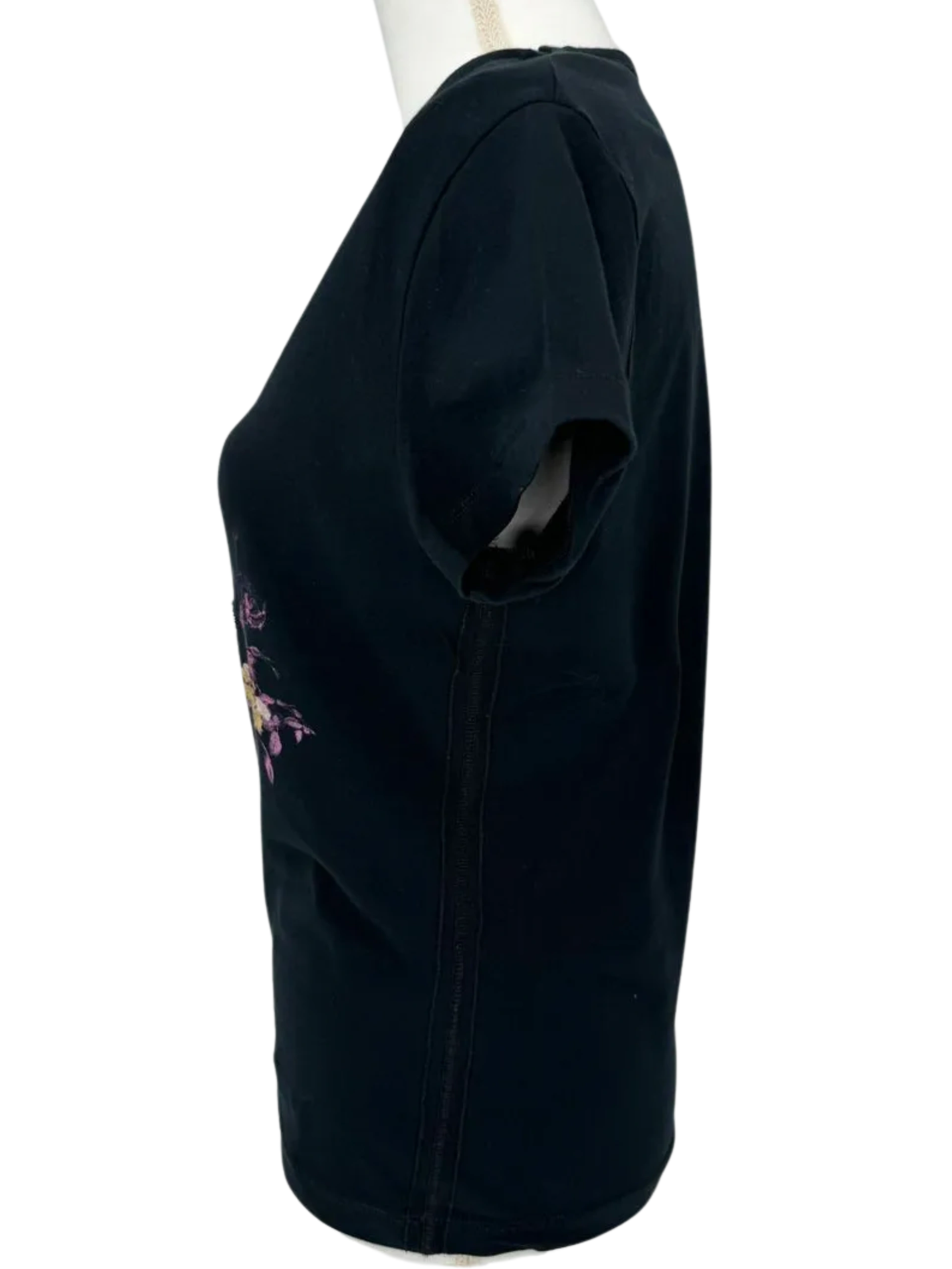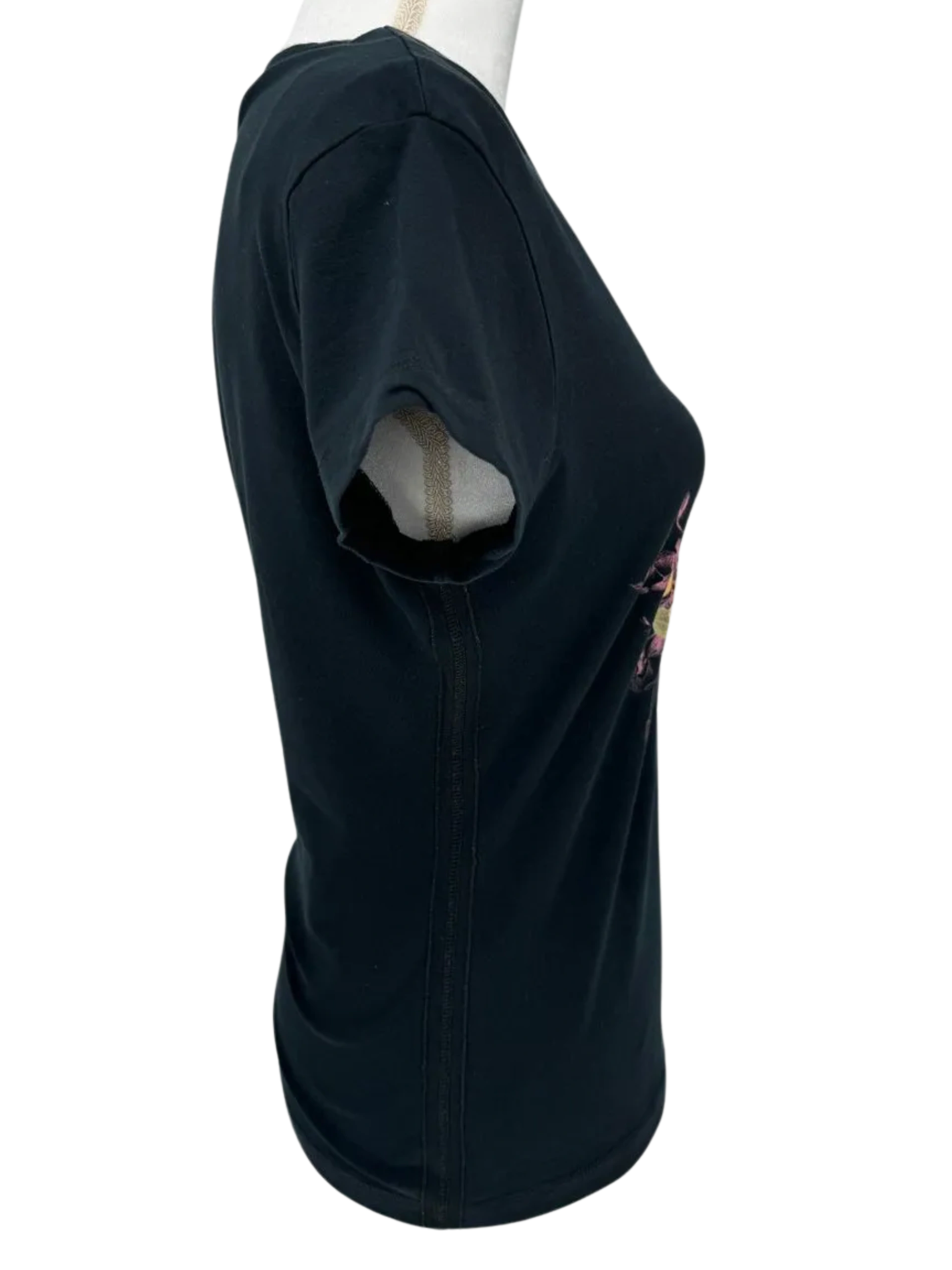 This Black Jean Paul Gaultier T Shirt is classic 00's, in great condition, 90% cotton/10% elastane, Women's Size XL, Brand Tags on inside and one at back below neck. Pink/Purple/Peach Rose motif on front with Black and Purple Beaded lettering spelling out Jean Paul Gaultier. V neck and Cap Sleeves. Measurements: Bust/Chest: 18.5" Waist:16" Front Length (V neck to bottom): 15" Shoulder:16" Back Length:23" Sleeve Length:4.75" Hip: 17"