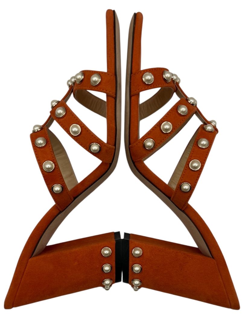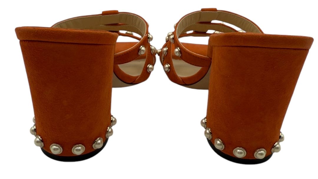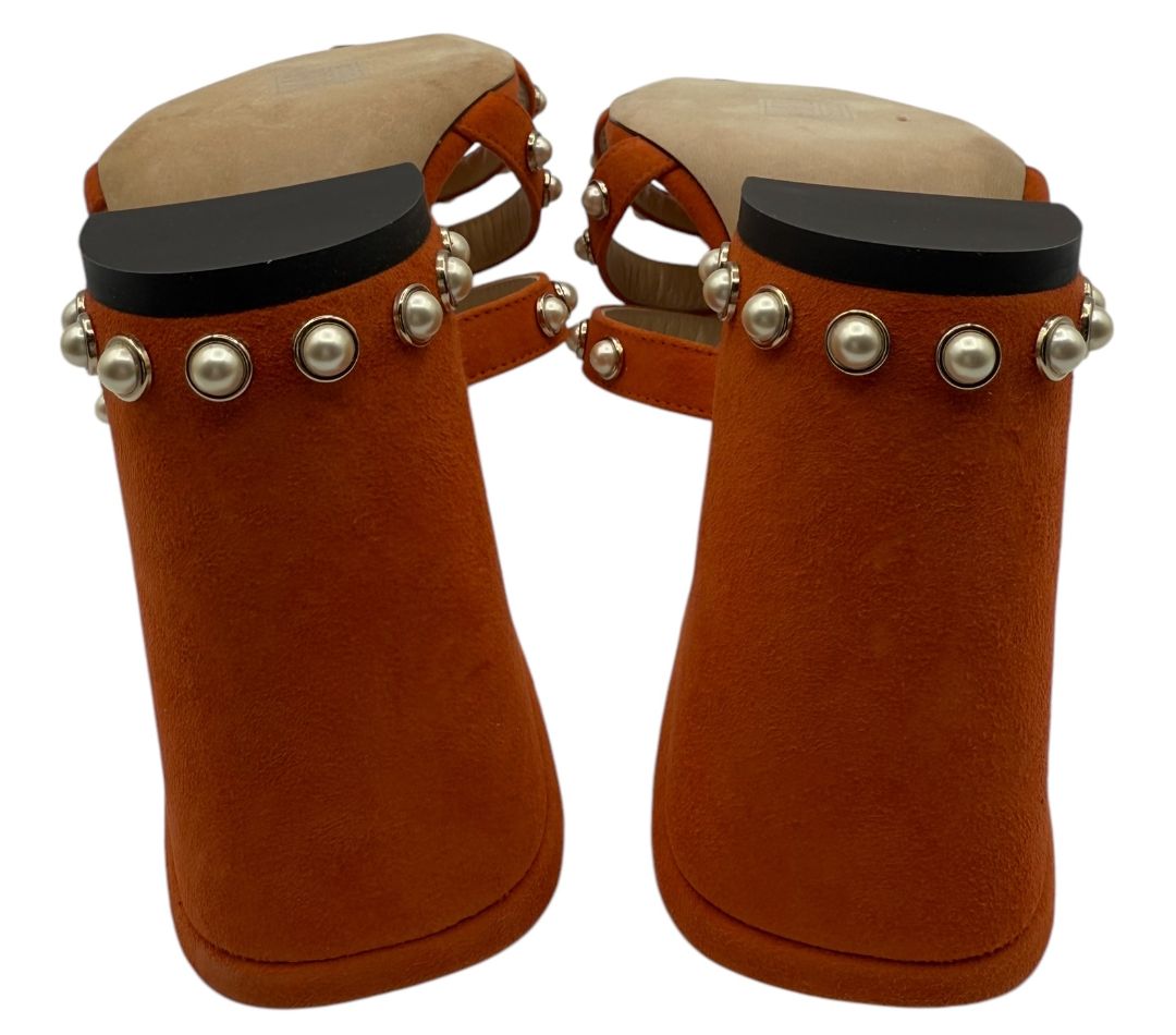 These block heel leather sandals are dotted with luminous faux-pearls along the straps and heel.