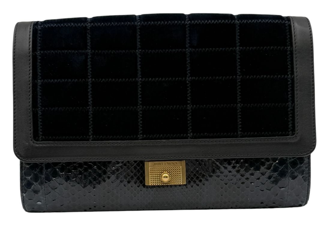 Refined and richly textured, this Jimmy Choo shoulder bag is a luxe statement piece crafted from a striking mix of quilted velvet, glossy snakeskin, and smooth leather. The flap front features tonal velvet stitched in a grid pattern and secures with a gold-tone push-lock clasp engraved with the Jimmy Choo logo. A structured leather and chain strap adds a modern edge and can be carried over the shoulder or in hand.