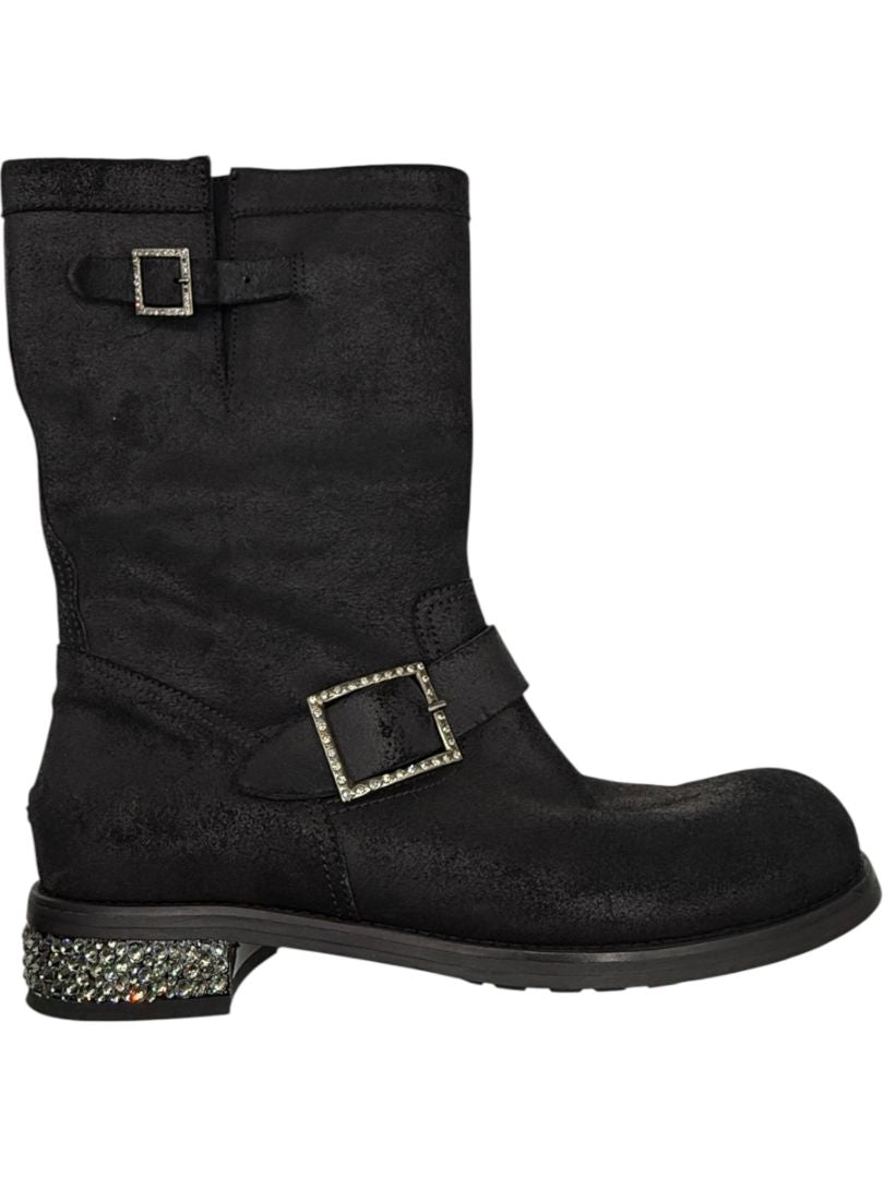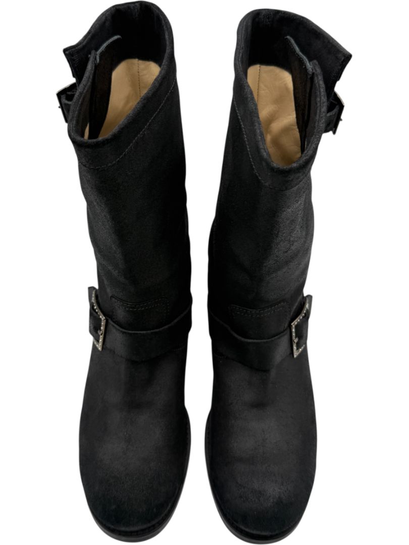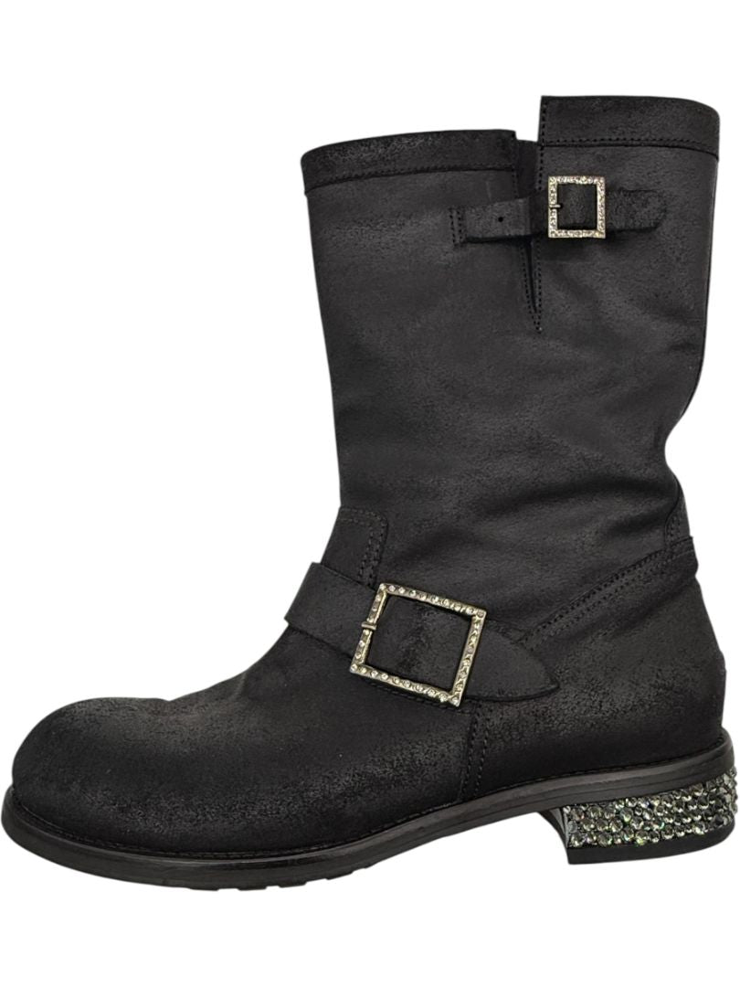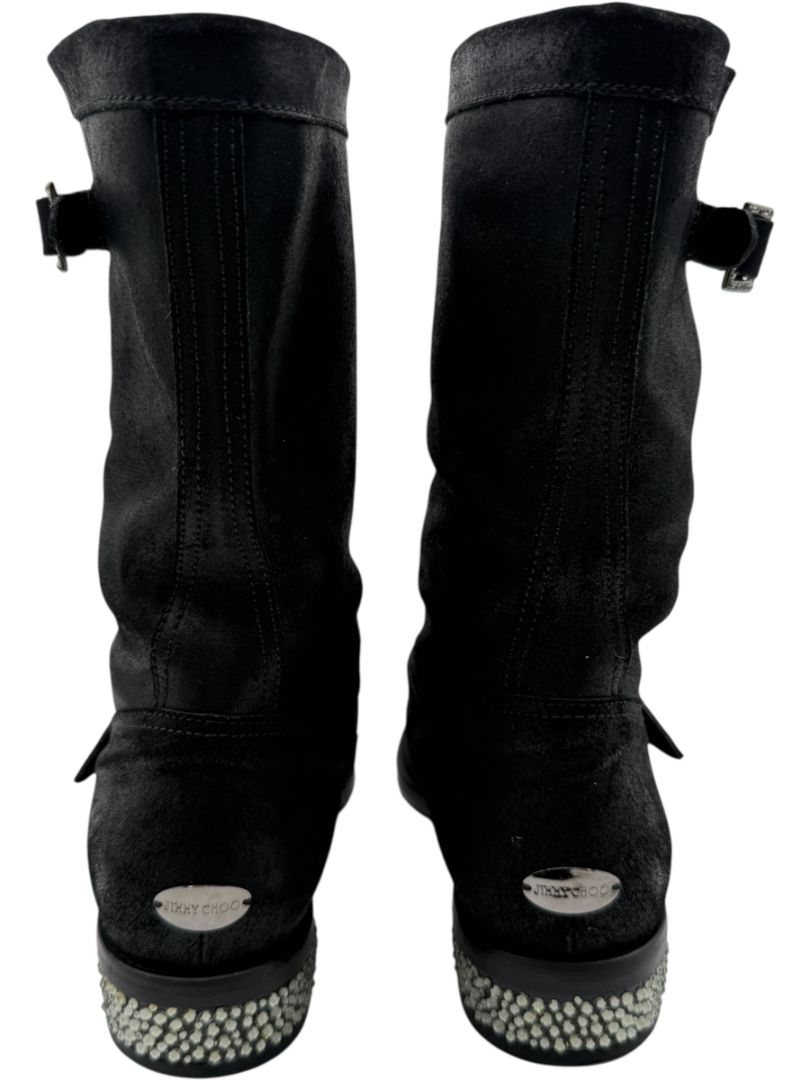 Jimmy Choo Black Suede Buckle Boots with Crystal Heels – Size 39.5