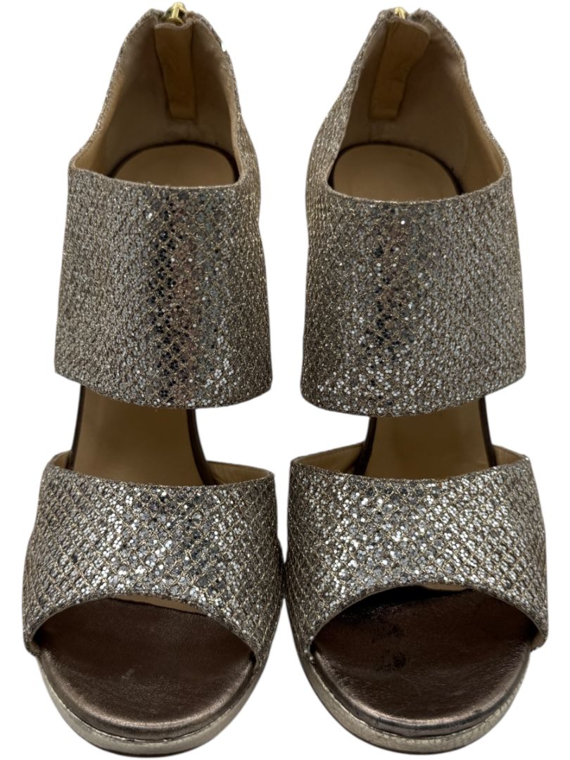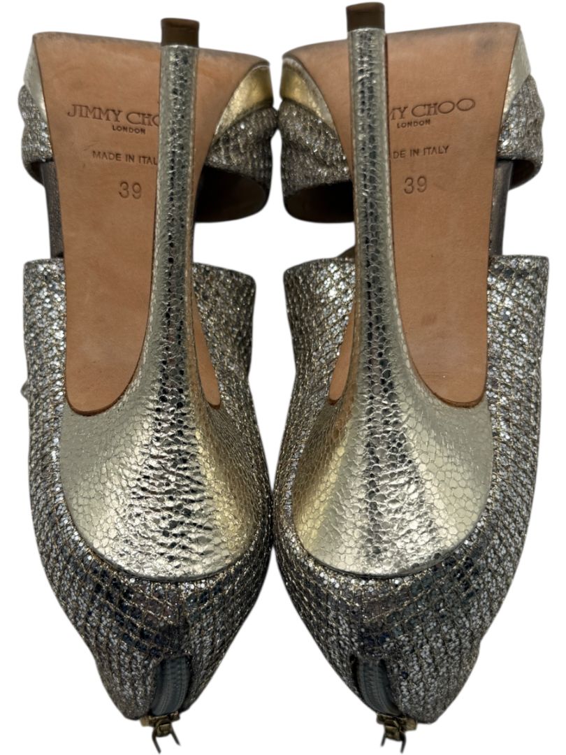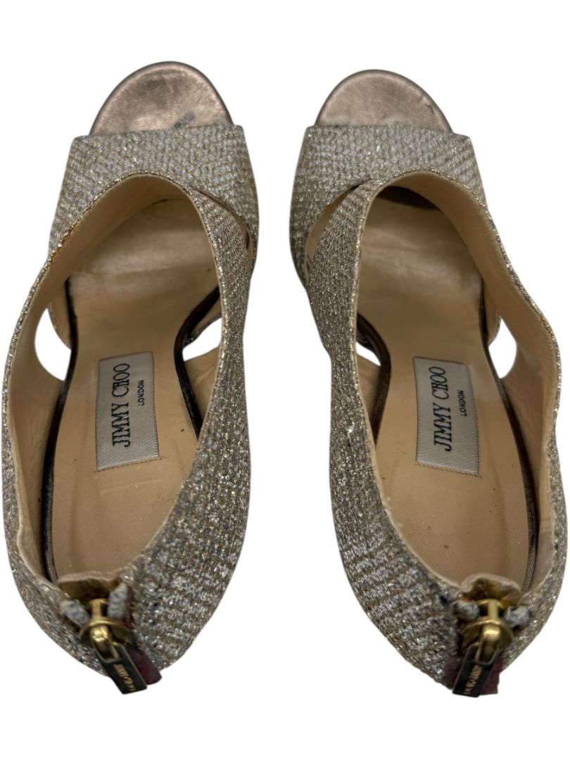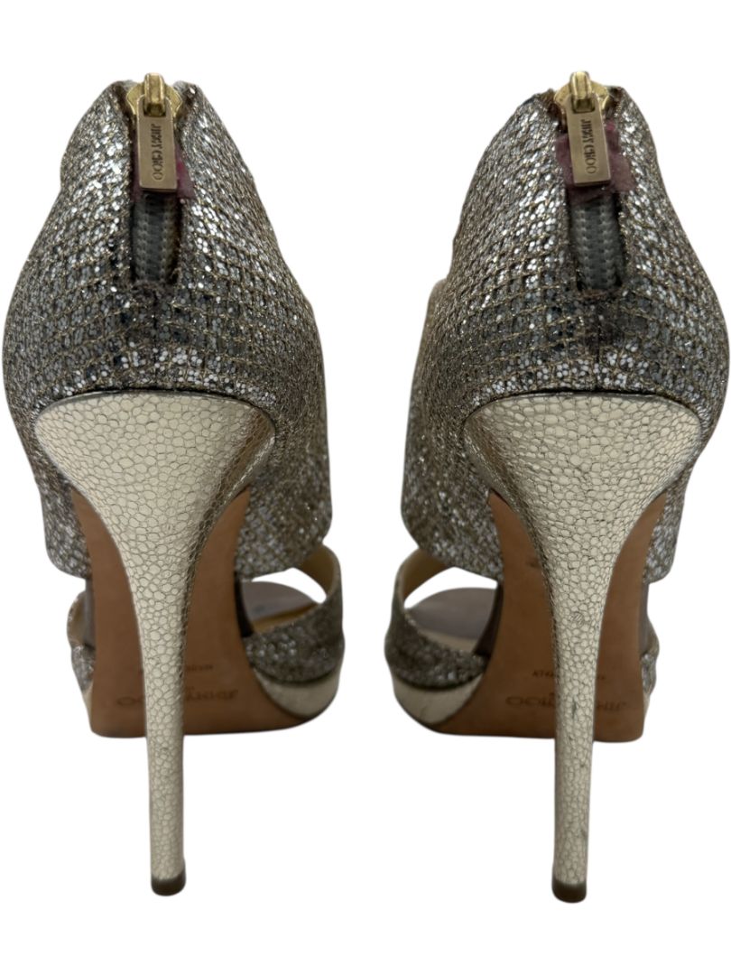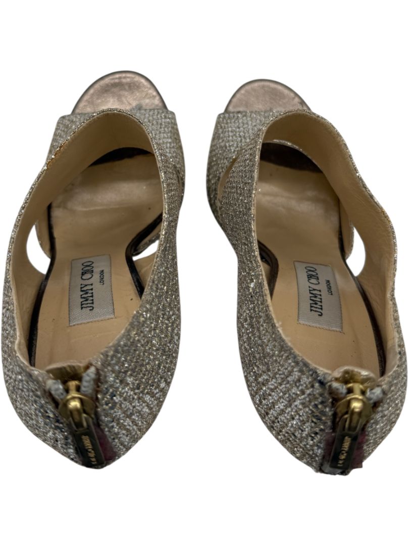 These dazzling Jimmy Choo peep-toe heels bring glamour to new heights with a shimmering silver-gold glitter overlay, textured metallic leather heel counter, and a supportive platform sole. Designed with wide crossover bands and a back-zip closure, they combine statement style with a secure fit—perfect for dancing the night away or making an entrance at your next formal affair.