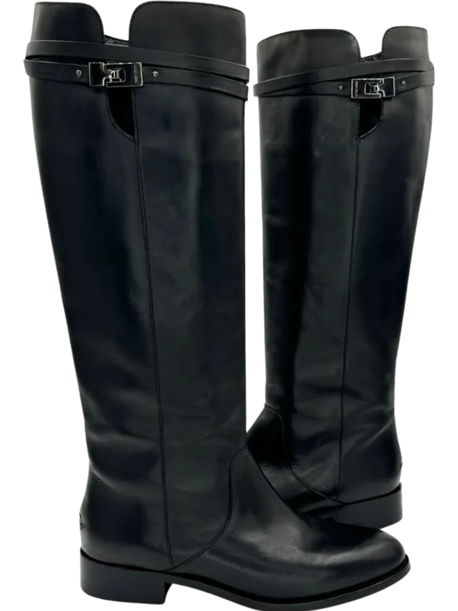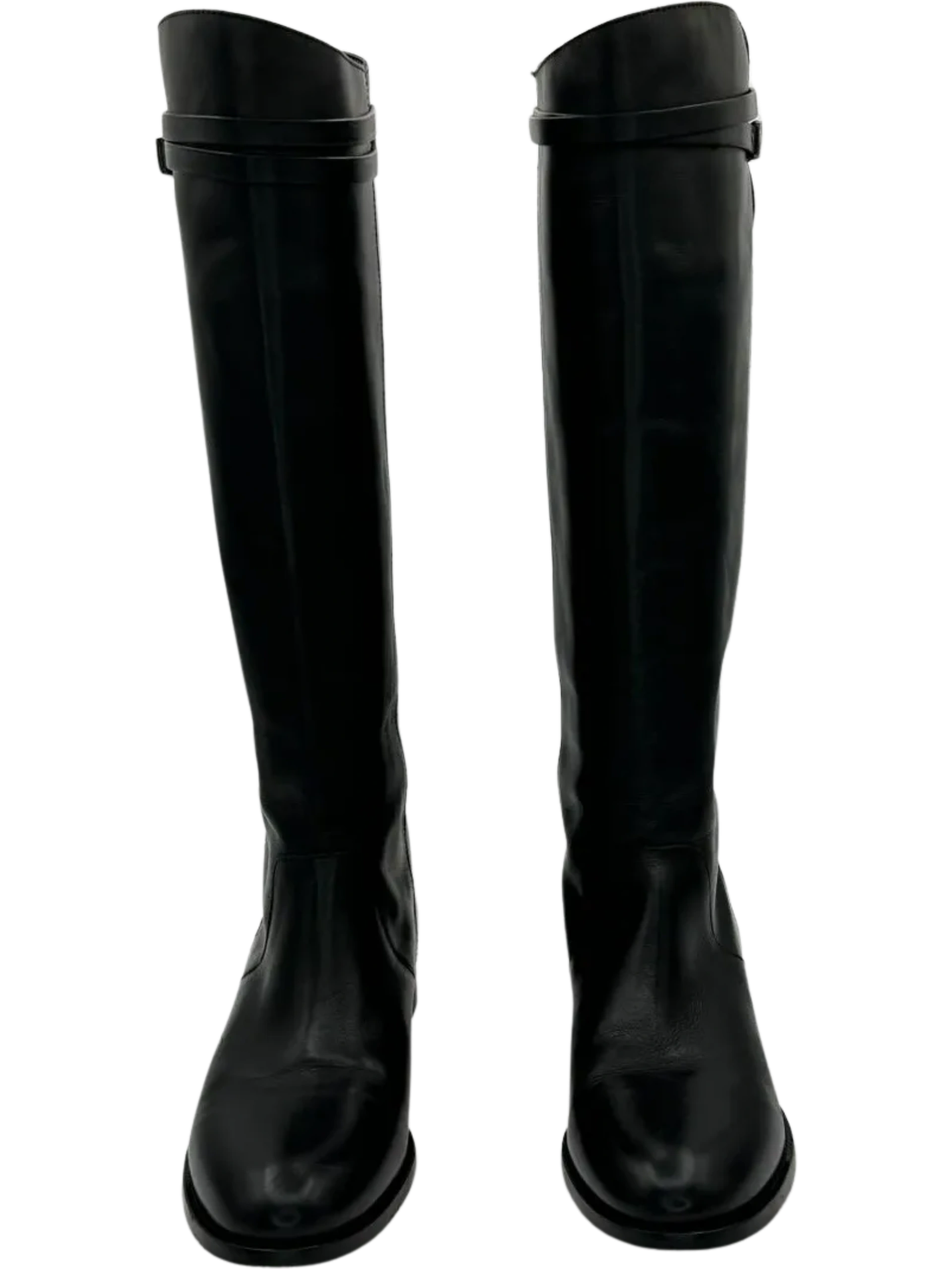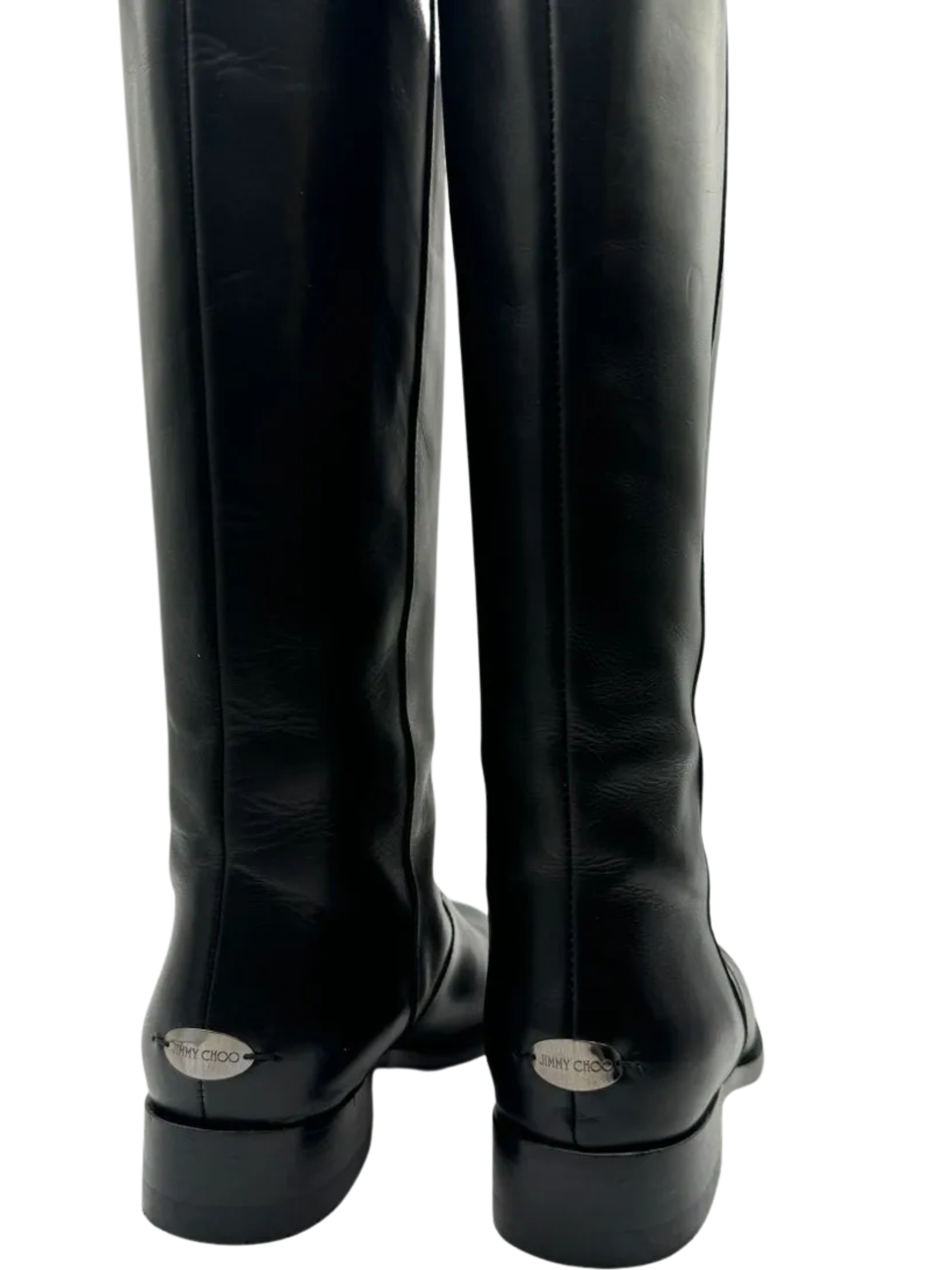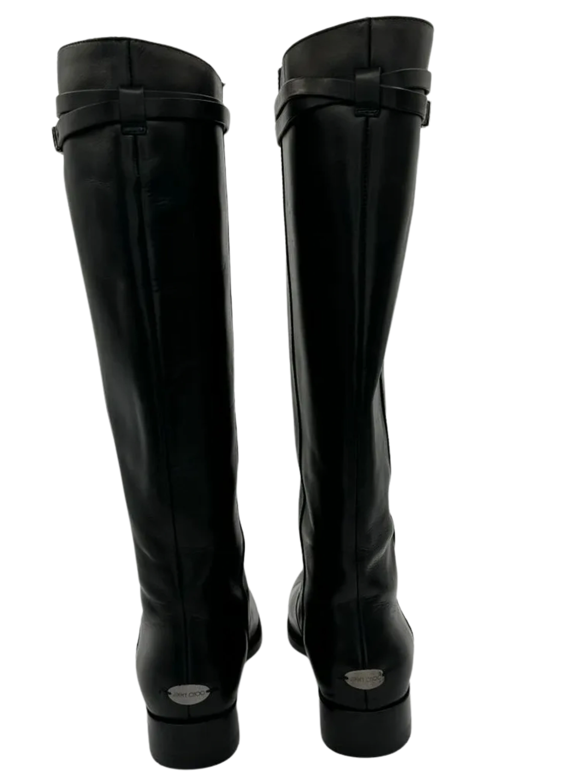 A sleek strap embellished with logo-etched gunmetal silver tone hardware brings a dash of refinement to these JIMMY CHOO Hyson Leather Riding Boots cast in amazing black leather, Round toes, Block rubberized heels, Pull on style, Straps & Hook & Eye Closure at Sides, Condition is nearly new. No significant signs of wear, creasing or scuff. Minor wear on soles. interior is also in excellent condition and made of leather as well. Made in Italy.