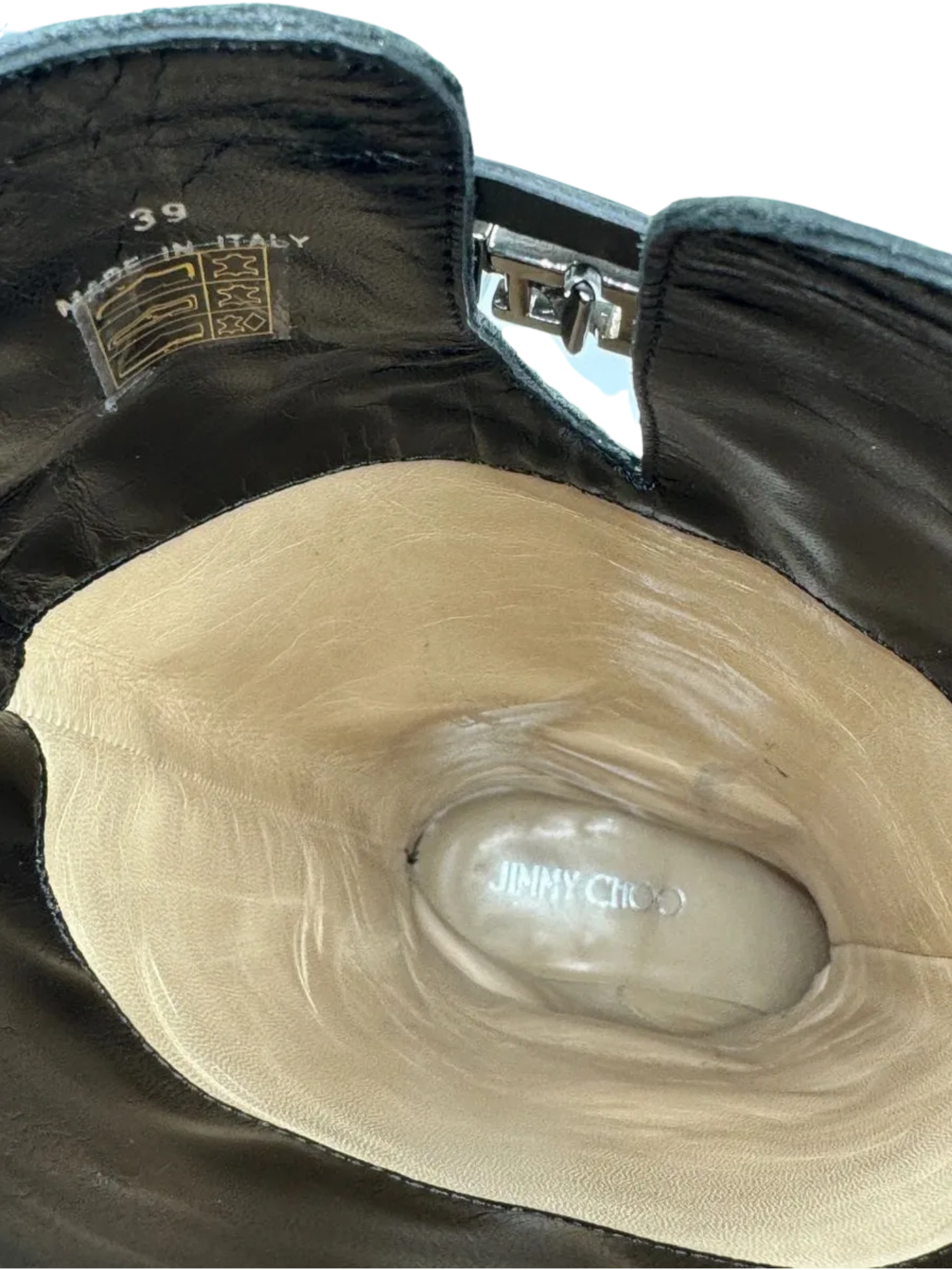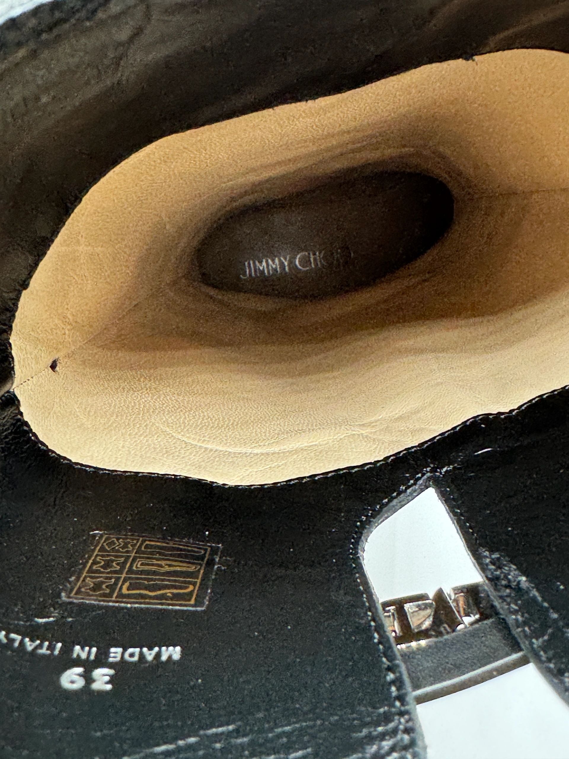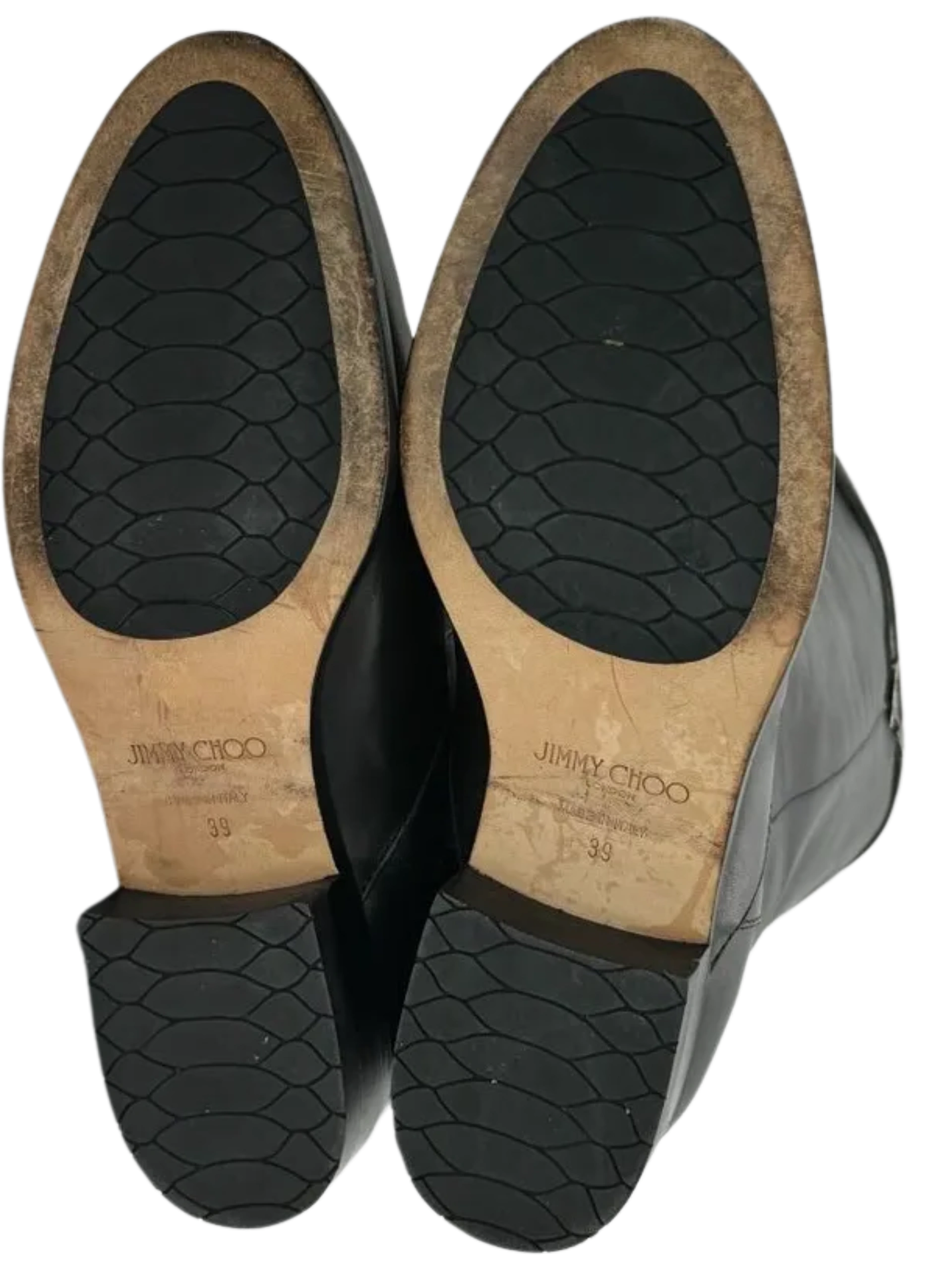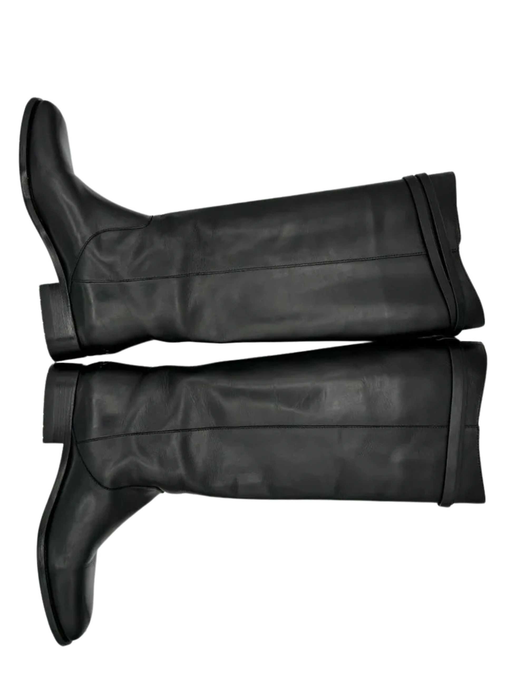 A sleek strap embellished with logo-etched gunmetal silver tone hardware brings a dash of refinement to these JIMMY CHOO Hyson Leather Riding Boots cast in amazing black leather, Round toes, Block rubberized heels, Pull on style, Straps & Hook & Eye Closure at Sides, Condition is nearly new. No significant signs of wear, creasing or scuff. Minor wear on soles. interior is also in excellent condition and made of leather as well. Made in Italy.