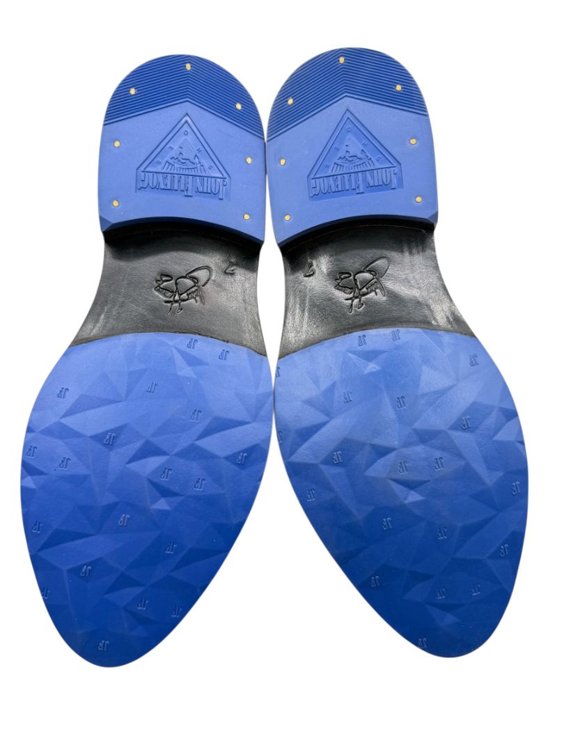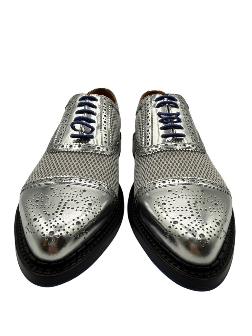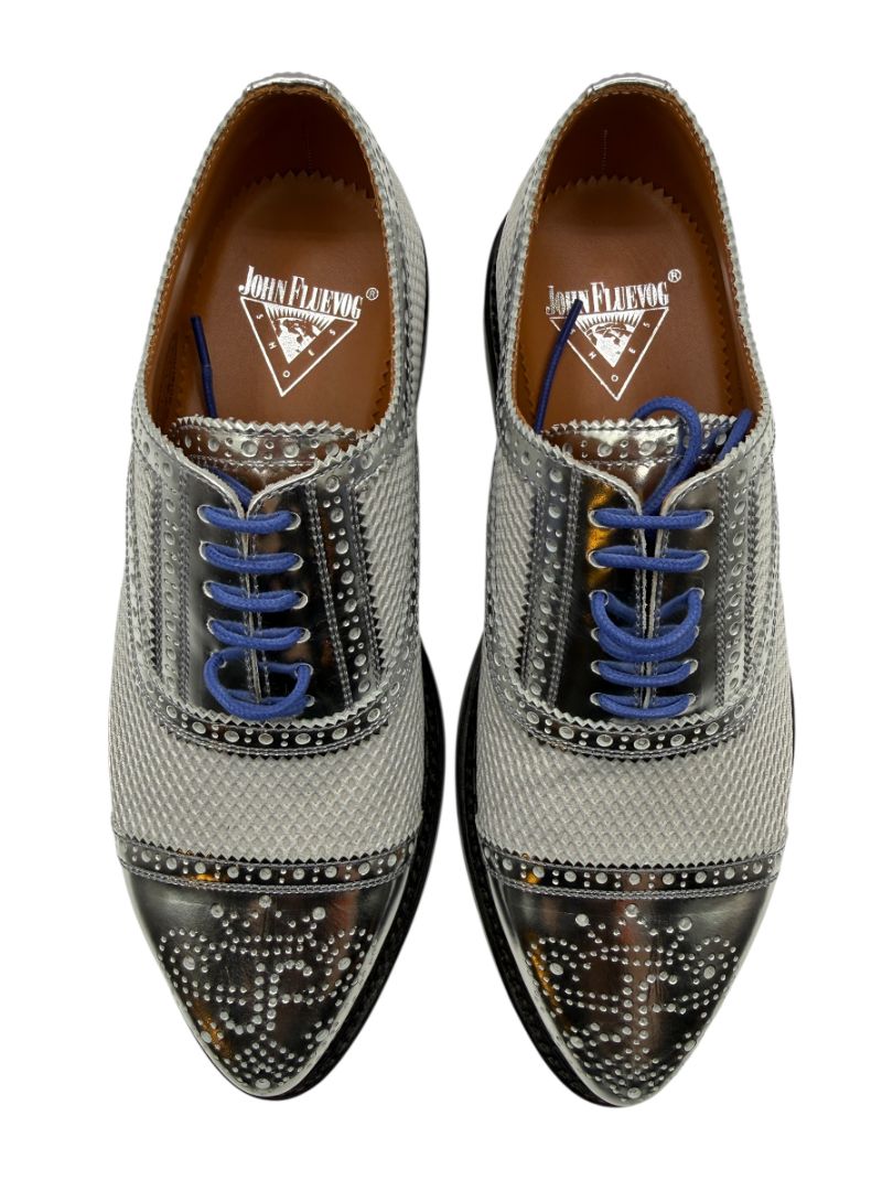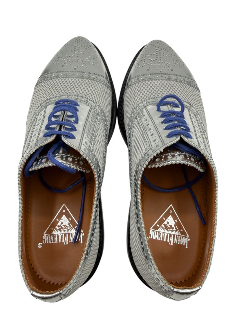 Classic brogue-style perforations accent the polished silver leather cap toe and lace panels, while vivid cobalt blue laces add a modern contrast that perfectly complements Fluevog’s signature blue rubber outsoles. The sculpted sole features geometric texturing and the iconic John Fluevog branding, delivering both traction and unmistakable brand identity.