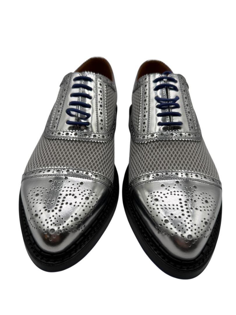 John Fluevog Silver Metallic Mesh & Leather Derby Shoes – Men’s Size 7