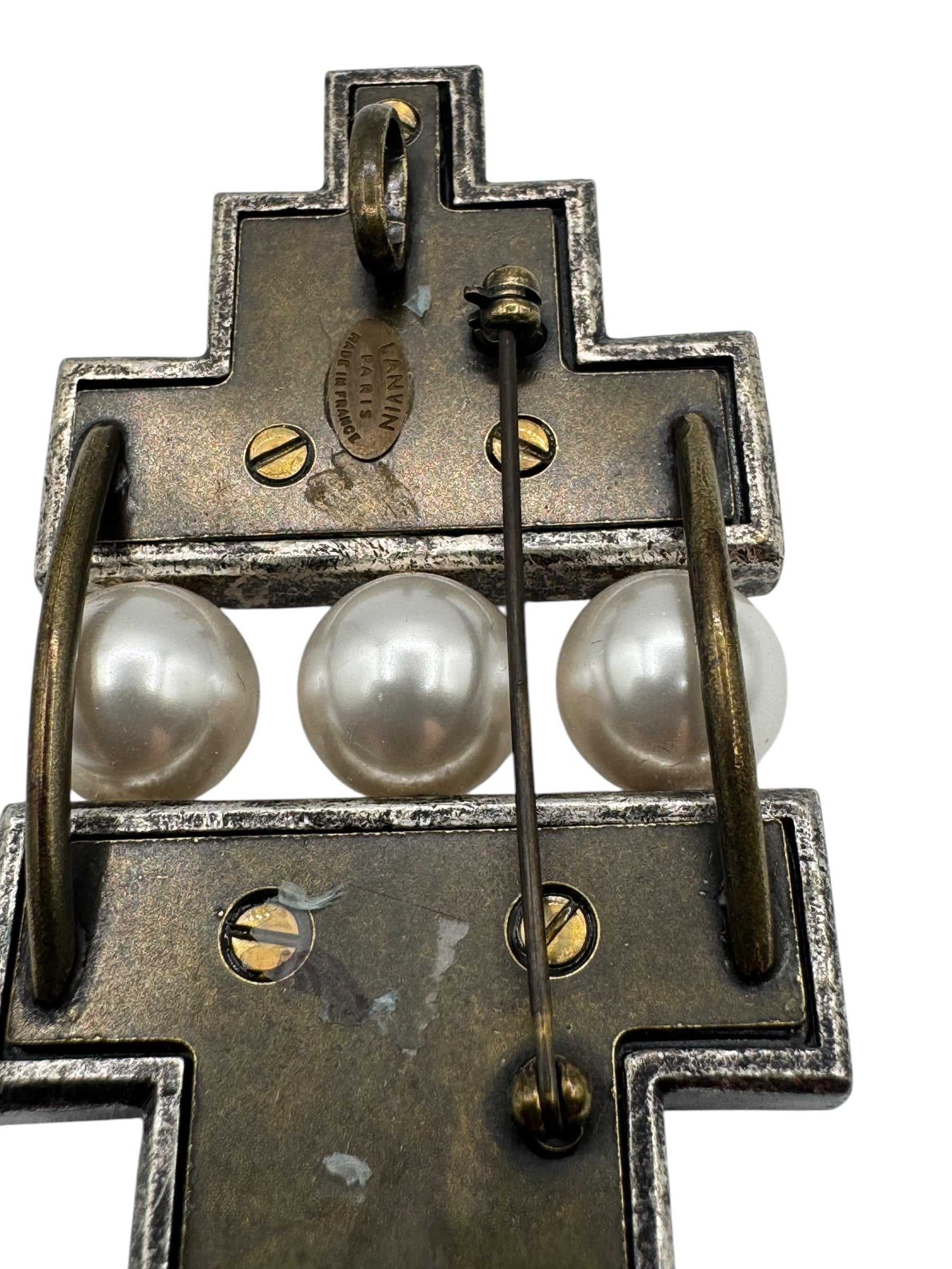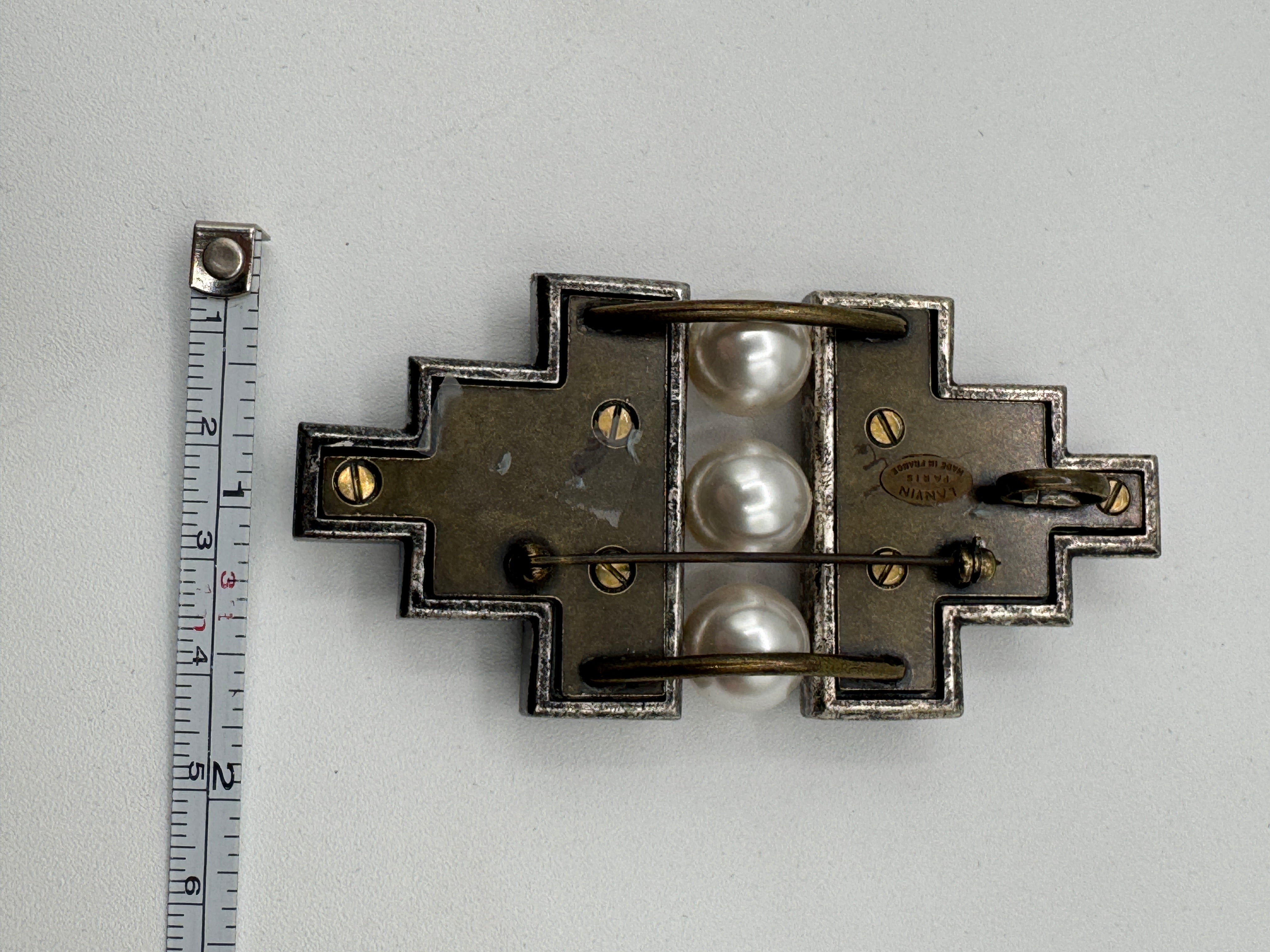 This Limited edition Lanvin faux pearl & crystal Brooch/Pin comes New in box with tags. Made in France. Made of Pewter, Glass and Brass. Measures 3.5" x 1.75" Stamped on back. Excellent Condition.