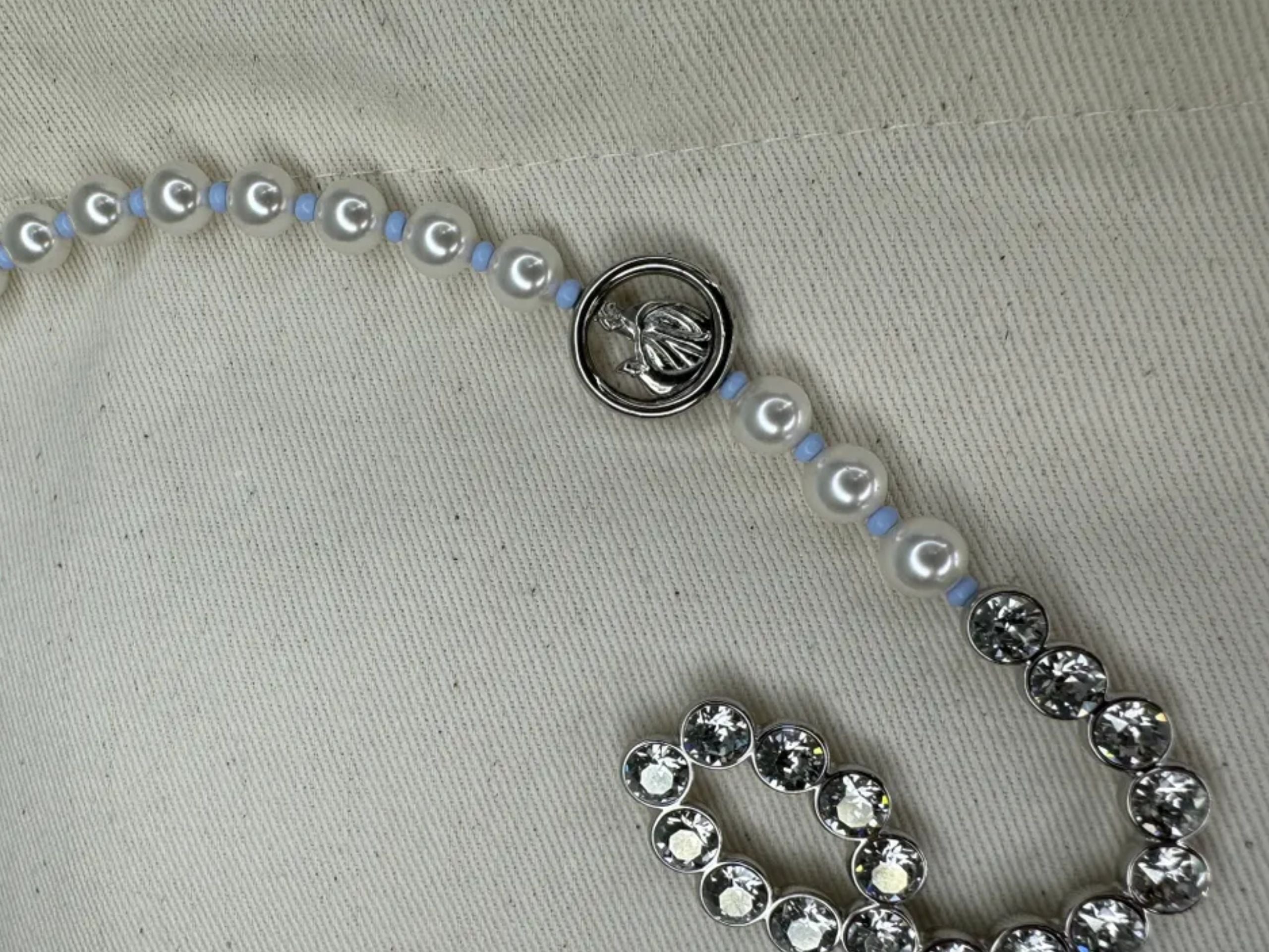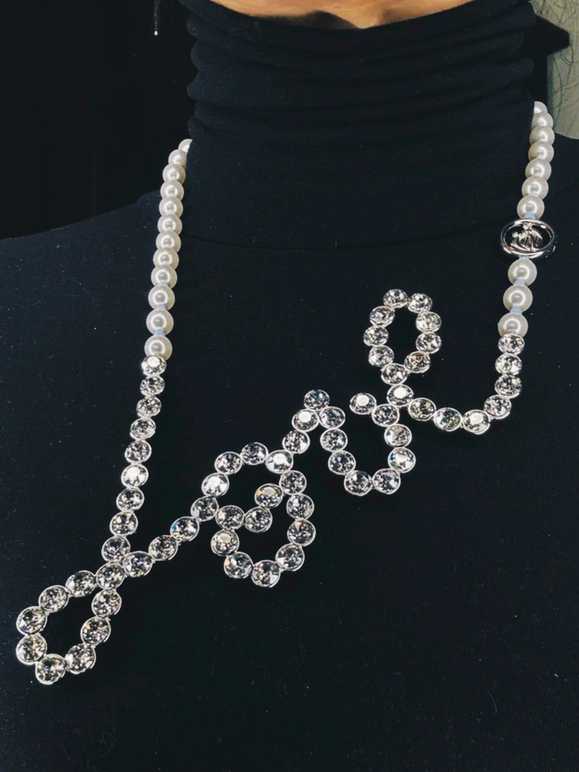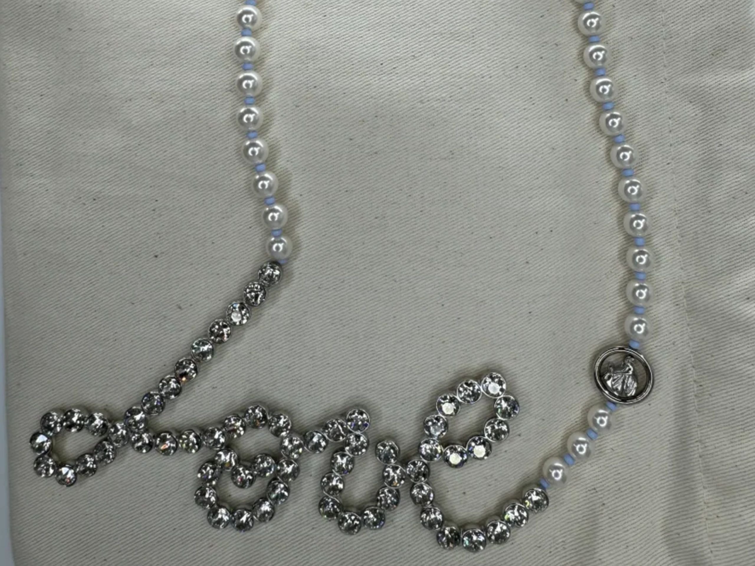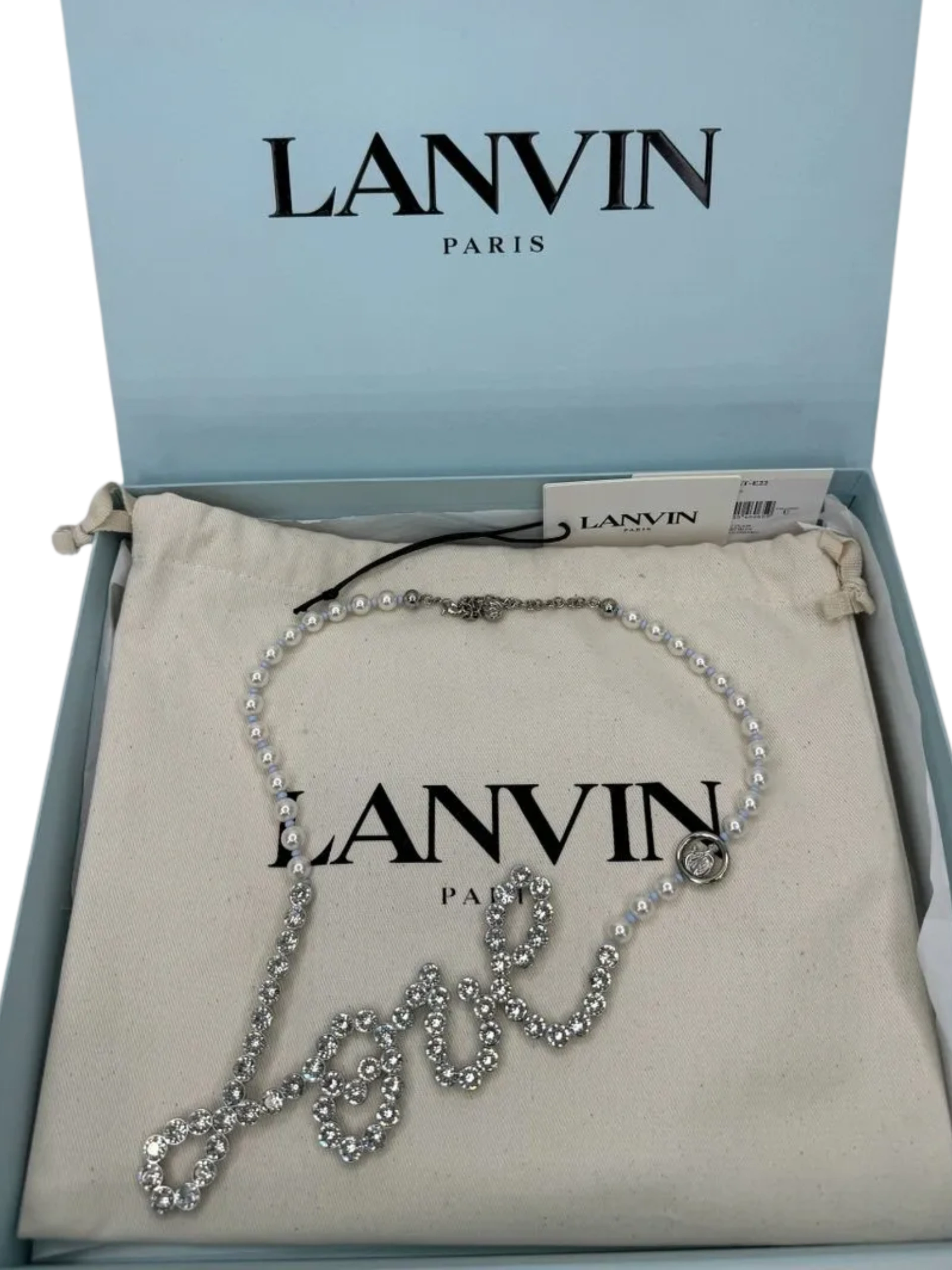 Lanvin "Love" Necklace - Classic Piece from the Lanvin Alber Albaz Era. 100% Brass, Accented with crystals, pearls and pale blue string detail, Adjustable strap, Lanvin Logo at right side. Brand New in Box and original packaging, Excellent Condition.