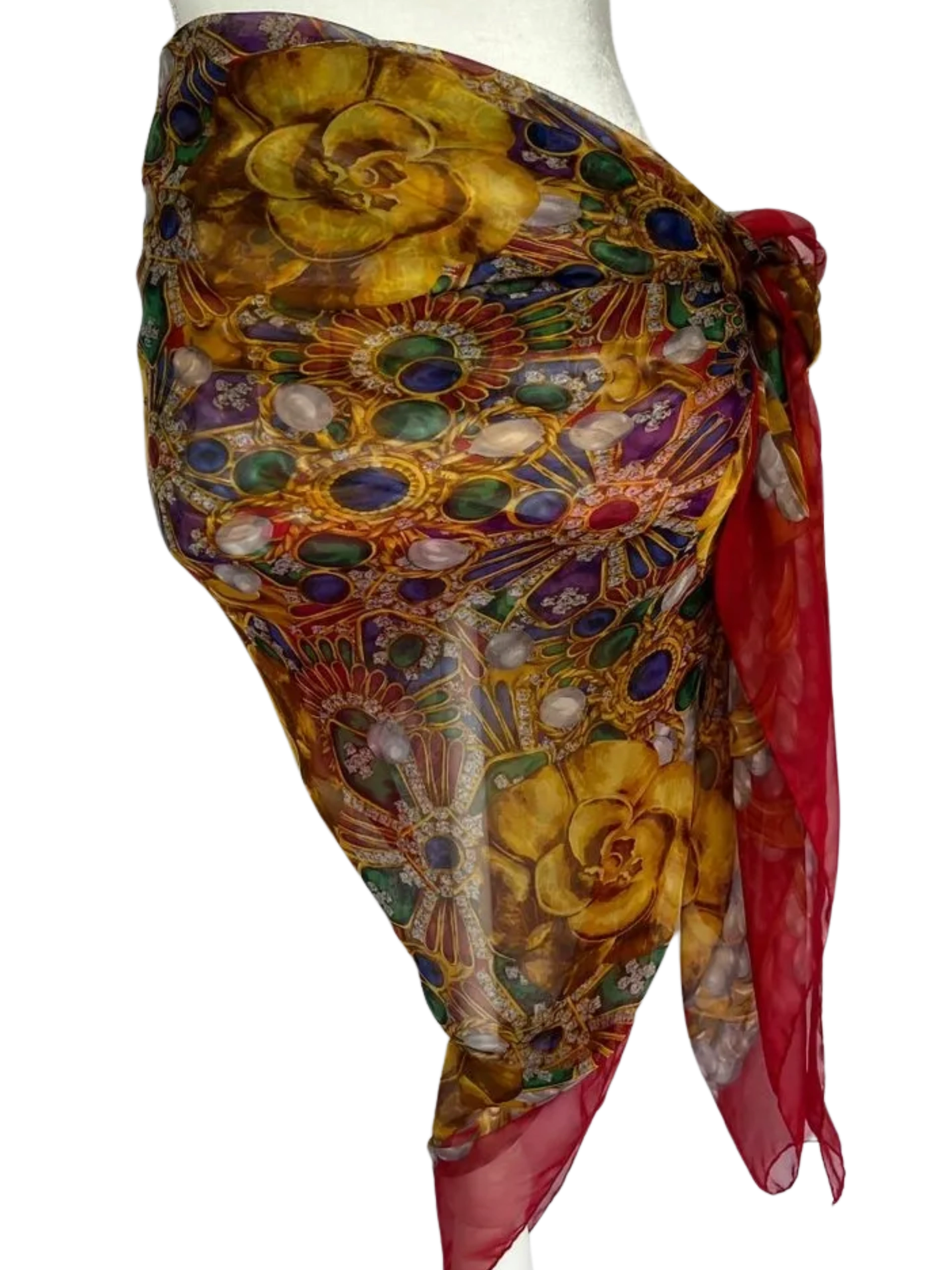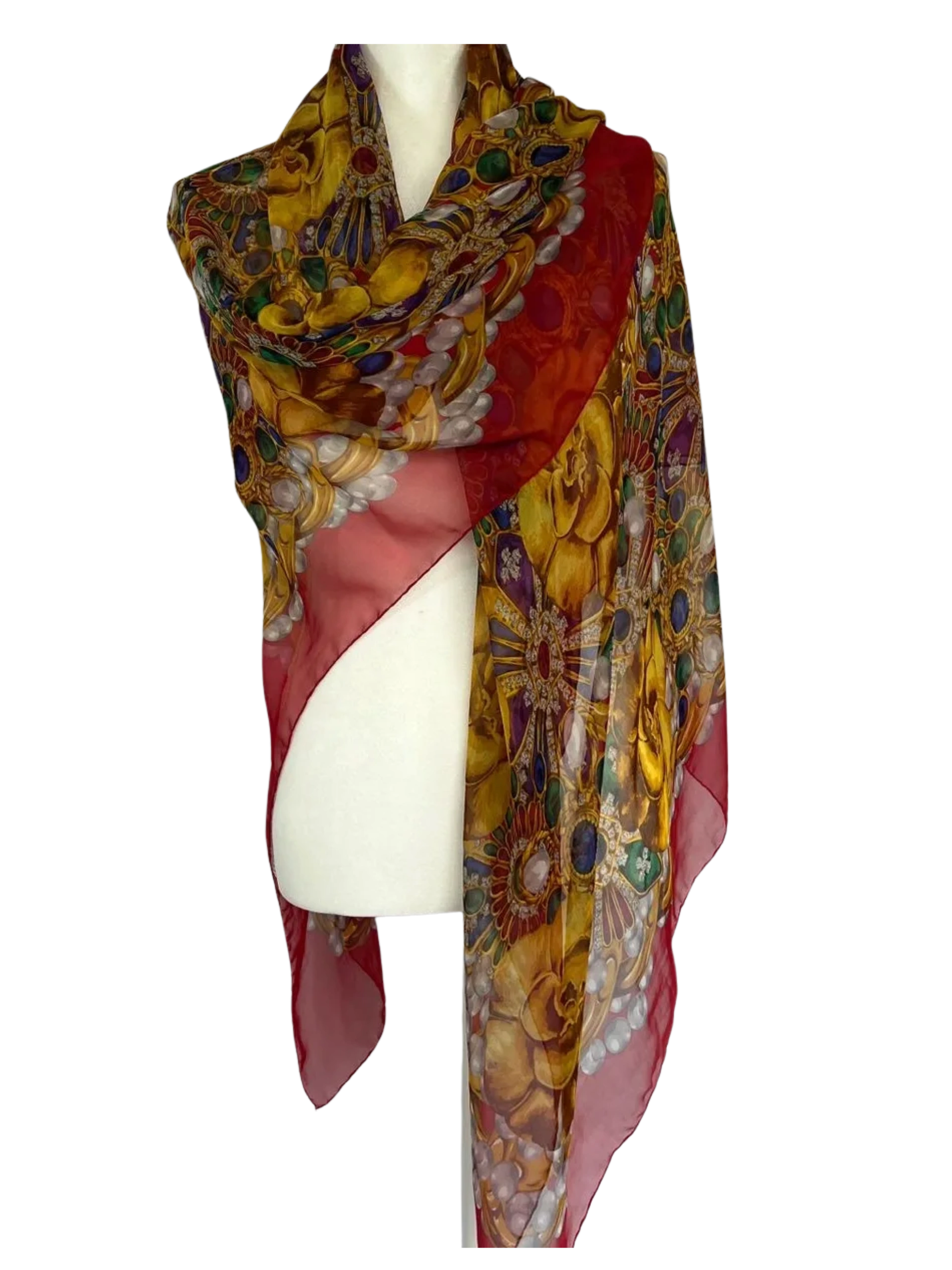 Chanel Silk Chiffon Scarf in Camellia, Pearls, and Gripoix Jewelry Print. 54" W x 54" Square, Great Condition, Light wear, no significant signs of wear, Great for a beach cover up, shawl or around the neck. 100% Silk Chiffon.