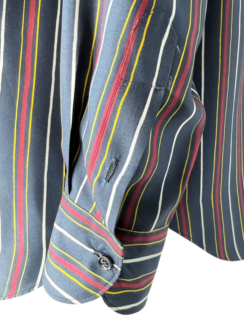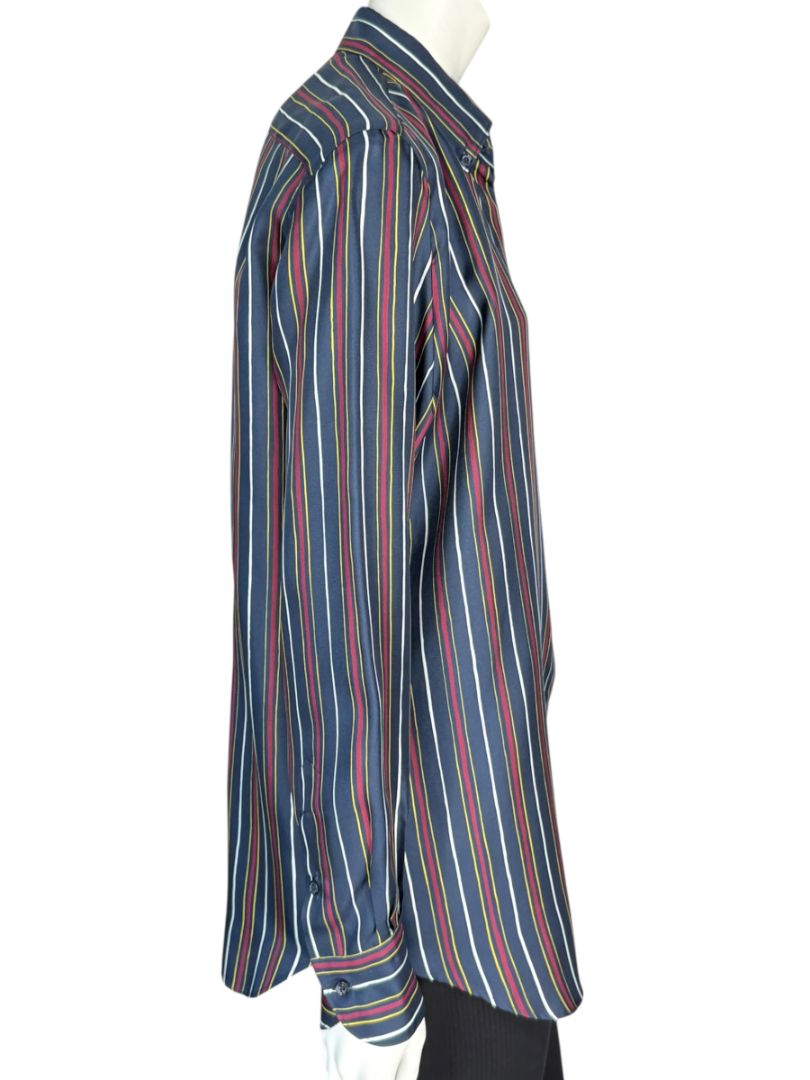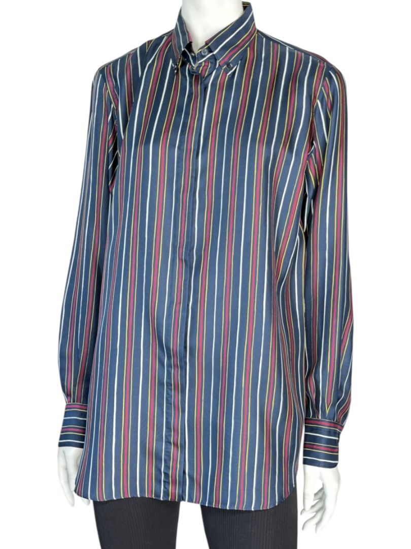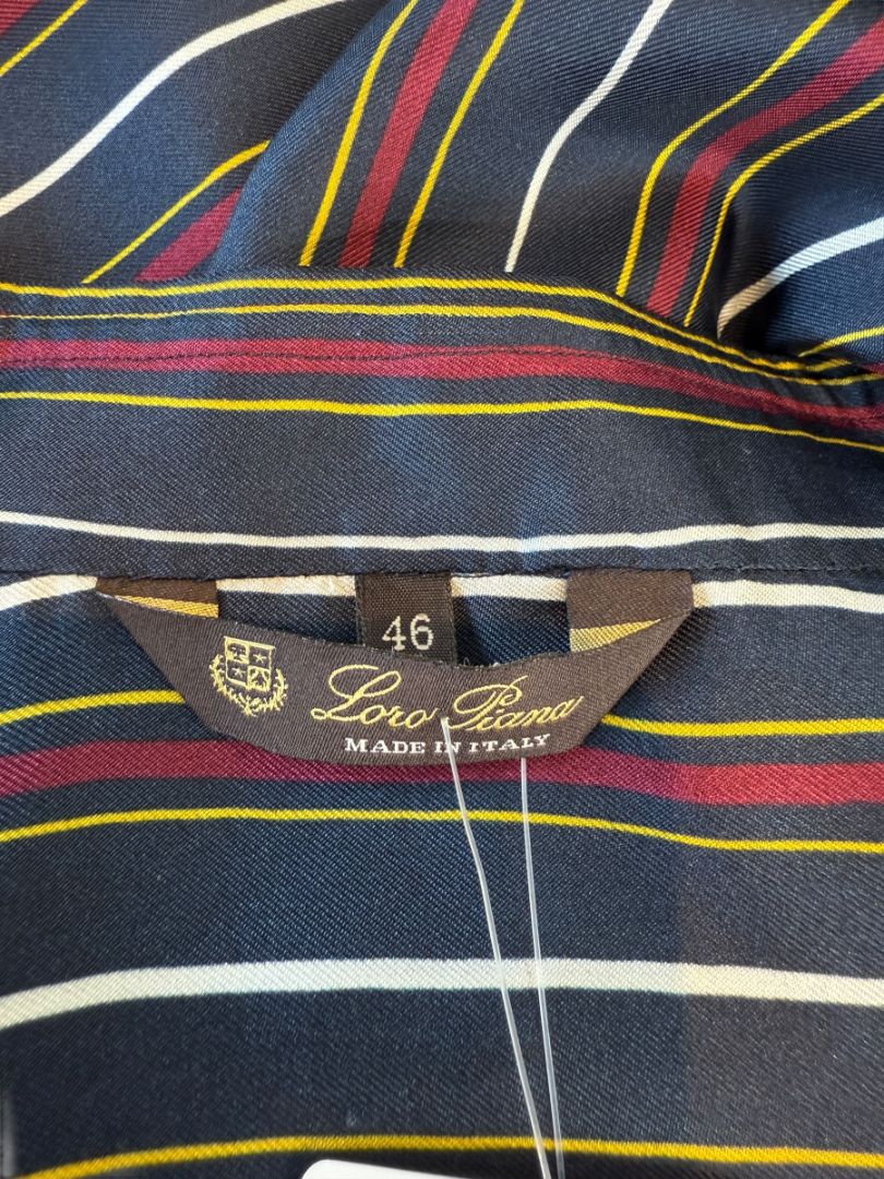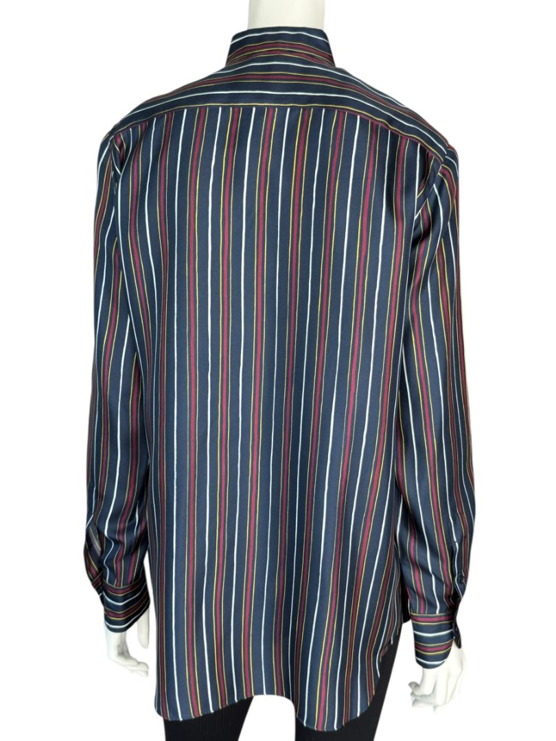 Excellent Pre-Owned Condition – Crafted in Italy from 100% silk, this Loro Piana shirt offers a luxurious drape and a vibrant multicolor vertical stripe pattern in shades of burgundy, yellow, white, and green on a navy base. The design features a point collar with button tabs, a concealed front placket, and button cuffs. Noted: one button missing on the sleeve at the second buttonhole.