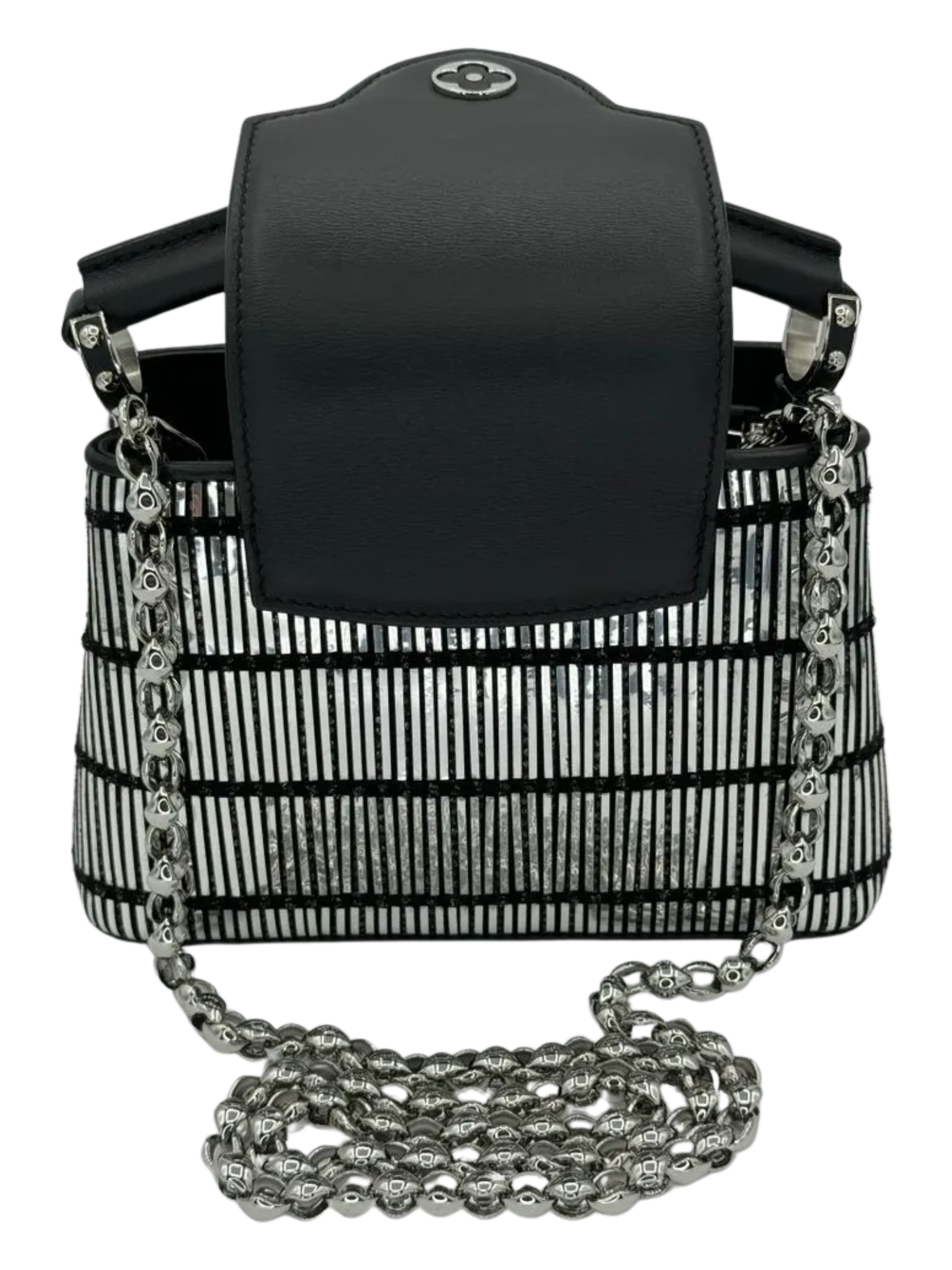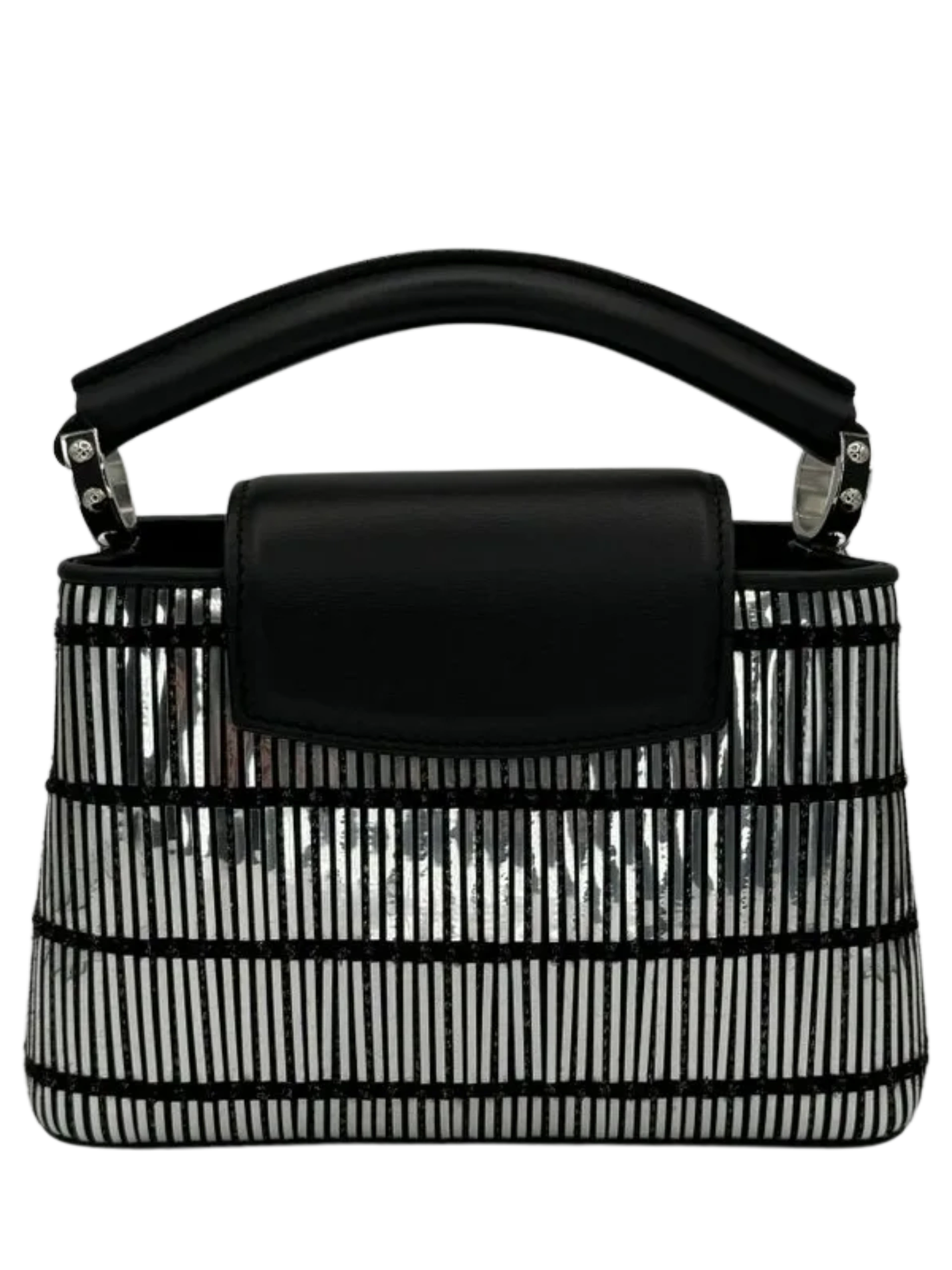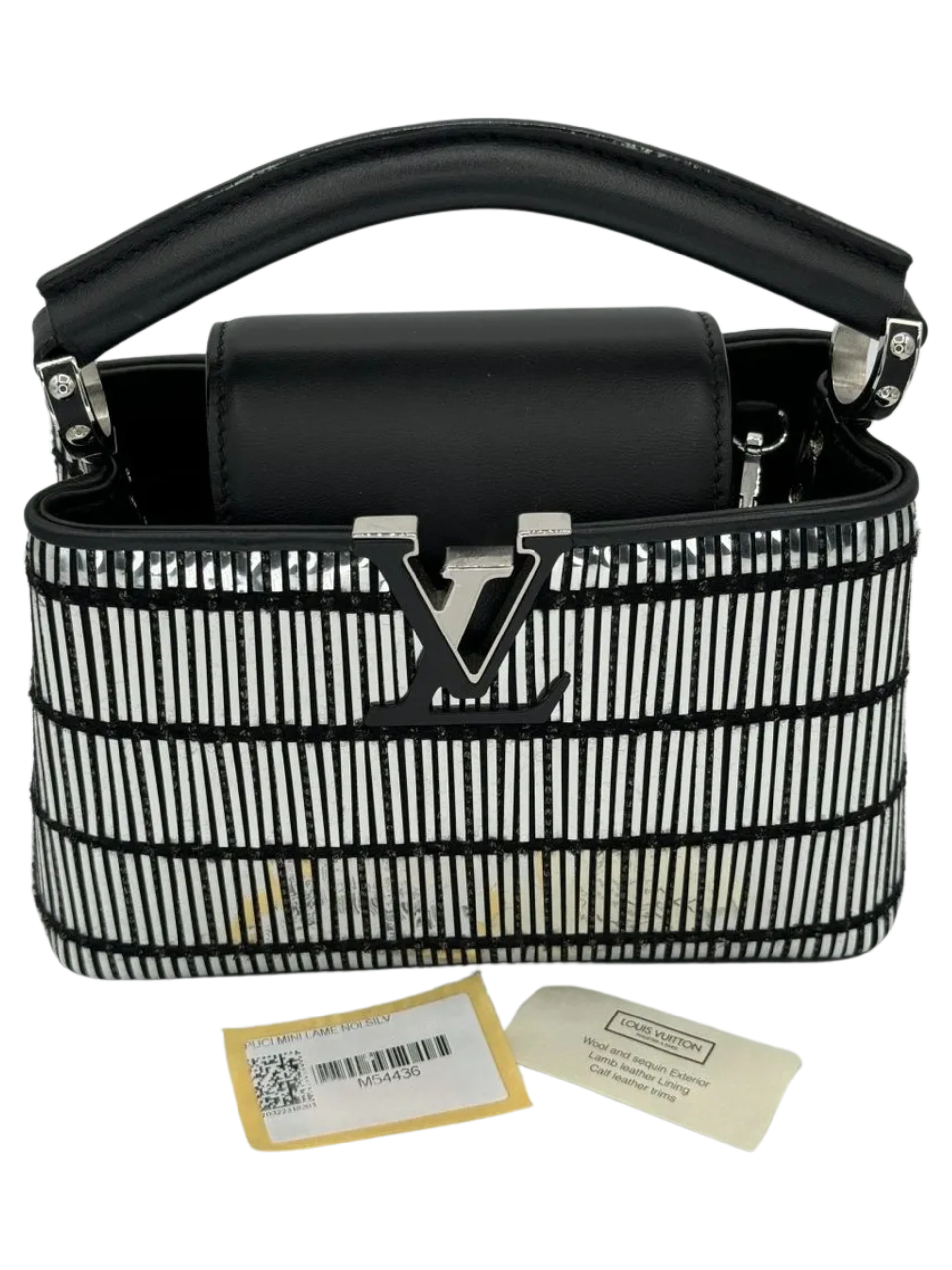 *Limited Edition* Louis Vuitton Pre-Fall 2017 Mini Capucines Black Leather with silver details in Excellent Condition. Purchased for $6500. Top hand and silver chain strap for shoulder or crossbody. Black suede interior, one small interior pocket, Silver hardware comes with original purchase tags. Protective feet on bottom.