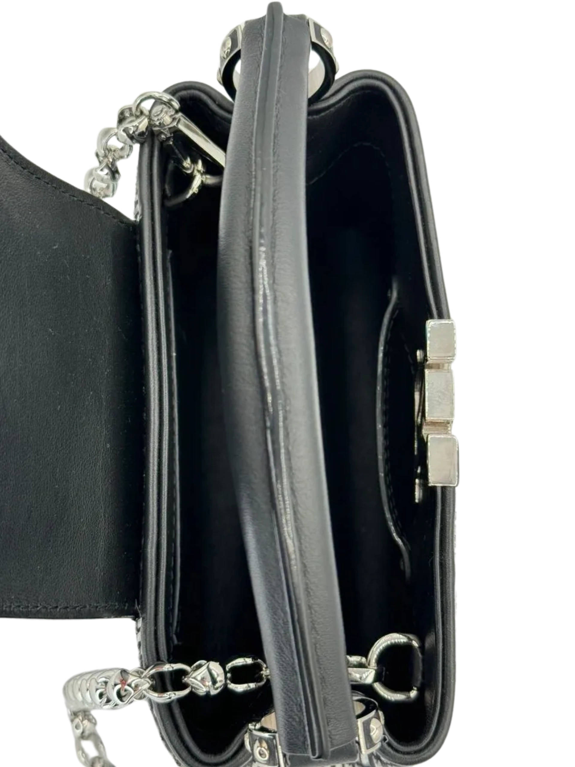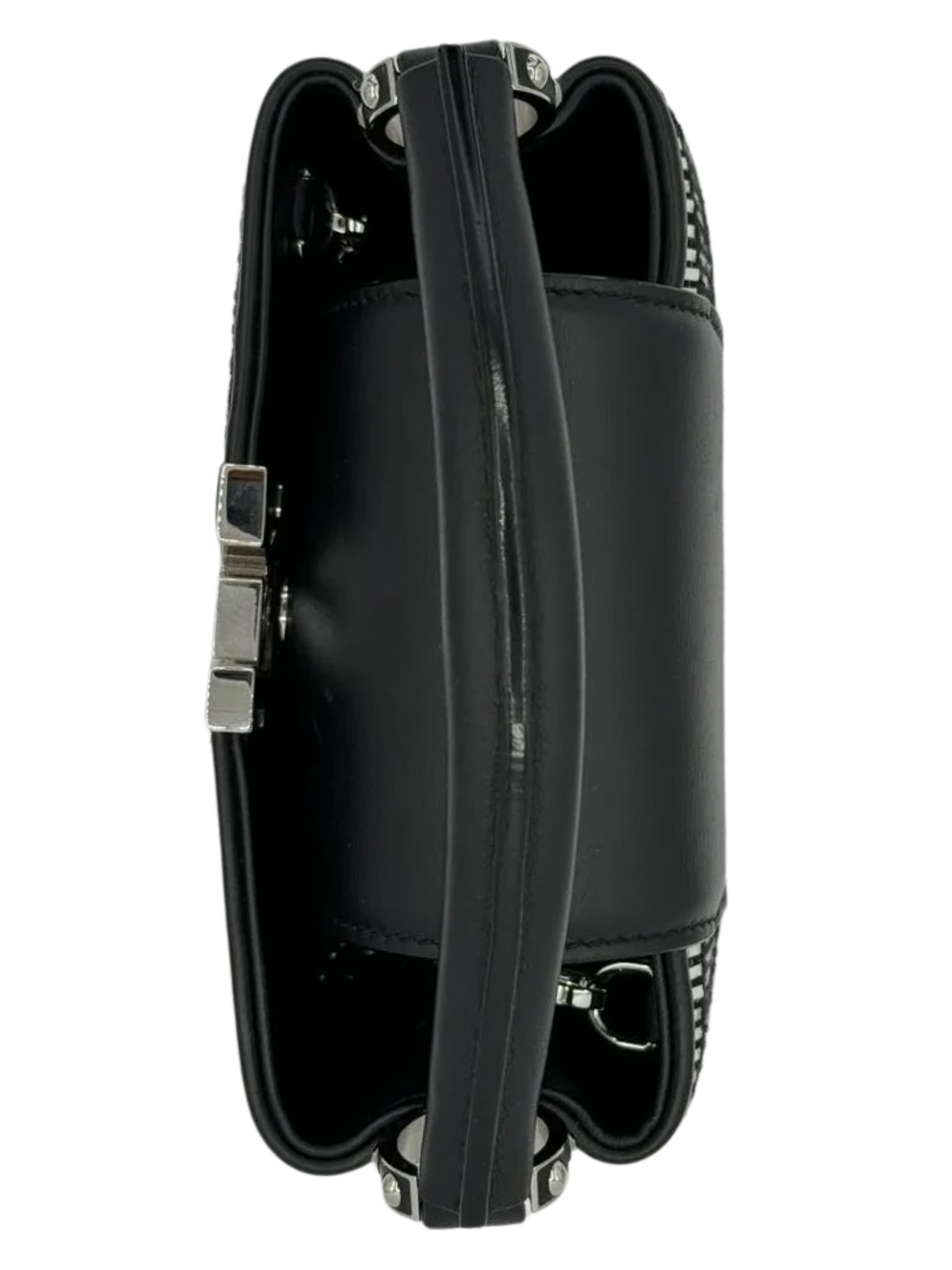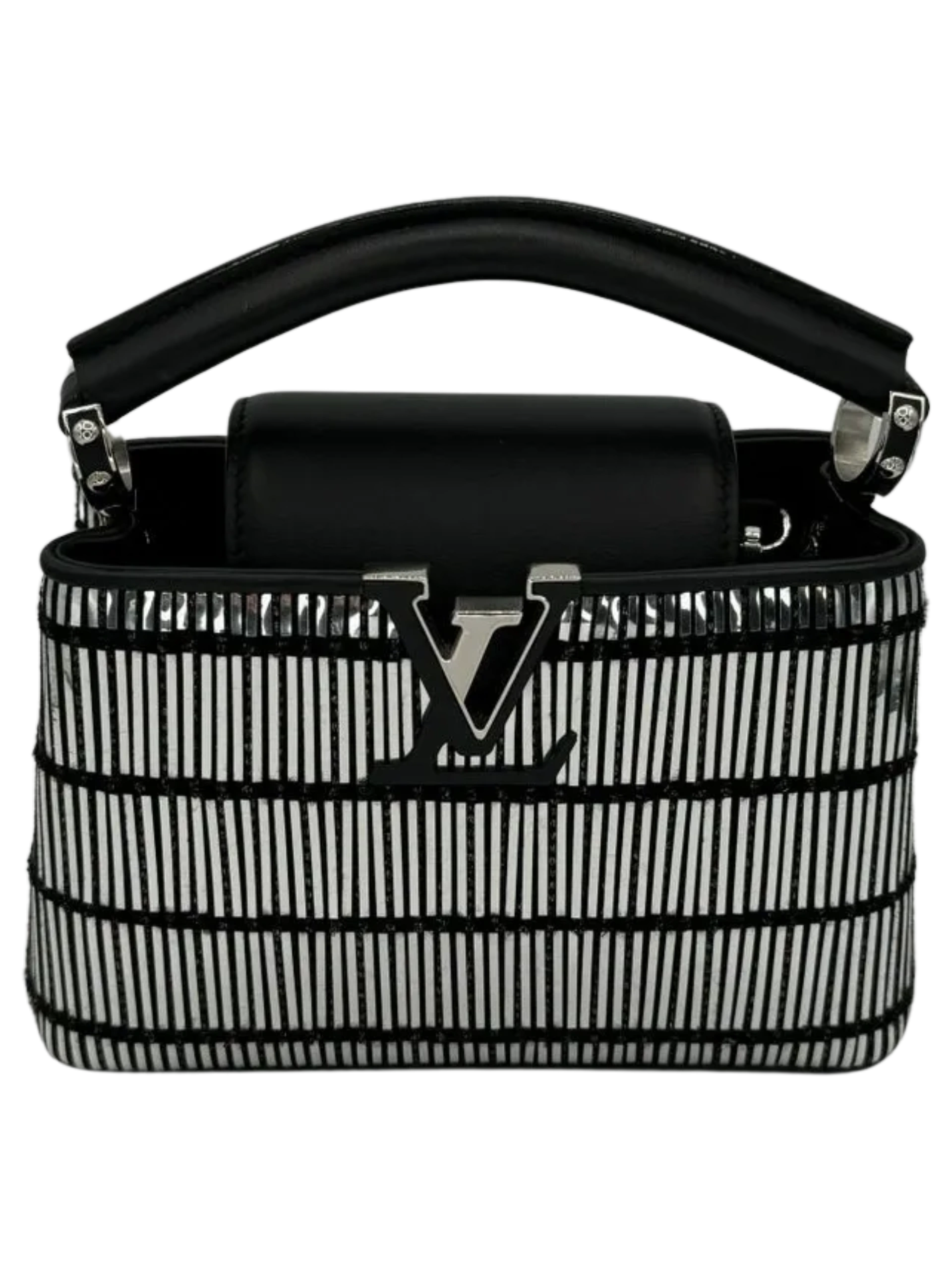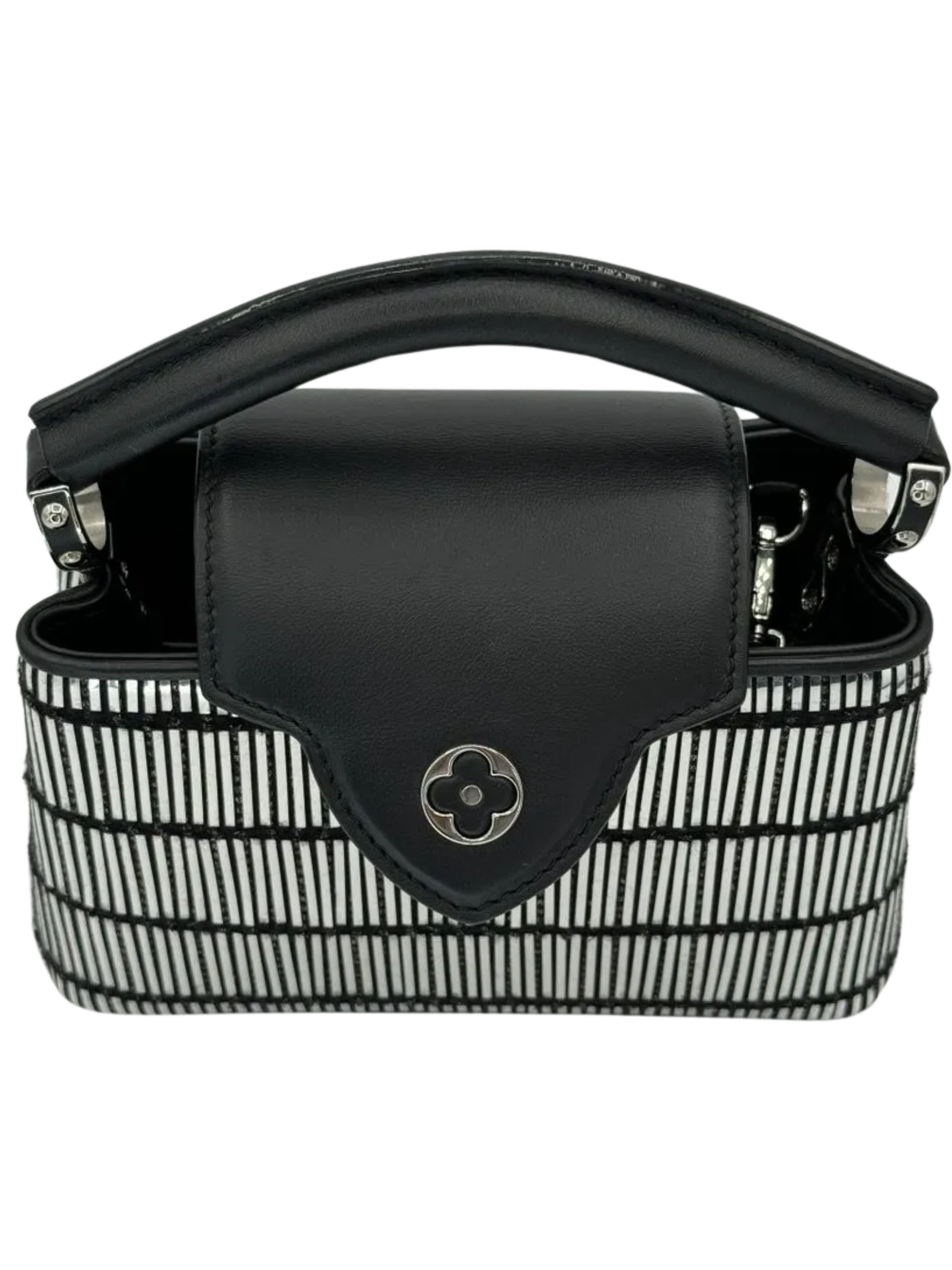 *Limited Edition* Louis Vuitton Pre-Fall 2017 Mini Capucines Black Leather with silver details in Excellent Condition. Purchased for $6500. Top hand and silver chain strap for shoulder or crossbody. Black suede interior, one small interior pocket, Silver hardware comes with original purchase tags. Protective feet on bottom.