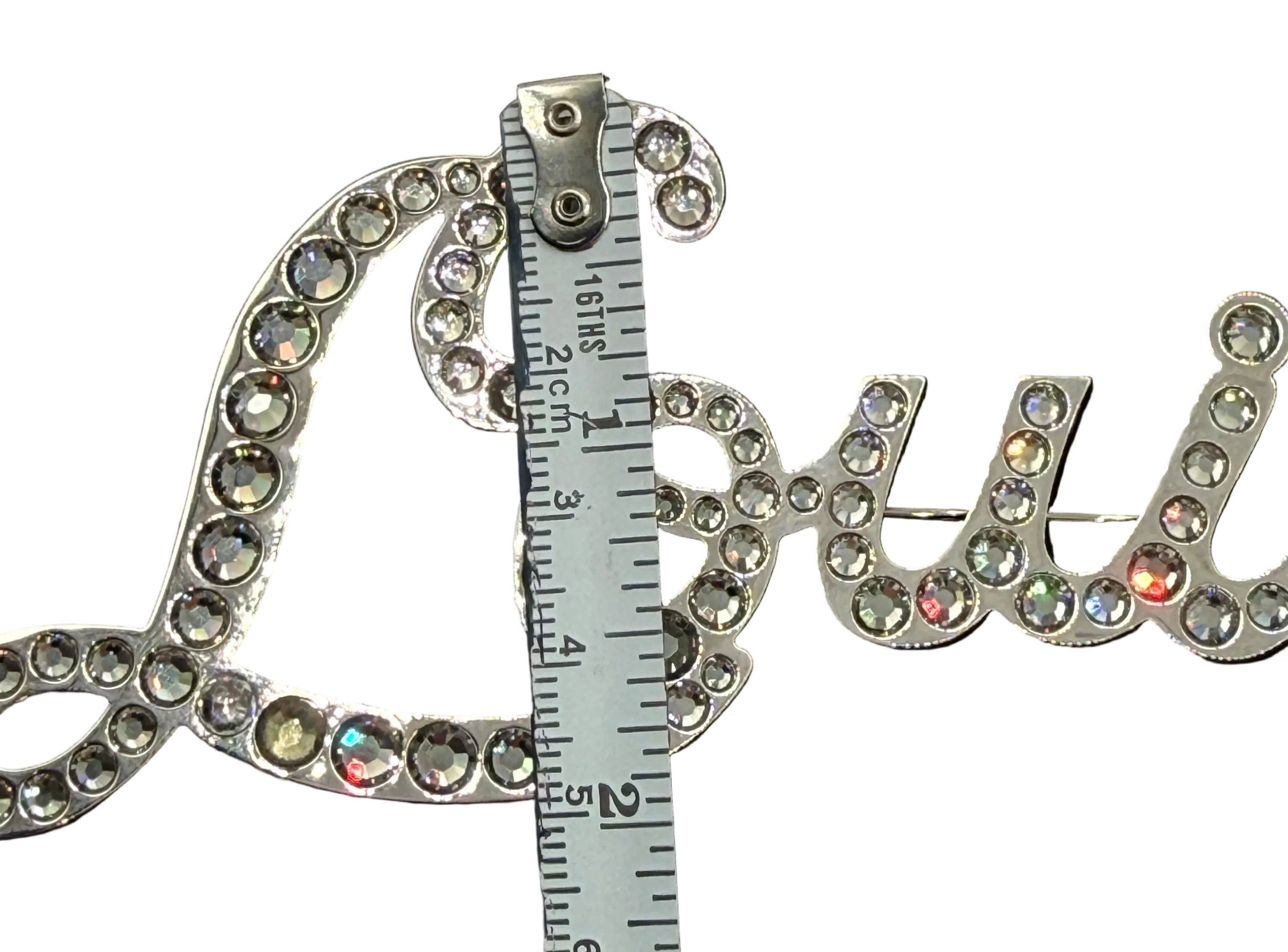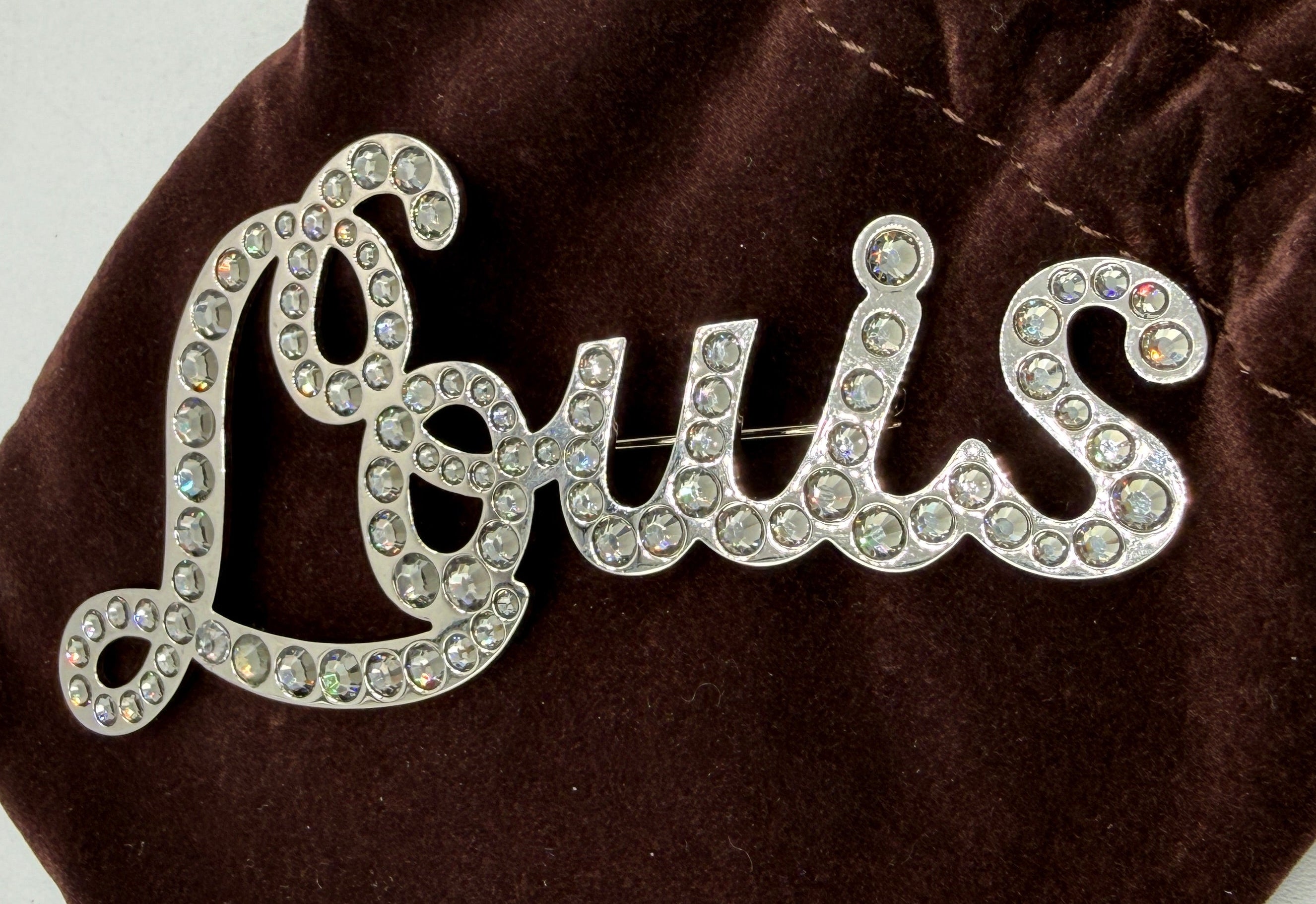 This striking oversized Louis Vuitton brooch features the iconic Louis script rendered in a fluid, sculptural silhouette and fully pavé-set with brilliant clear crystals that catch the light beautifully from every angle. Bold yet elegant, this statement piece is designed to elevate even the simplest look—whether pinned to a blazer, coat, knit, or styled creatively on a scarf or bag.