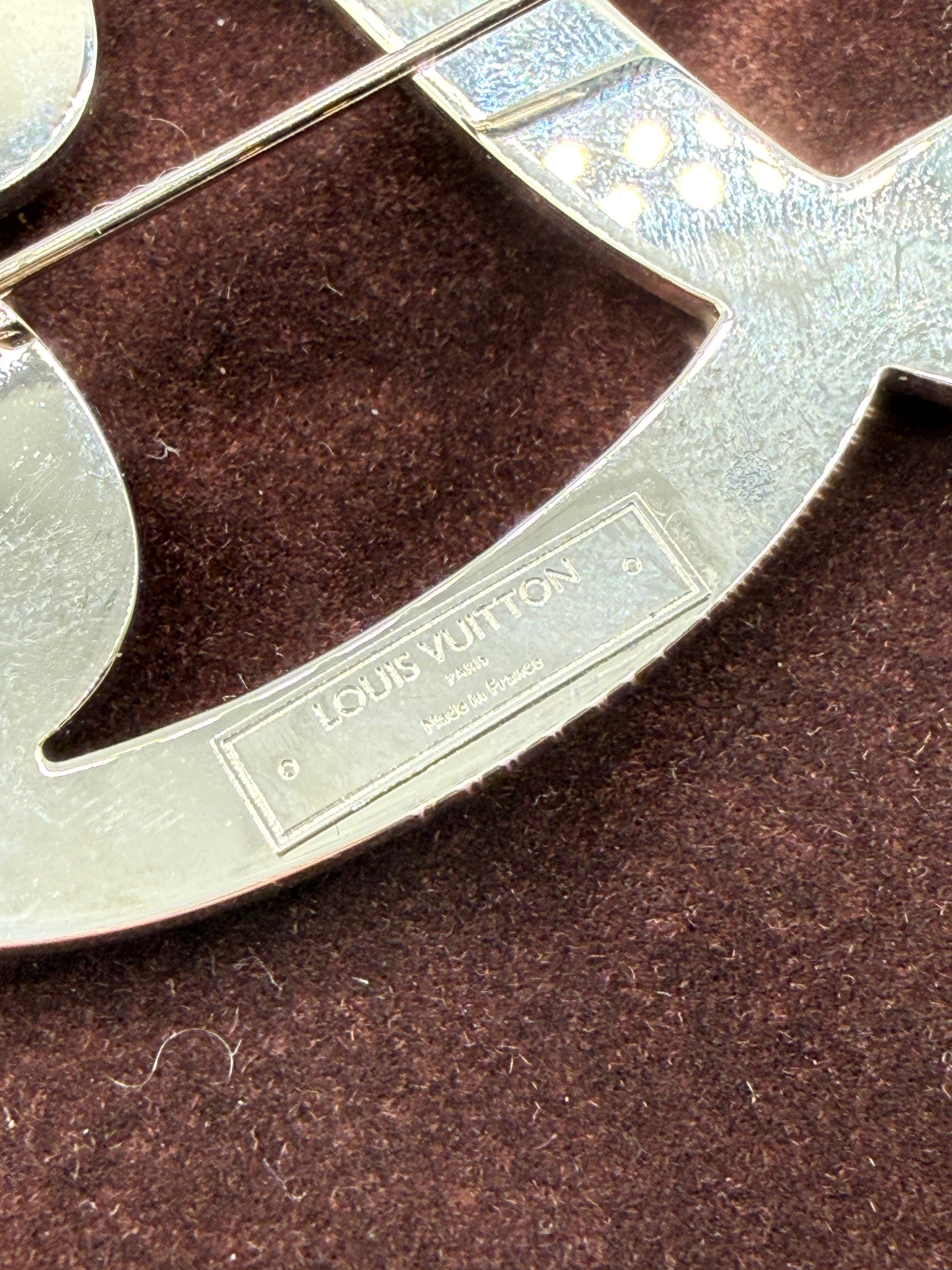 Crafted in silver-tone metal, the brooch showcases meticulous detailing throughout, from the smooth polished reverse to the evenly set crystals across the entire design. The pin-back closure is sturdy and secure, and the piece is stamped Louis Vuitton – Made in France on the reverse. No missing stones are present, and only minimal signs of wear are visible, consistent with very careful use.