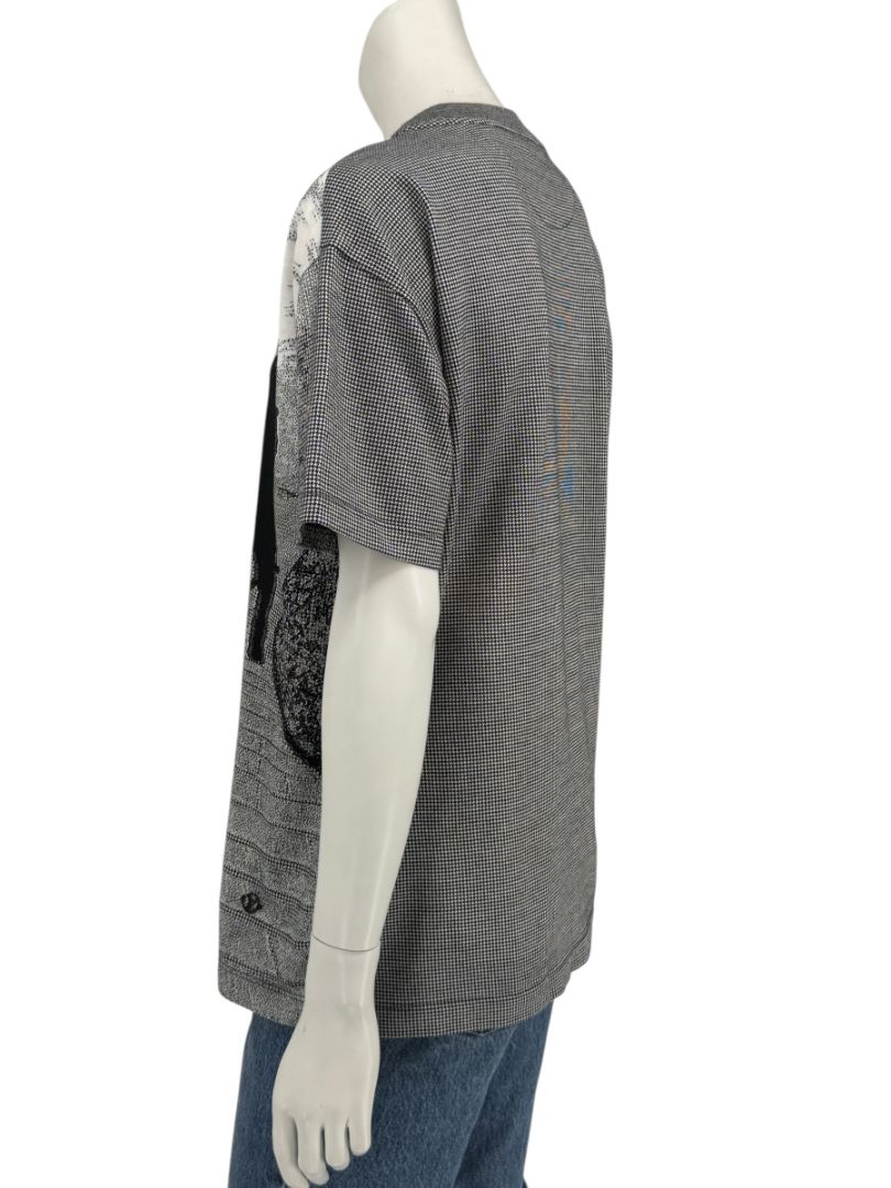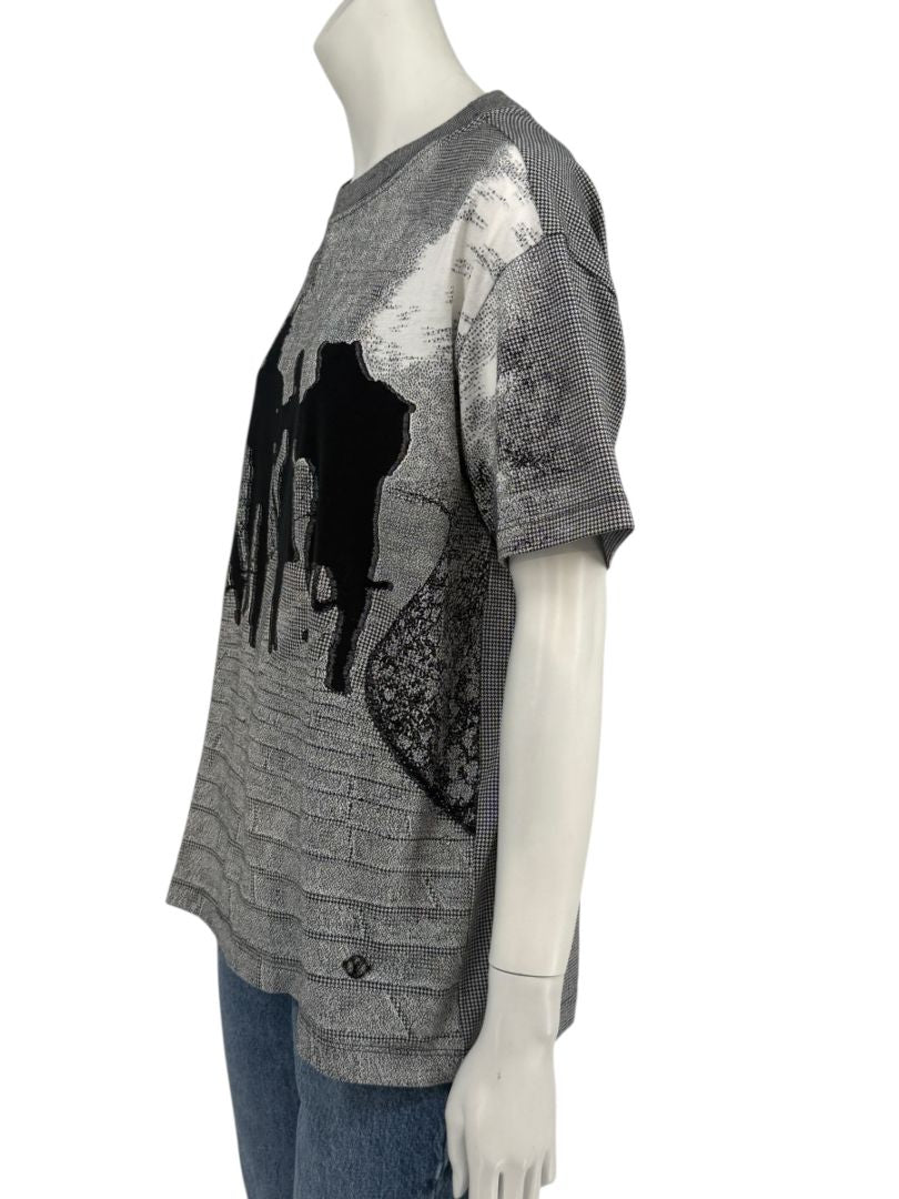 This Louis Vuitton t-shirt features a striking monochromatic graphic inspired by The Wizard of Oz, depicting silhouetted figures of Dorothy, the Tin Man, the Scarecrow, and the Cowardly Lion walking together along a stylized brick road. The scene is rendered in a textured black-and-grey palette that blends photographic imagery with fine houndstooth and knit-like patterning, creating depth, movement, and an art-forward visual effect.