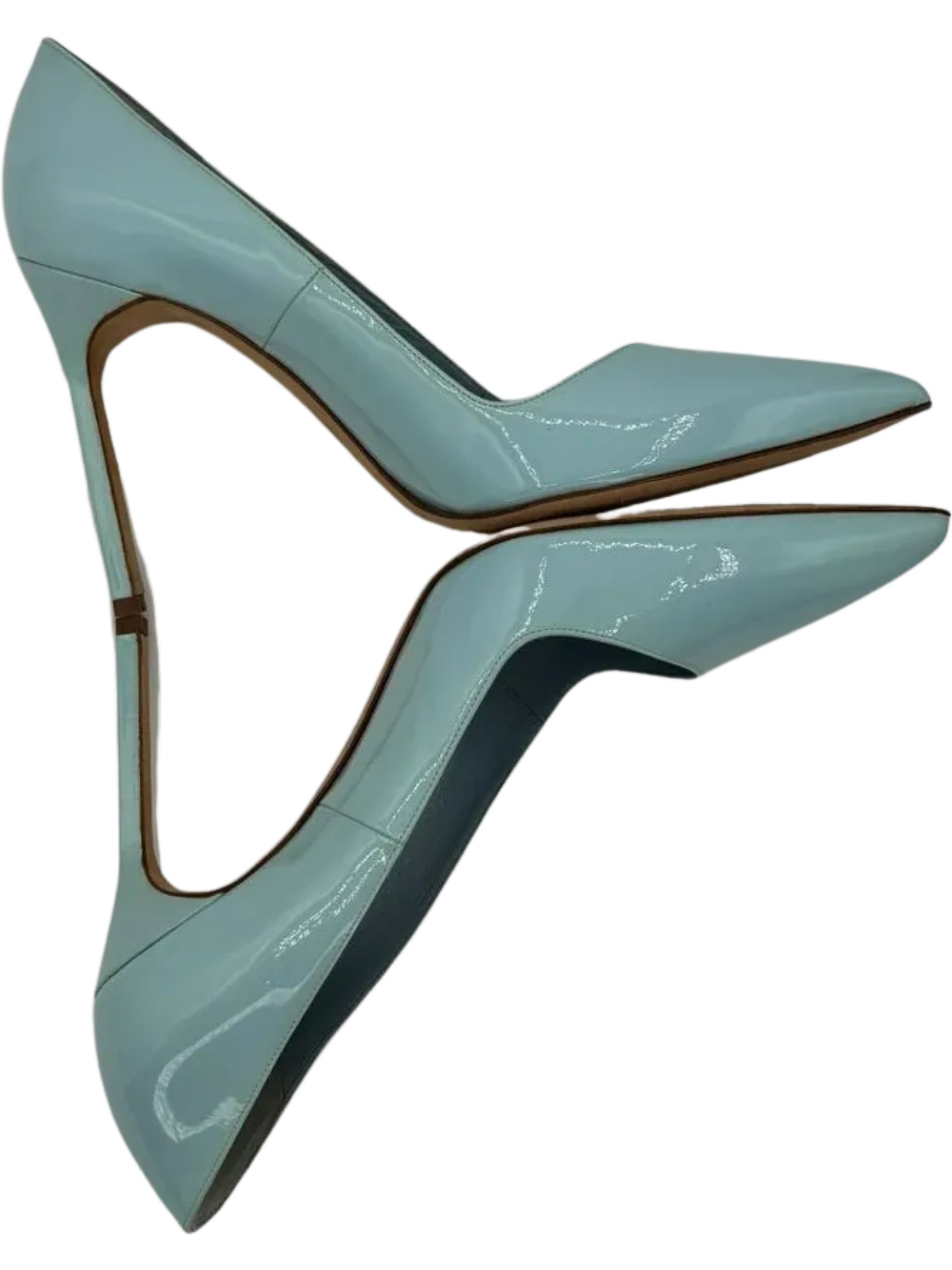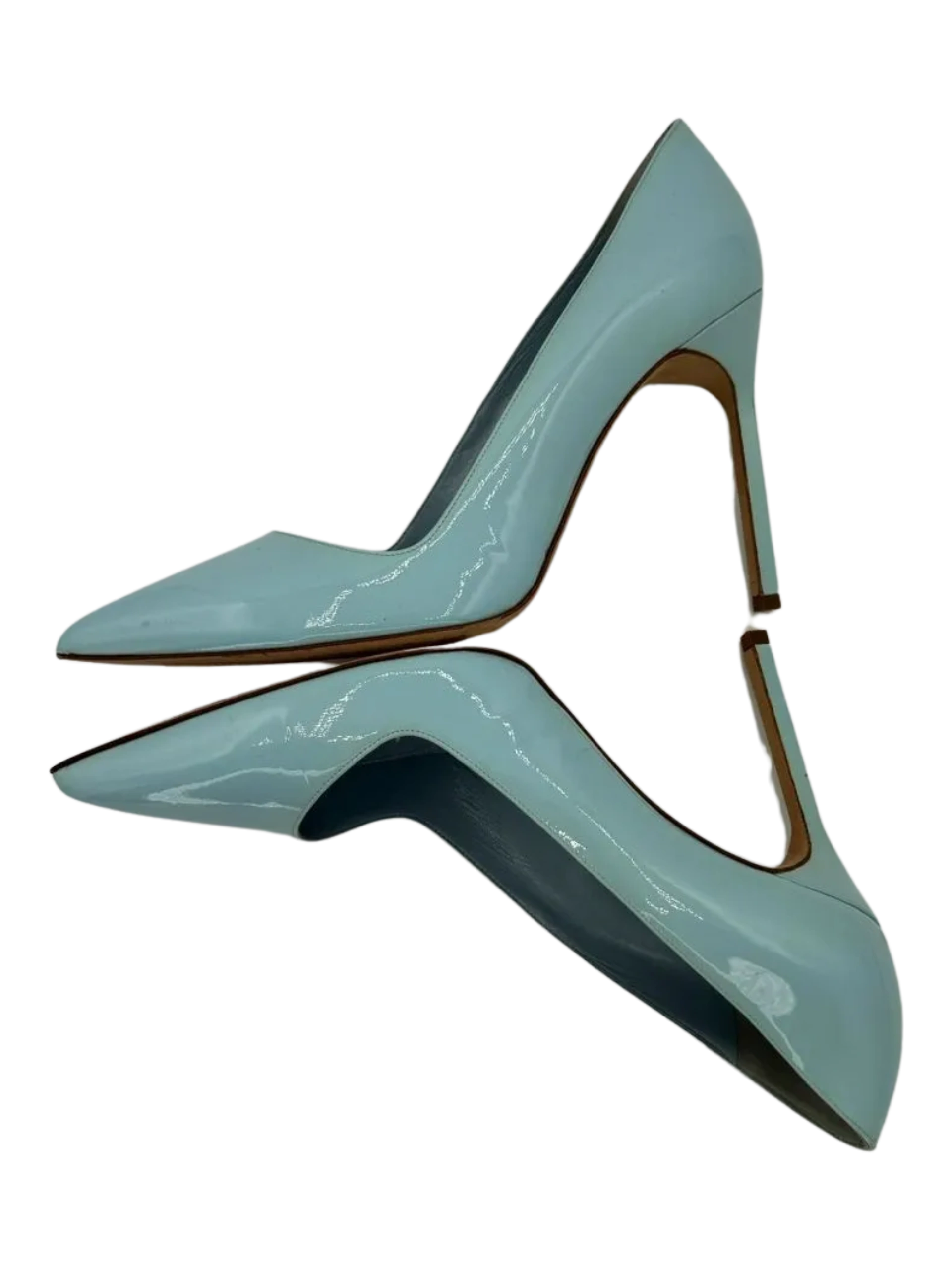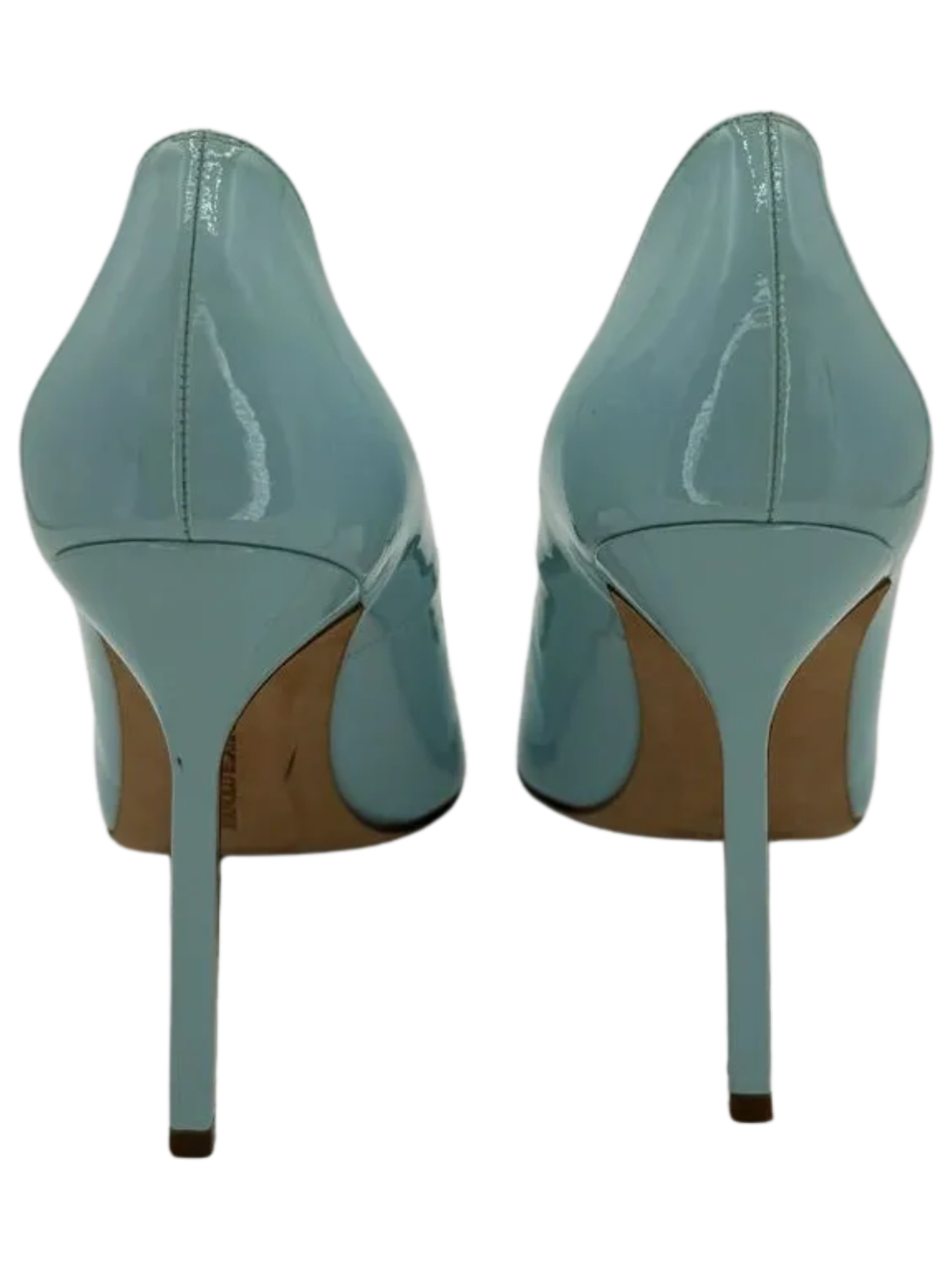 Light blue patent leather uppers,Self-covered heel, 4", Pointed toe, Leather lining and sole. Made in Italy. Size 39