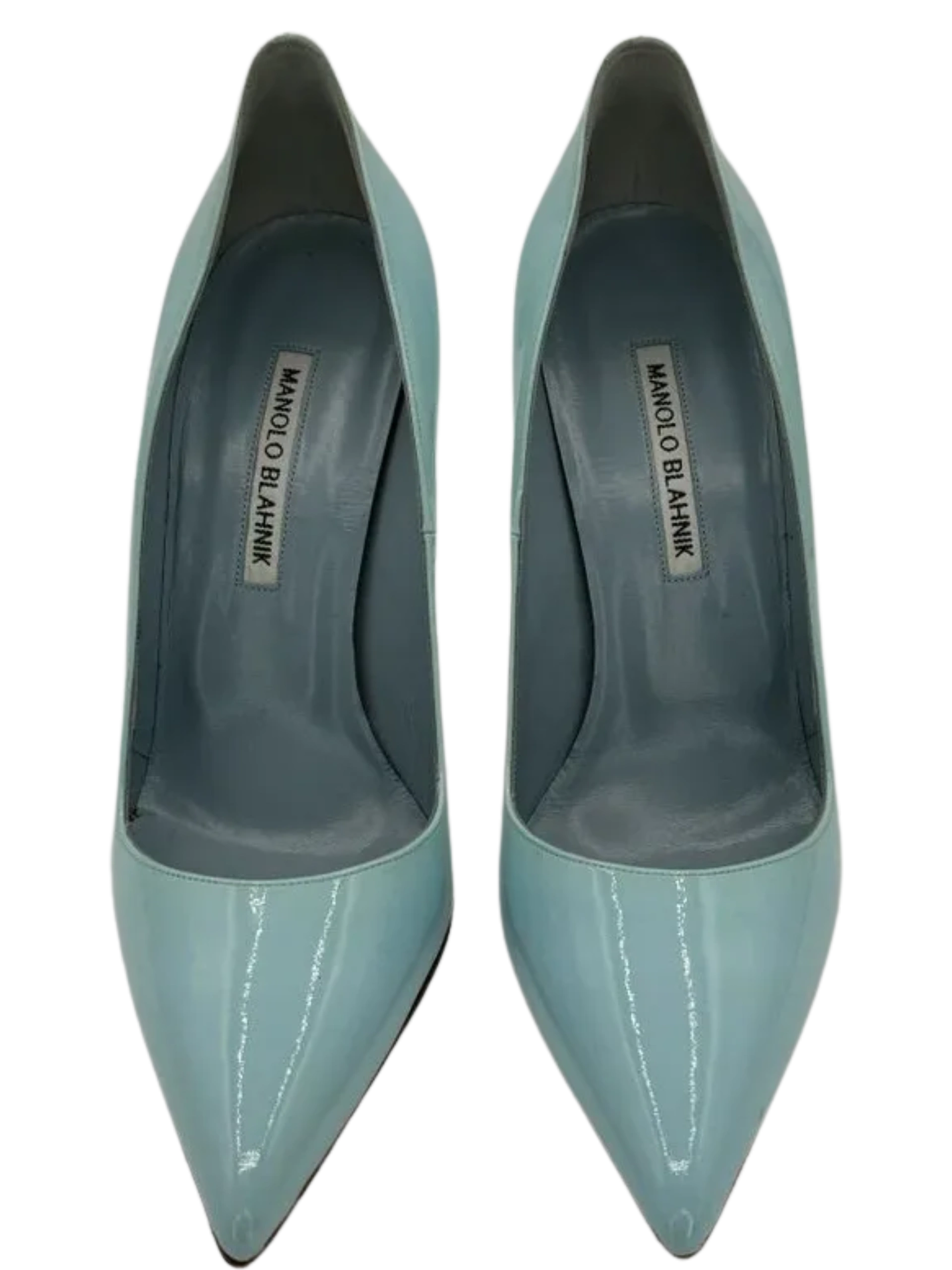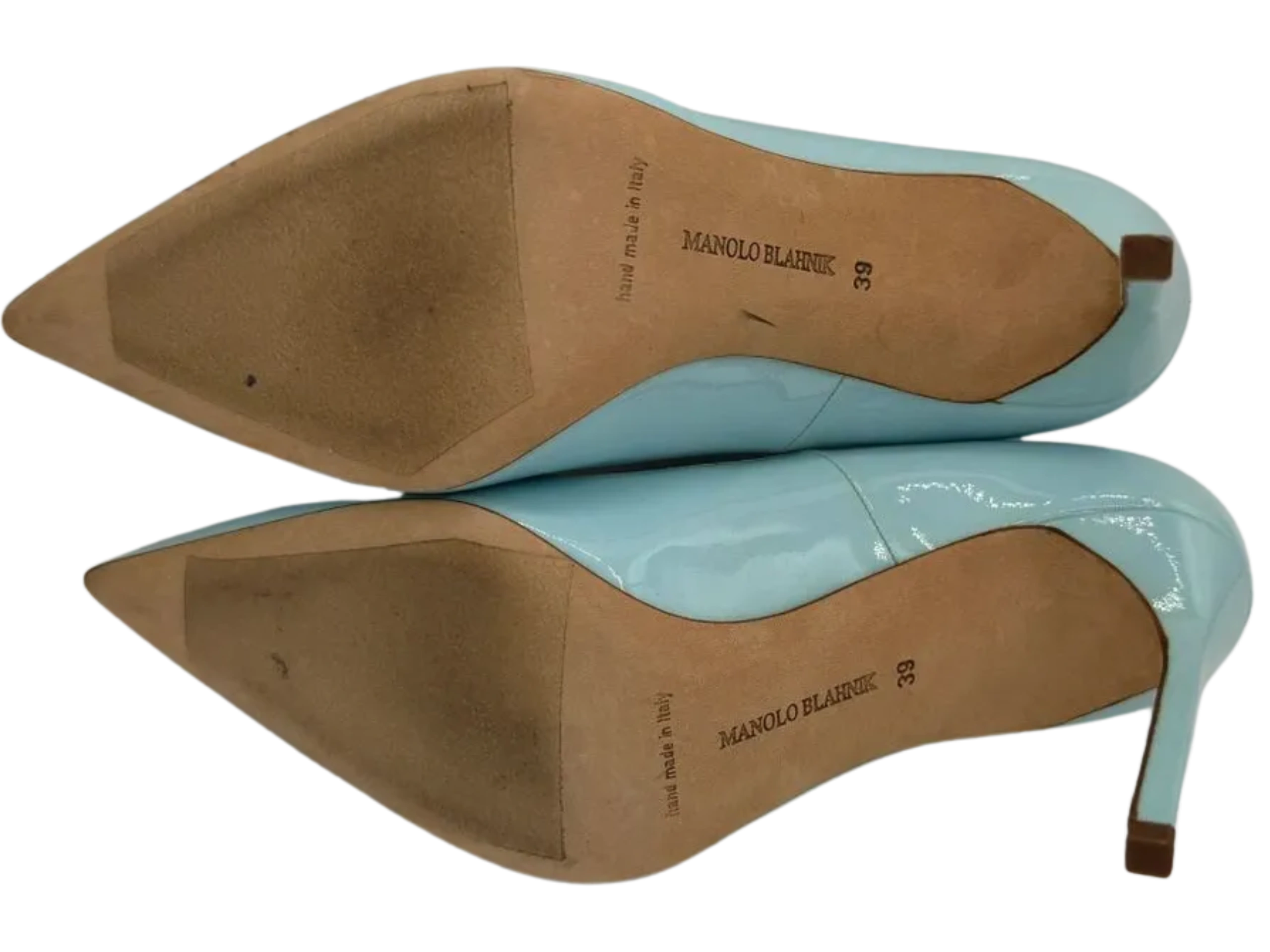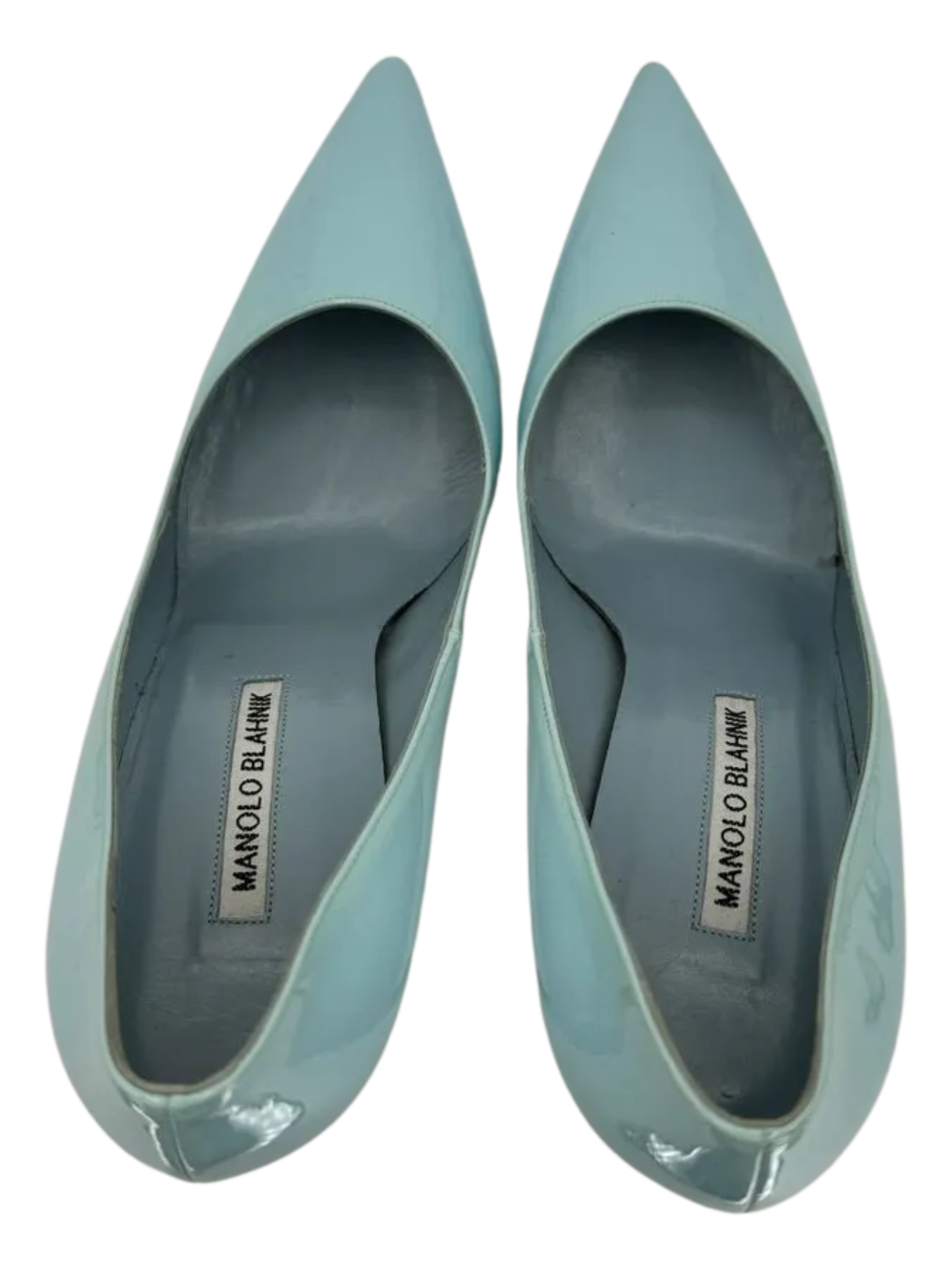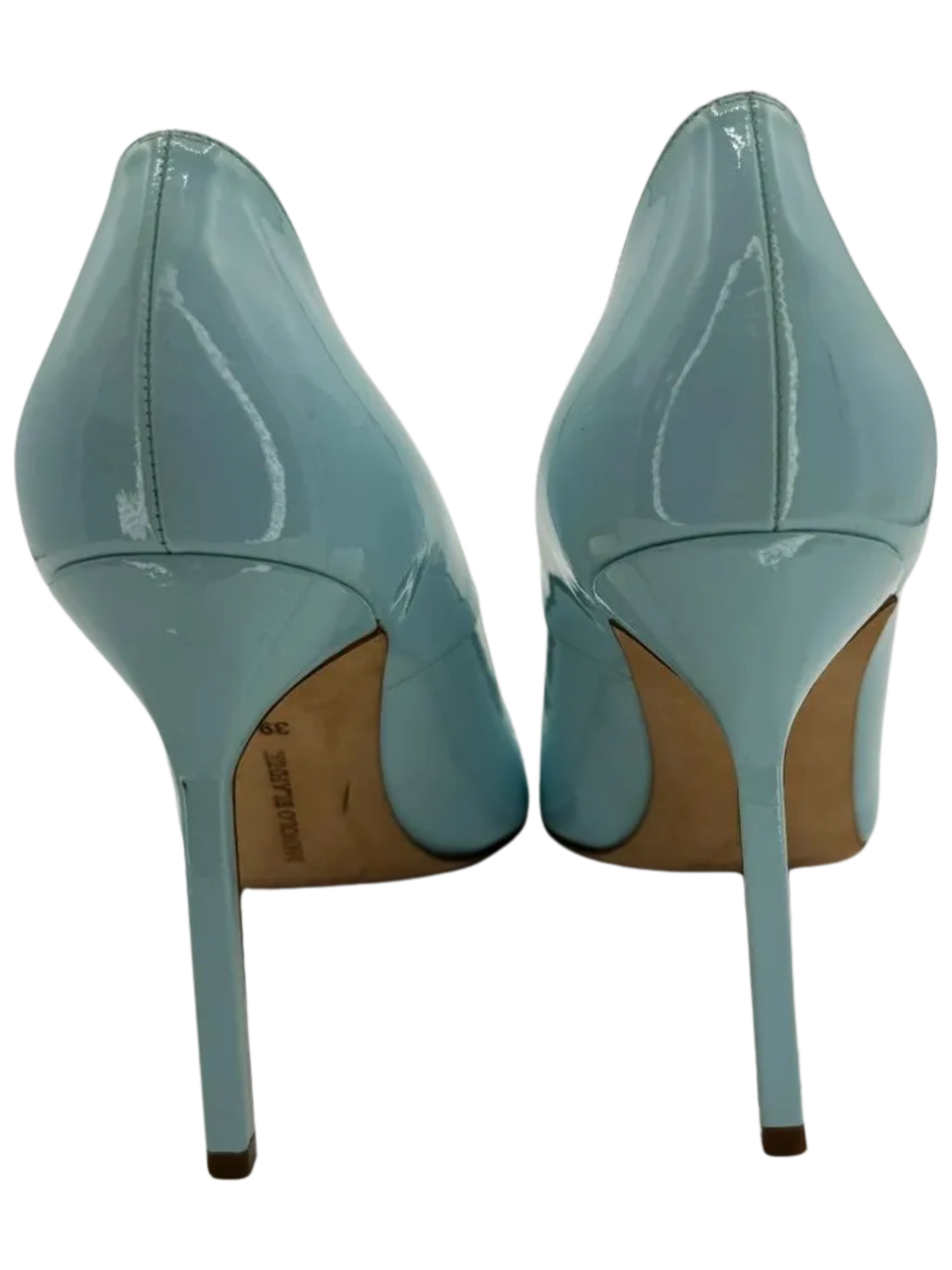 These Patent Pale Blue Manolo Blahnik BB pumps will instantly elevate your look in an effortlessly cool-yet-elegant way. A sharp pointed toe, leather lining and high stiletto heel complete the pair. Condition is very good, only light wear on soles.