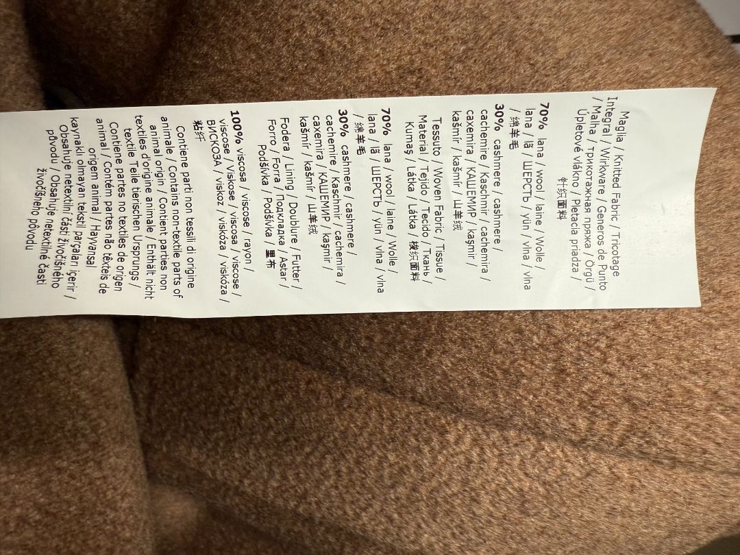 - Body: 70% Wool, 30% Cashmere