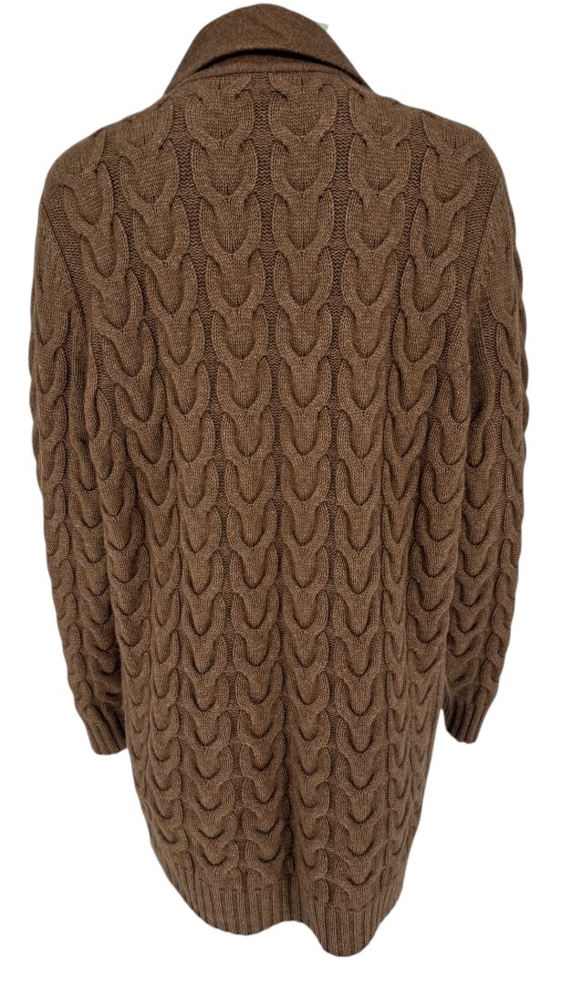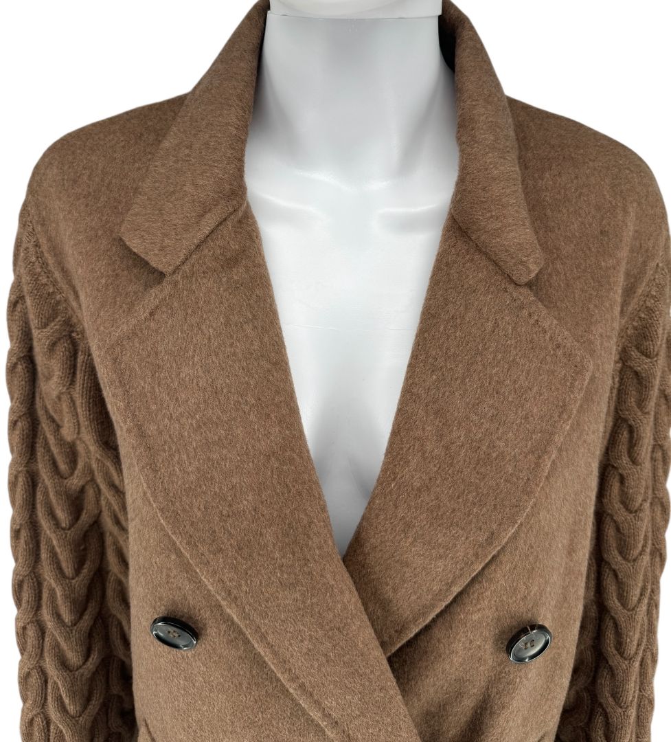 A striking blend of tailoring and texture, this MaxMara coat features a classic double-breasted wool body accented with exaggerated cable-knit sleeves and back panel for a cozy, sculptural finish. With its warm chestnut brown tone and relaxed, slightly oversized cut, this piece blends the structure of a blazer with the softness of a cardigan.