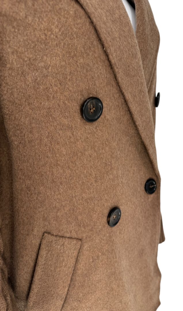 - Double-breasted front with four-button closure