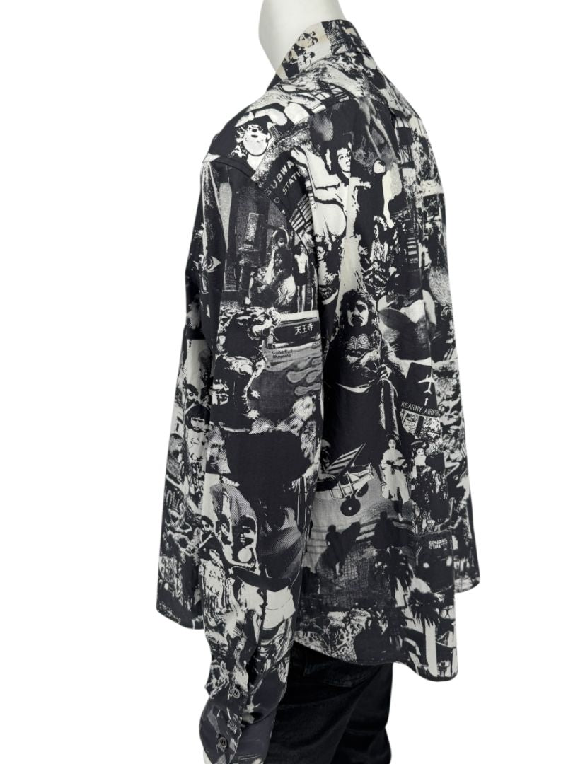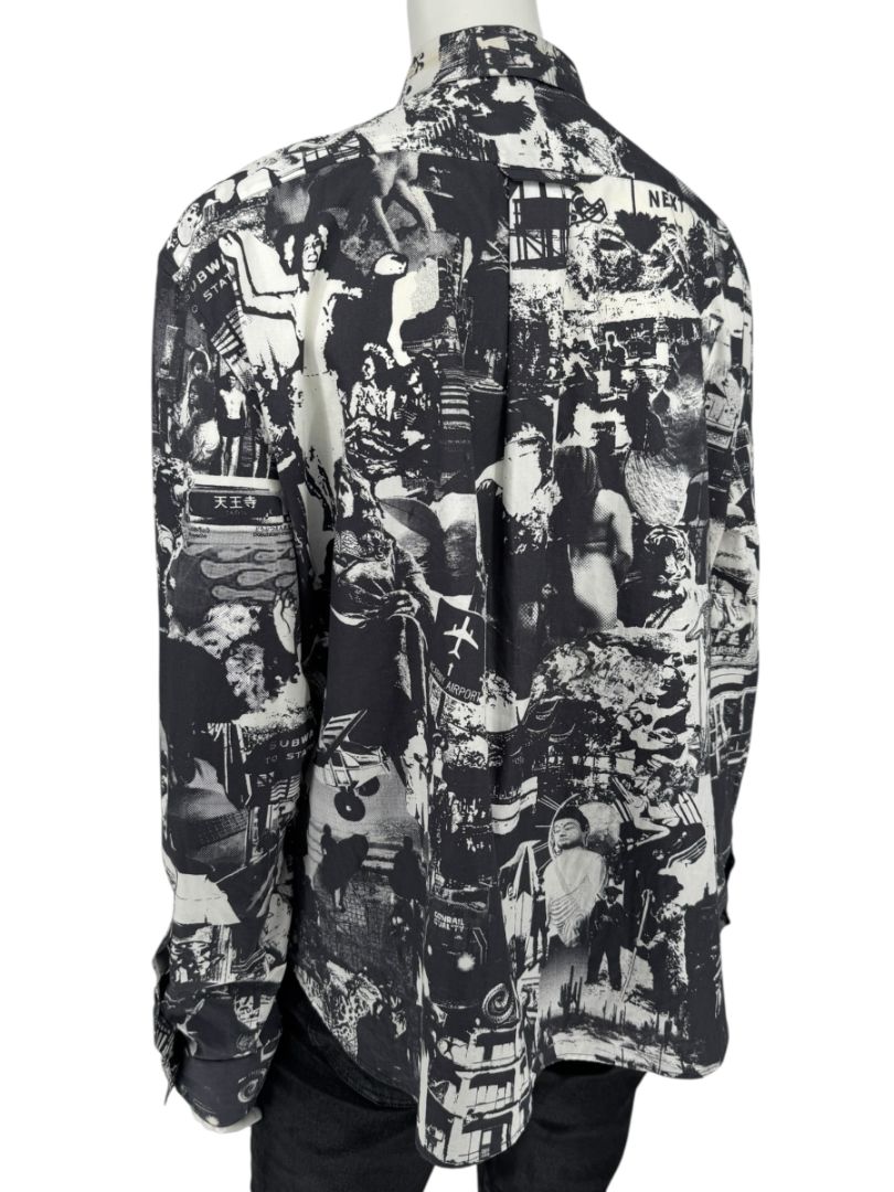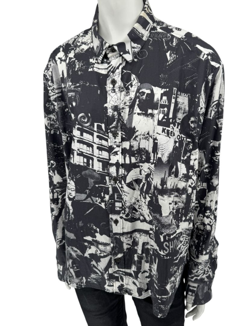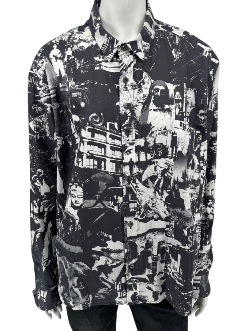 A striking piece from Alexander McQueen, this Italian-made shirt showcases the brand’s signature blend of art and rebellion. Crafted from 100% cotton, it features an all-over surrealist collage print in black and white, depicting vintage-inspired imagery and layered urban motifs. Designed with a classic spread collar, button front closure, and long sleeves with button cuffs, it captures McQueen’s avant-garde aesthetic while maintaining a refined silhouette.