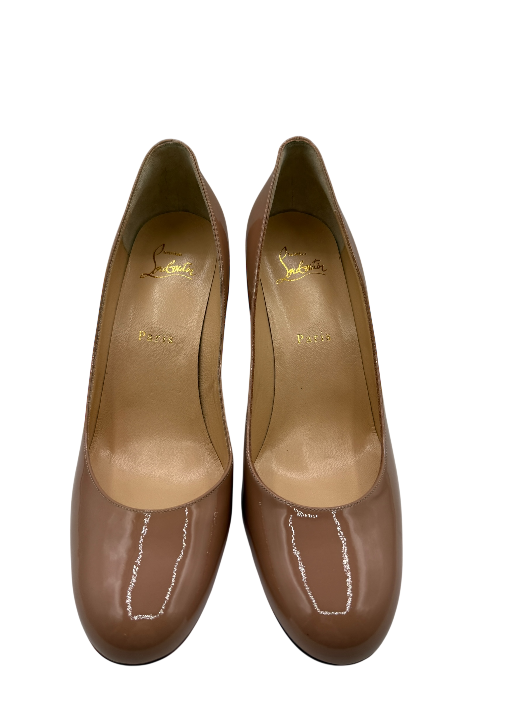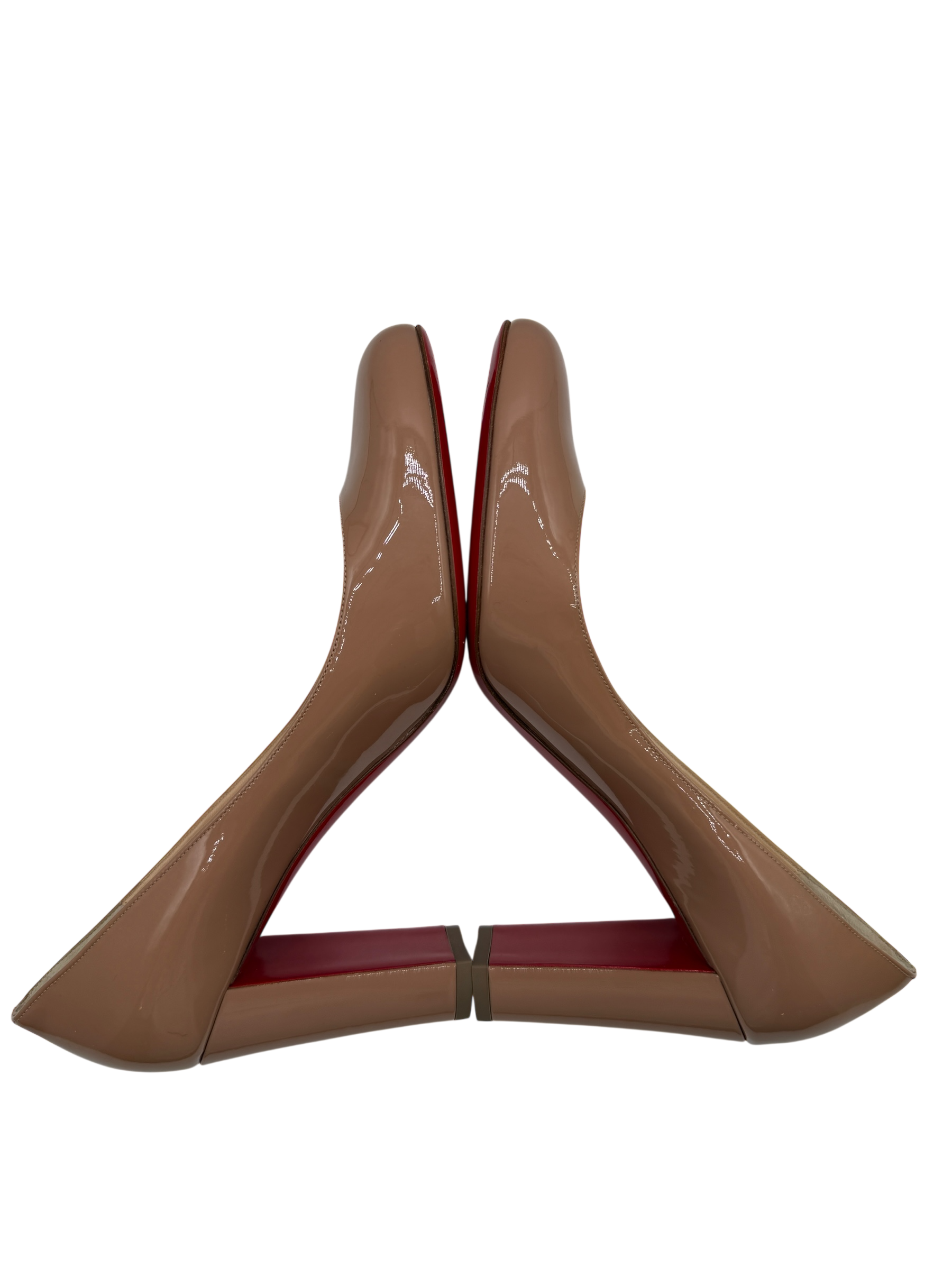An elegant and timeless silhouette from Christian Louboutin, the Gena 85 pump is crafted in glossy nude patent leather designed to elongate the leg and complement a wide range of looks. Finished with a classic rounded toe, slim mid-height heel, and the signature red lacquered sole, this style offers refined sophistication with everyday wearability. A versatile wardrobe essential that transitions seamlessly from office to evening.