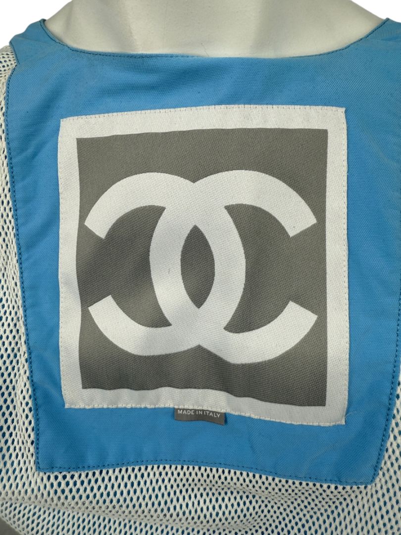 Sporty meets sophistication in this rare Chanel Identification sleeveless vest in sky blue cotton-blend canvas, accented with silver-tone hardware and classic CC logo details. The design features dual zip chest pockets, a front two-way zipper, and CC-engraved side snaps. Inside, a breathable white mesh lining reveals a bold oversized CC logo patch in grey and white—a signature Chanel statement of the early 2000s street-luxe era.