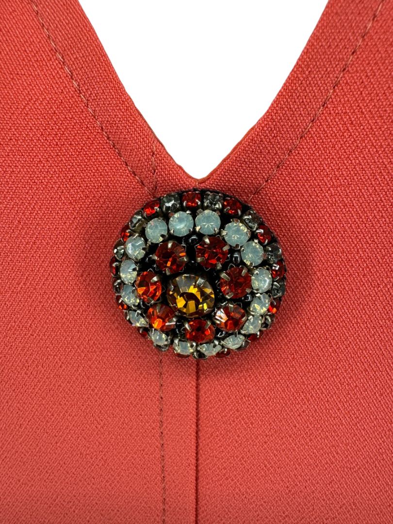 V-neckline with ornate beaded brooch