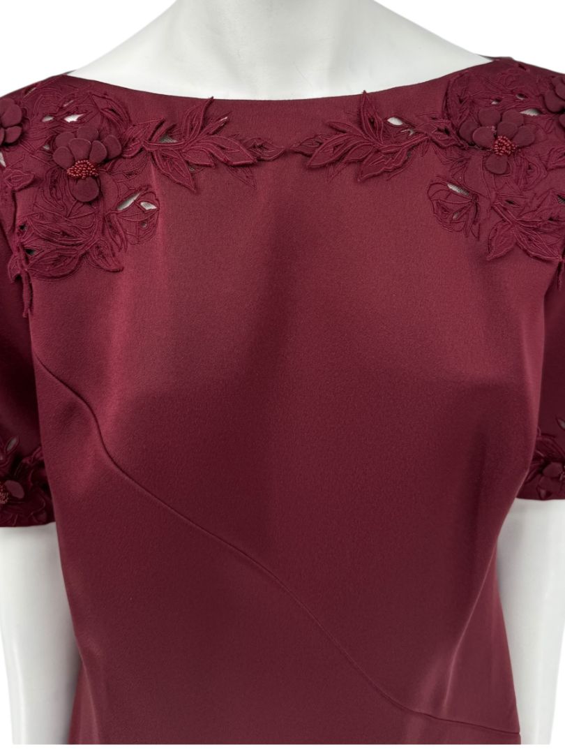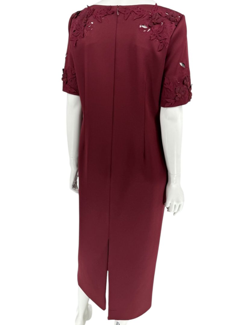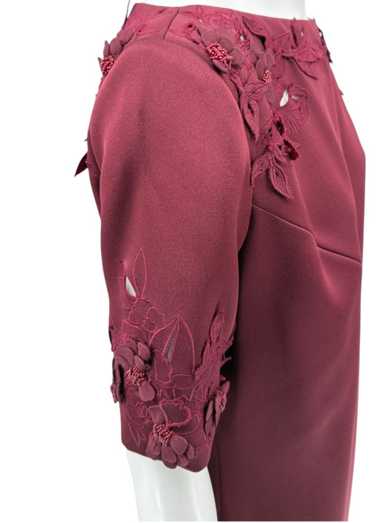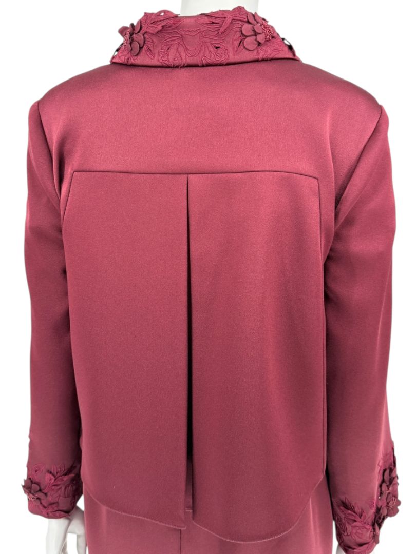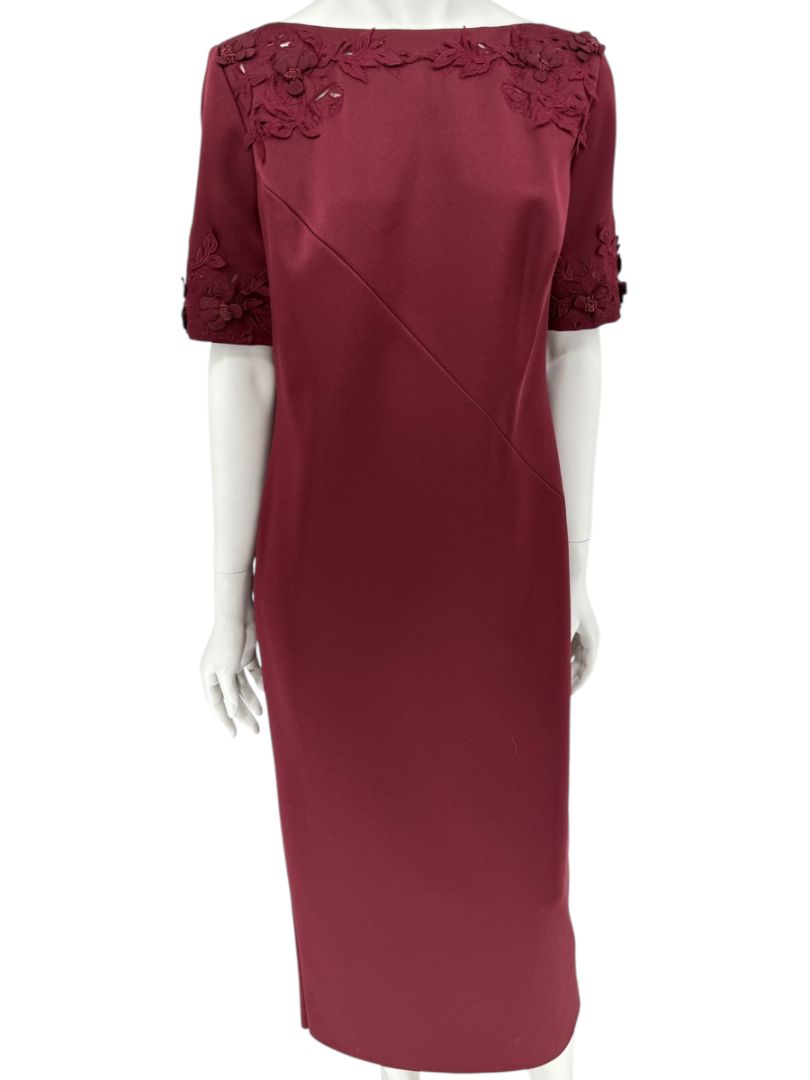 Pamella Roland’s refined craftsmanship shines through in this elegant two-piece set, composed of a tailored sheath dress and coordinating cropped overlay jacket. Rendered in a rich burgundy hue, the ensemble is elevated by dimensional floral appliqués and tonal beadwork at the collar and sleeve cuffs, adding a couture finish. The dress features short sleeves and a midi length with back vent for ease of movement, while the jacket layers effortlessly, fastening at the neckline with a covered button. This set embodies timeless evening sophistication with modern detailing.