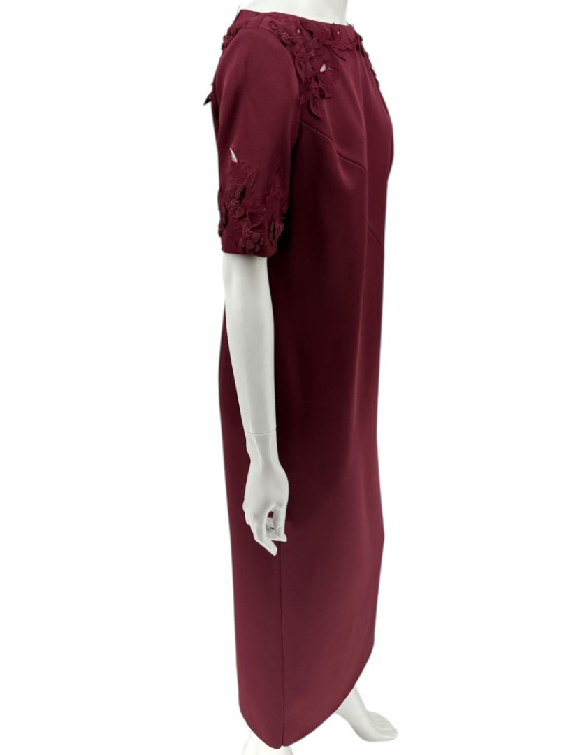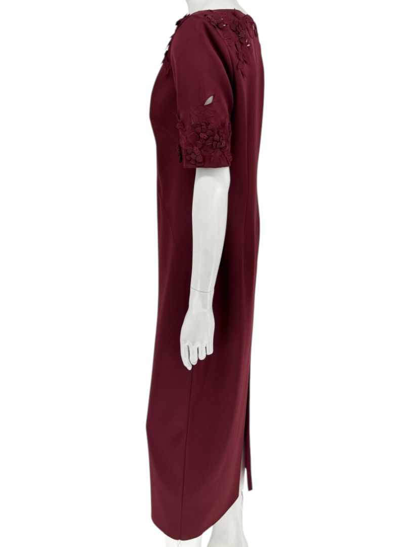 Dress: short sleeves with floral appliqué & beaded details, midi length, back vent