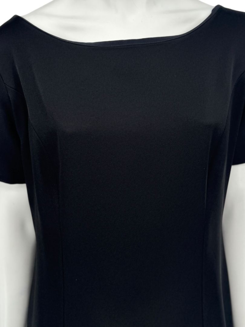 A masterclass in subtle drama, this Pamella Roland black shift dress features a graceful bateau neckline and short sleeves paired with an unexpected twist—an exposed full back button closure finished with oversized brushed gold buttons. The minimalist front is contrasted by the eye-catching rear detail, delivering balance, elegance, and a hint of vintage glam. Clean tailoring through the body creates a refined silhouette, with a softly structured drape that flatters without clinging. Unlined and mid-weight, this piece makes a strong statement without saying a word.