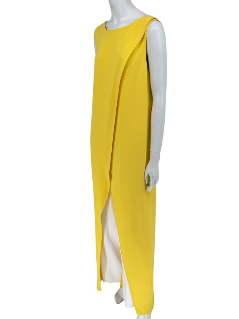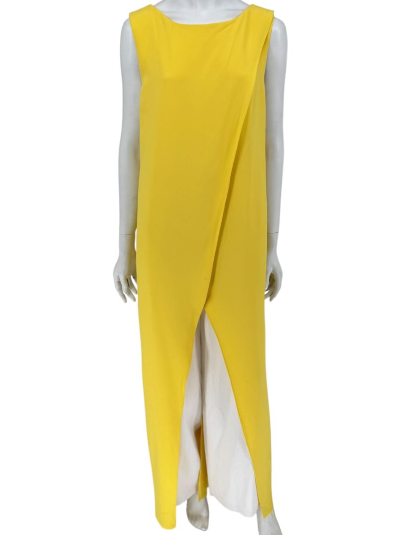 This striking sleeveless jumpsuit by Pamella Roland brings together bold color and elegant construction. Rendered in a vibrant yellow, it features a dramatic draped overlay panel at the front that opens to reveal wide-leg white trousers beneath, creating a sleek contrast and elongating effect. A bateau neckline and concealed back zip closure complete the minimalist yet impactful design. A standout evening or event-ready piece, blending clean tailoring with modern edge.