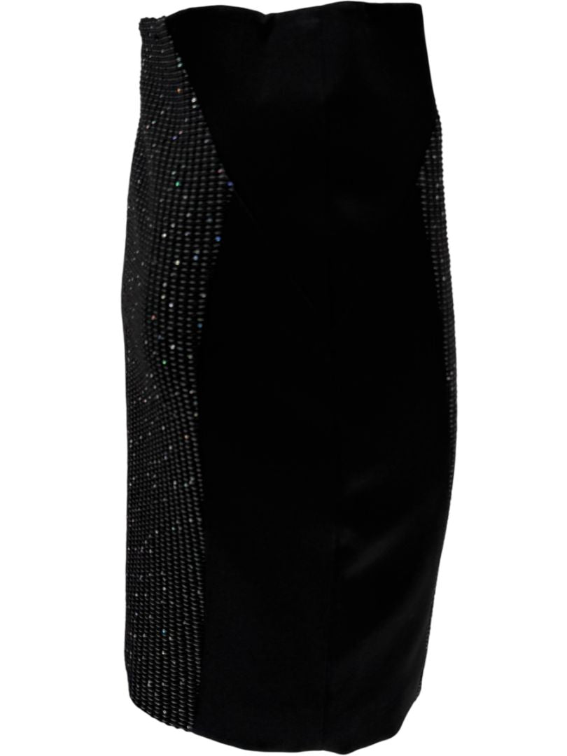 Sleek, structured, and subtly sparkling, this Pamella Roland pencil skirt features a rich woven front panel embedded with tonal sequins for a hint of shimmer. Side panels in smooth black fabric contour the silhouette, while a back vent adds ease of movement. This piece blends modern sophistication with quiet glamour, making it a standout for evening events or elevated day looks.