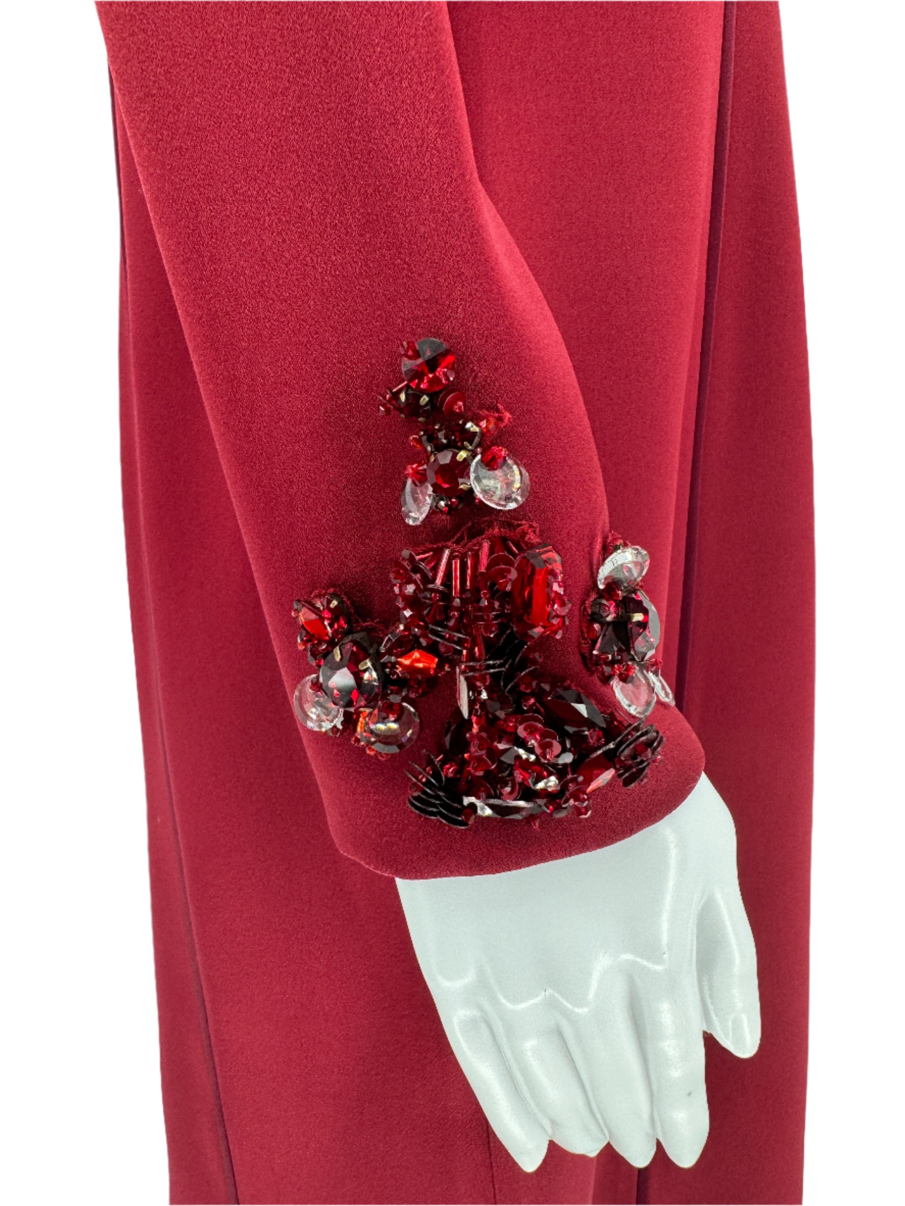 This dress is double faced duchess satin with a fitted silhouette and tonal trim. Long sleeves, off centered a-symmetrical V neckline and closed with hook and eye. Adorned with tonal beadwork in red, burgundy and clear Swarovski crystals. Seam detail in back with rear vent which is 8.5”. In great condition with no signs of wear. Inside seams are finished to perfection which lends to no need for lining.