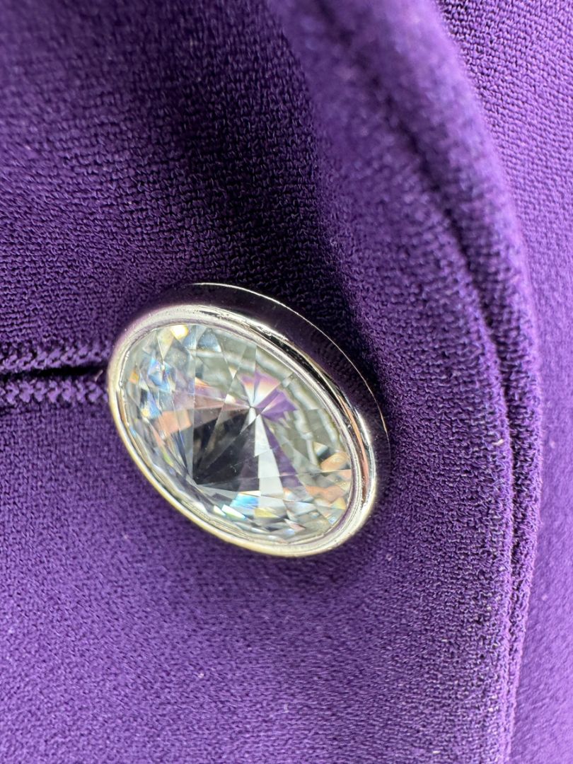 Excellent Pre-Owned Condition – This striking Pamella Roland set features a longline blazer and tapered trousers in a rich, royal purple hue. The blazer is tailored with a sharp notched lapel, crystal-embellished statement buttons, and a sleek back seam for a flattering silhouette. The coordinating trousers feature a slim, tapered cut with sharp front creases and a comfortable elastic waistband adorned with the Pamella Roland logo.