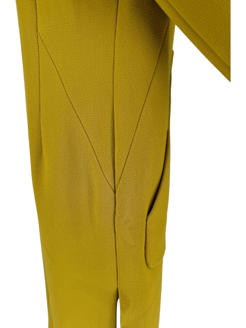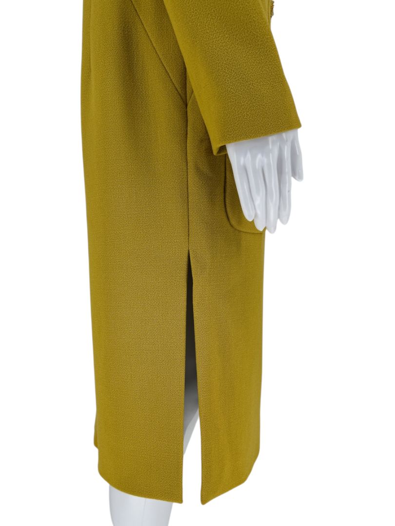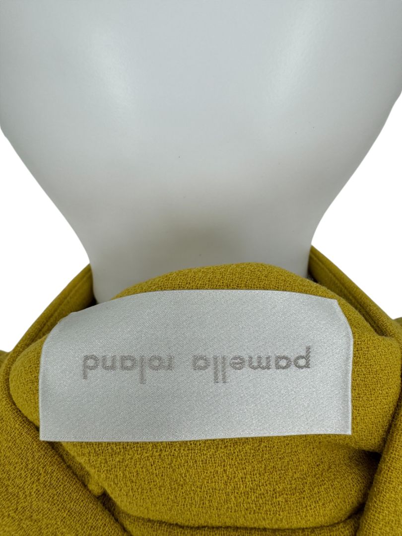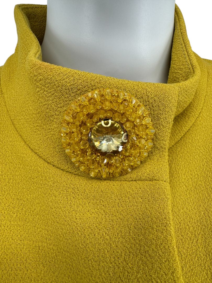 This Pamella Roland jacket turns heads in a rich mustard yellow hue. Crafted from a structured synthetic or blended crepe-like fabric, the design features clean architectural lines, Long sleeves, and a dramatic standing neckline for sculptural impact.