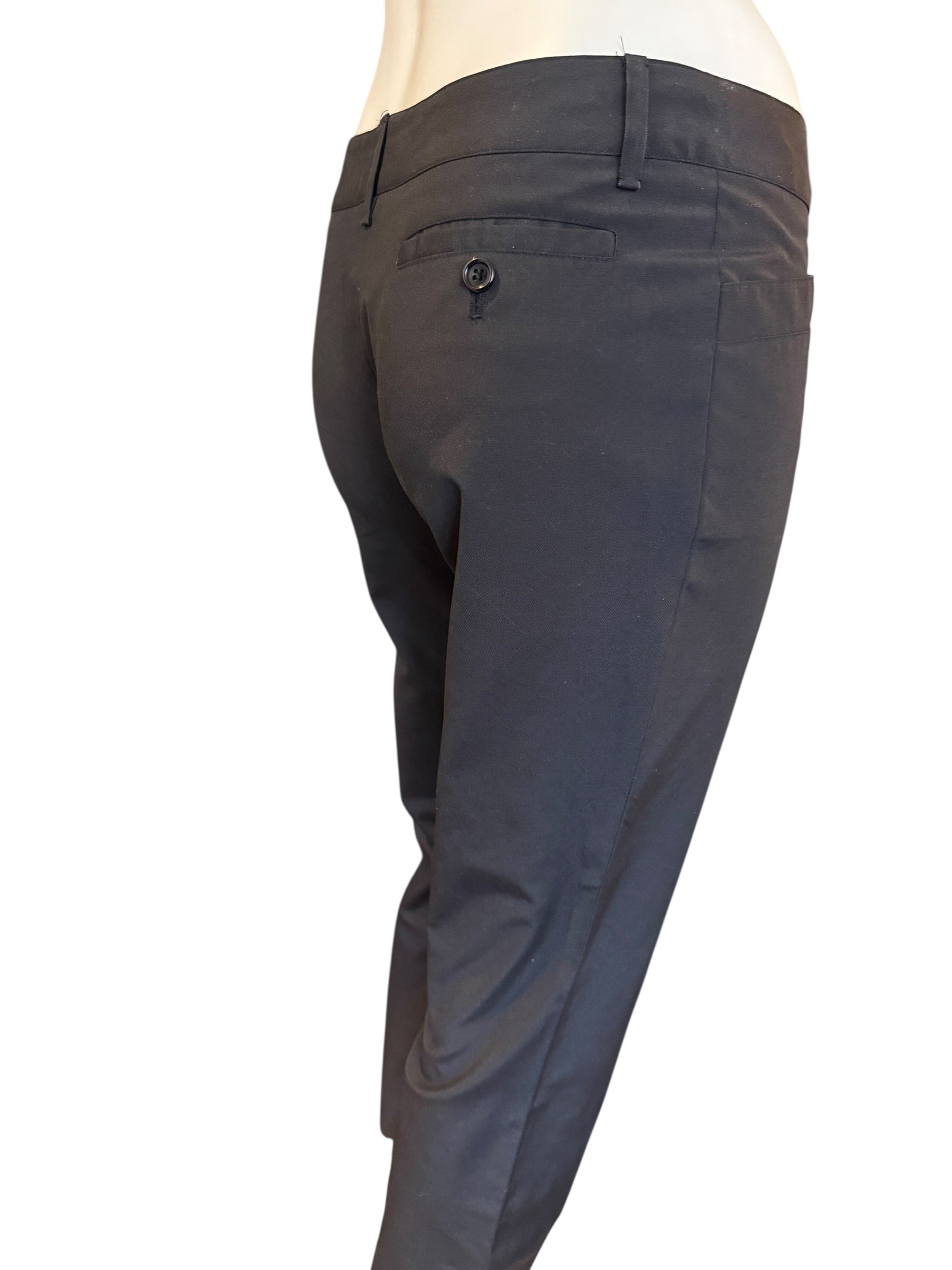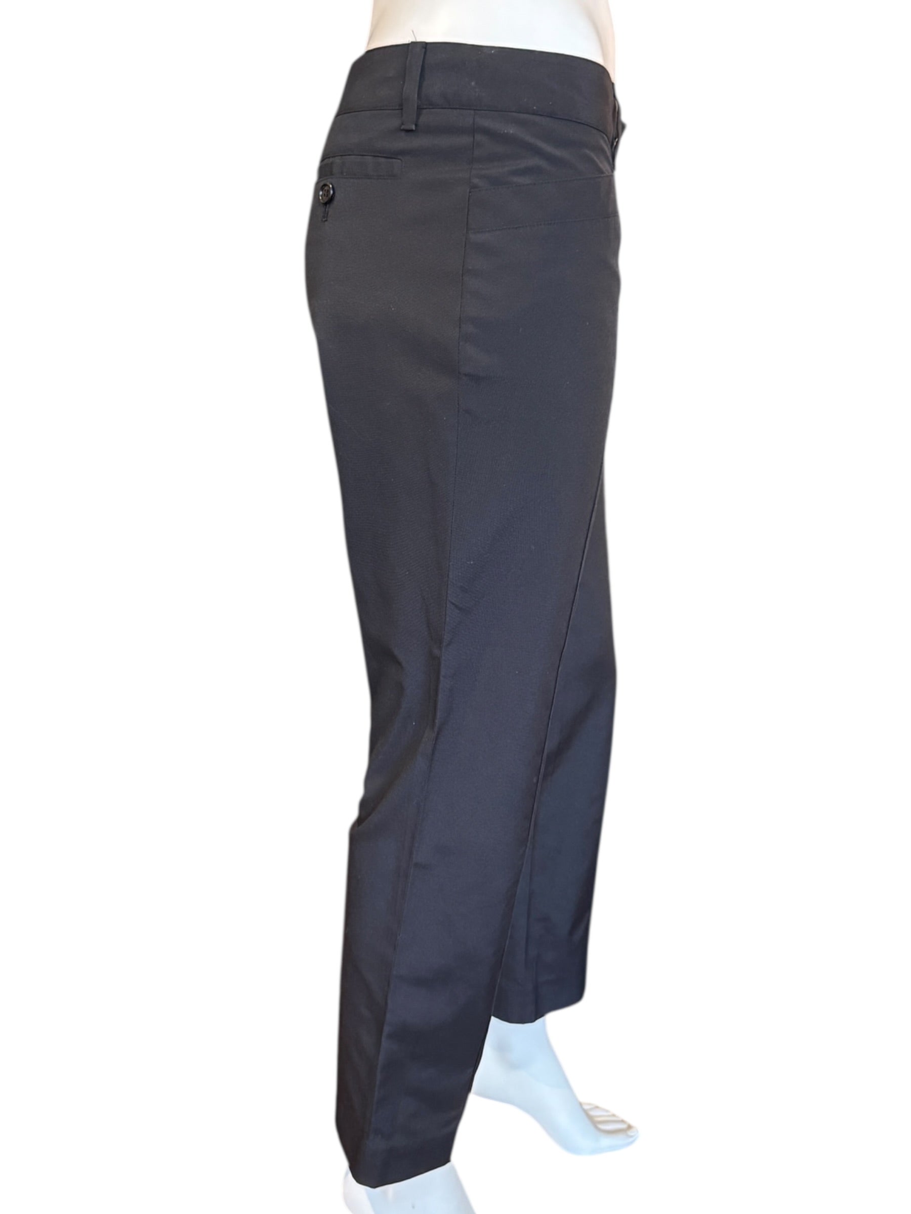 Very good pre-owned condition. Classic Prada tailored trousers in sleek black with a flattering slim, straight-leg silhouette. Crafted in Italy, these pants feature a mid-rise waist with belt loops, zip fly with button closure, and subtle seaming details that elongate the leg. Clean front with minimalist tailoring, side seam pockets, and a single back welt pocket with button closure. The structured yet lightweight fabric gives a polished finish, making them ideal for office wear, evening styling, or elevated everyday looks. Timeless, versatile, and effortlessly chic — a wardrobe staple that pairs beautifully with blazers, silk blouses, or a fitted knit.