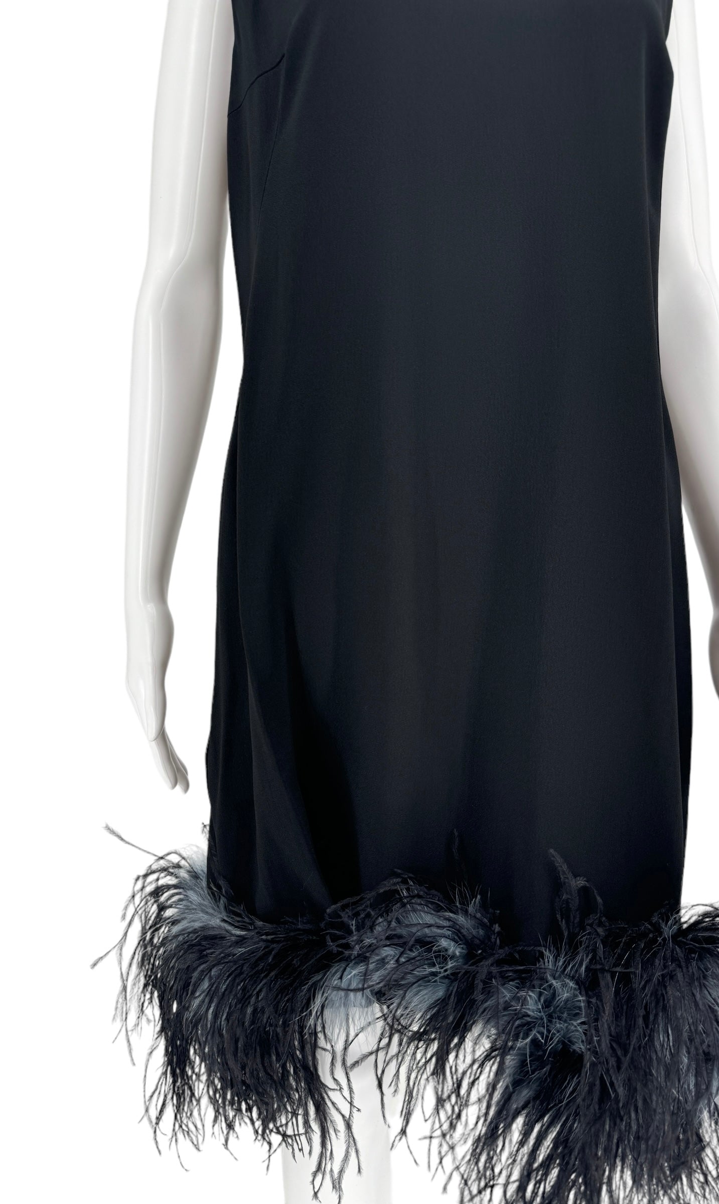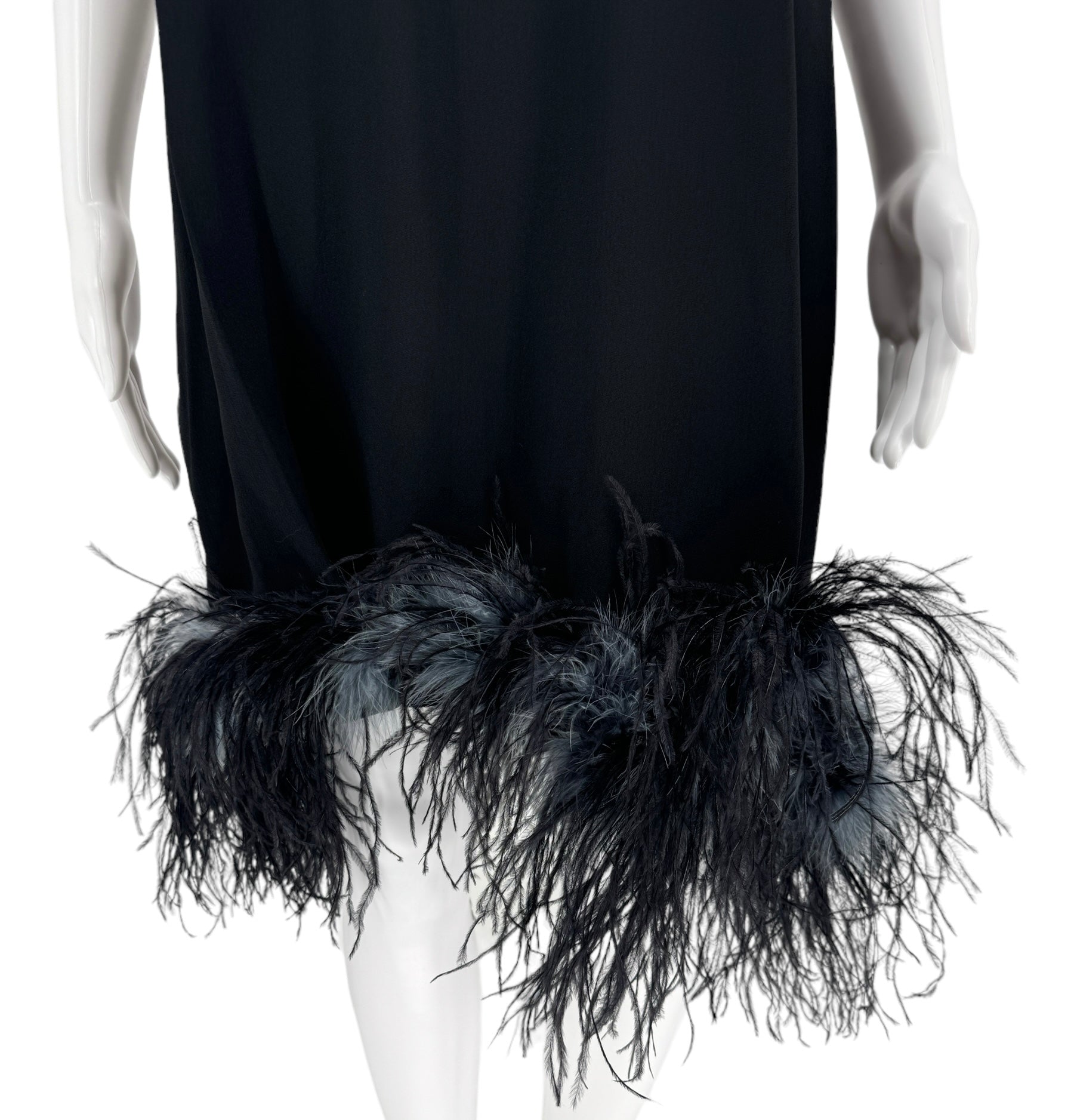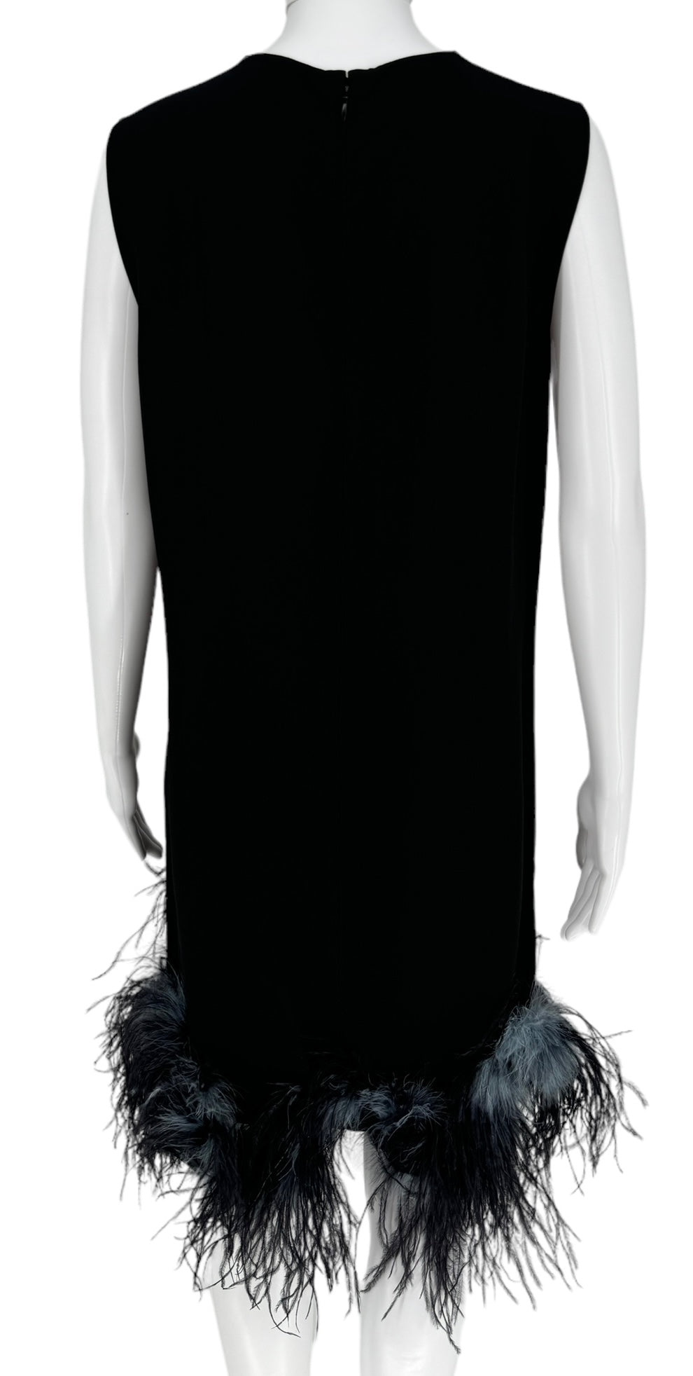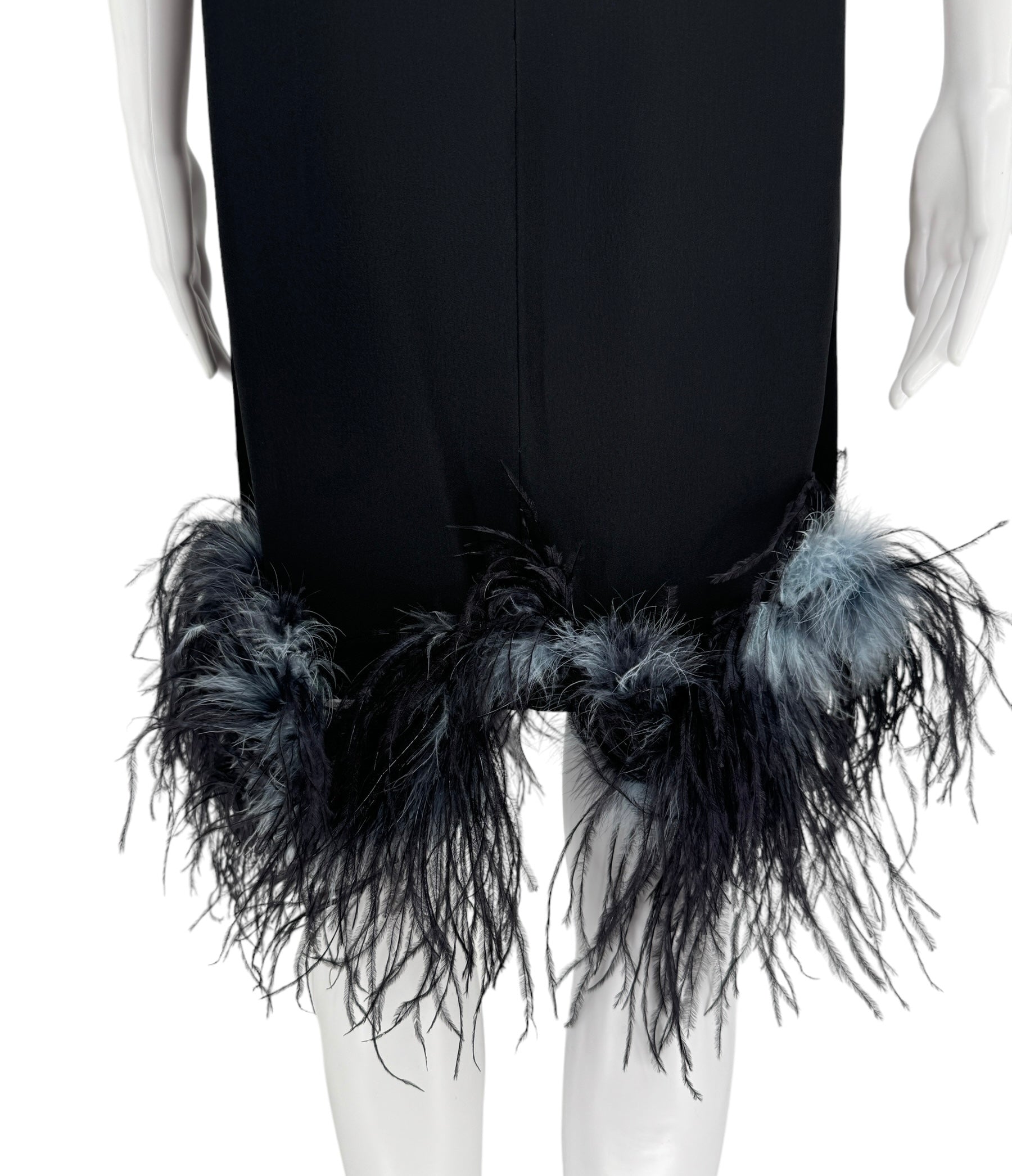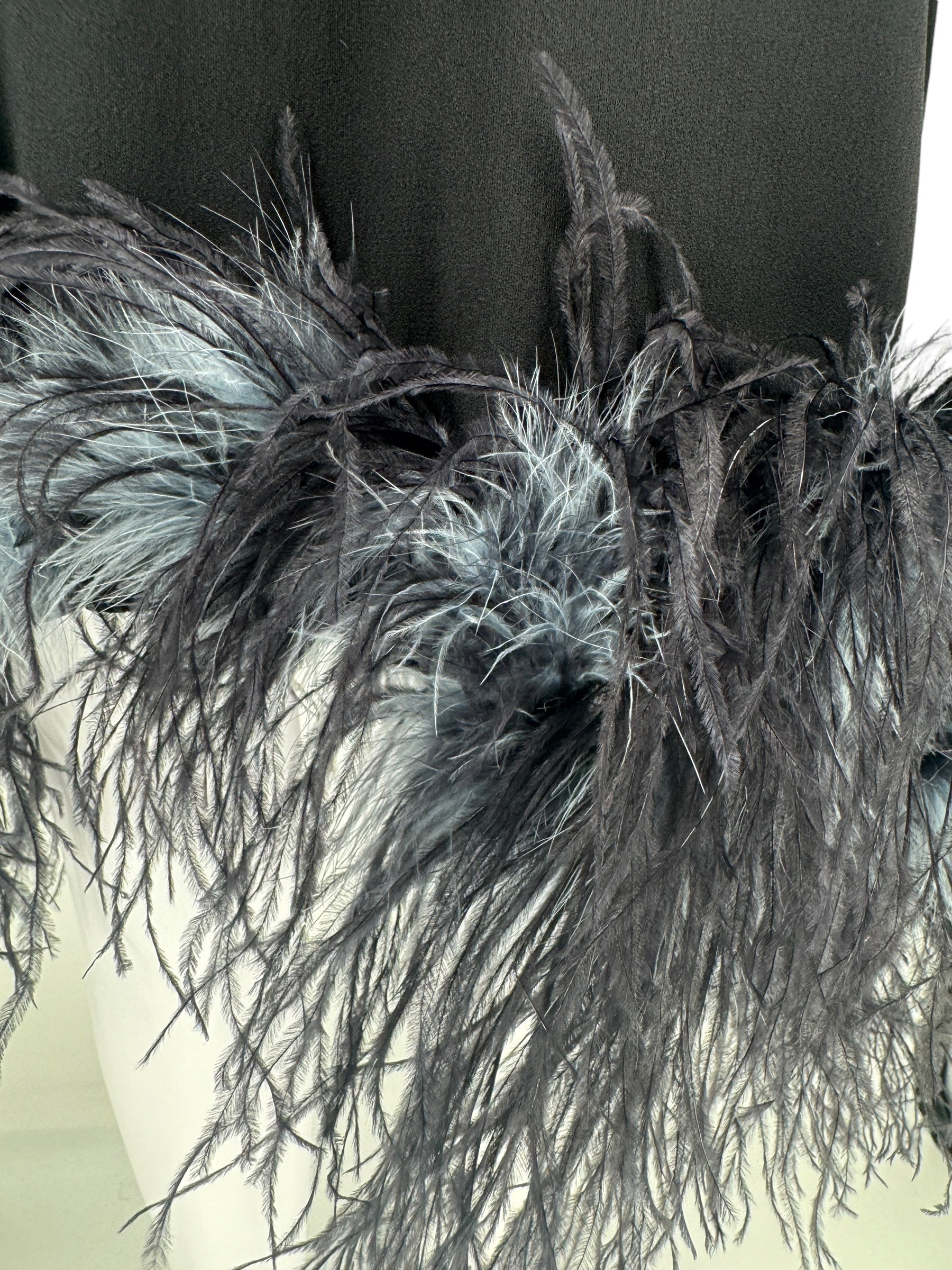 This stunning sleeveless Ostrich fur trimmed dress is the ultimate statement piece. Black Crepe de Chine fabric, boned lush feathers are a blend of soot black, midnight navy and pigeon blue that finish the bottom of the dress. Round neckline two darts at bust. Condition - Very Good - No notable signs of wear. Size 44
