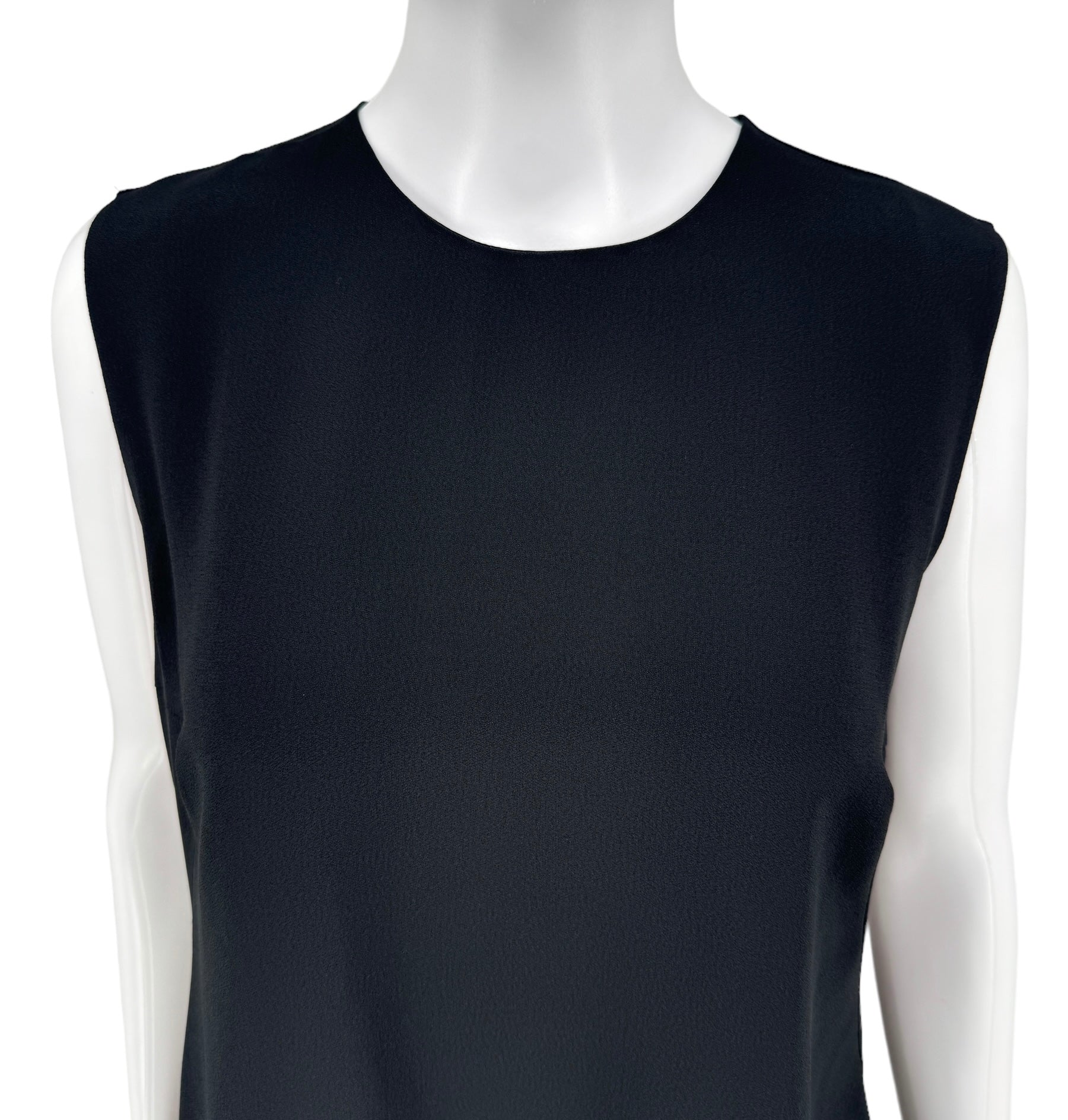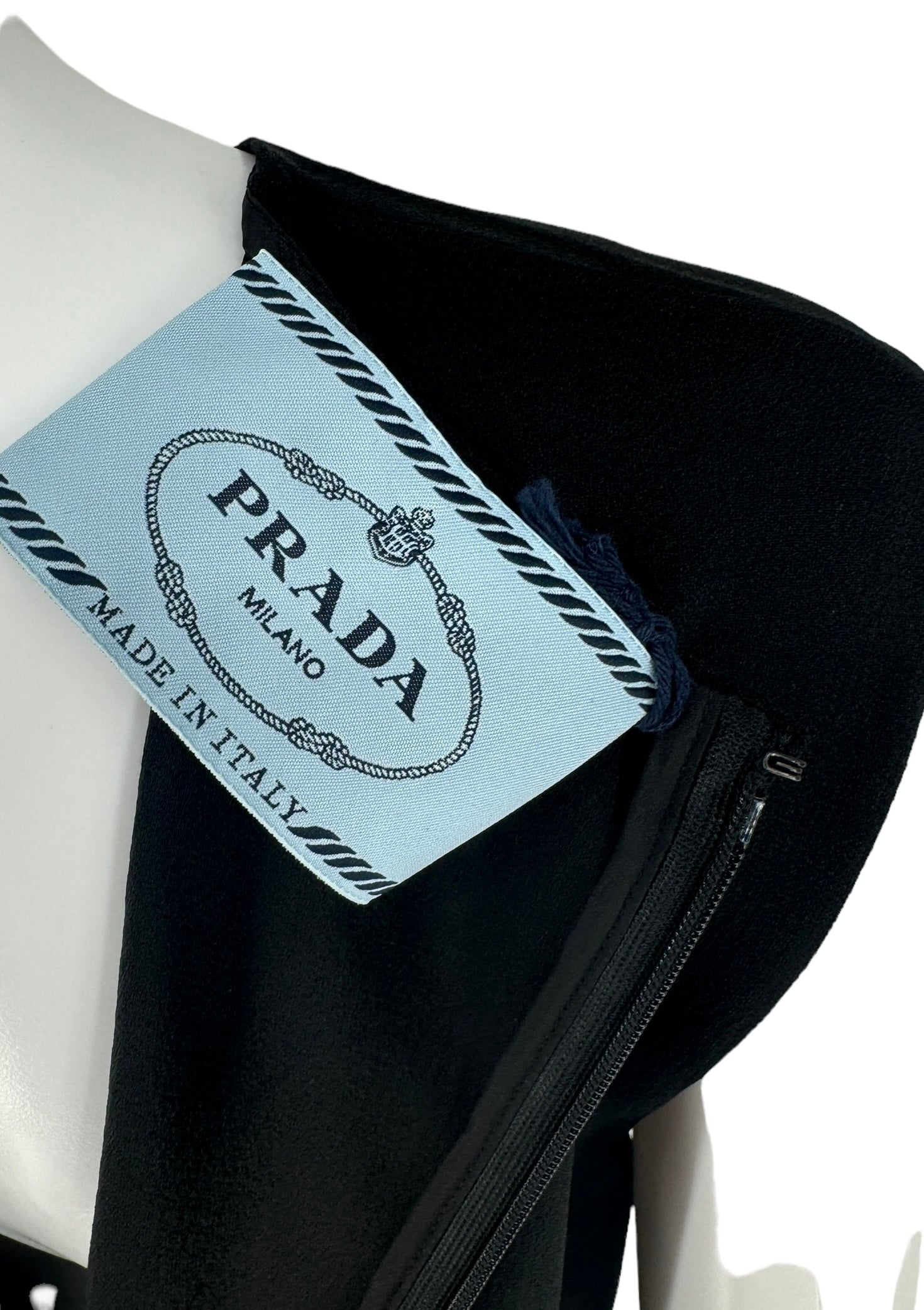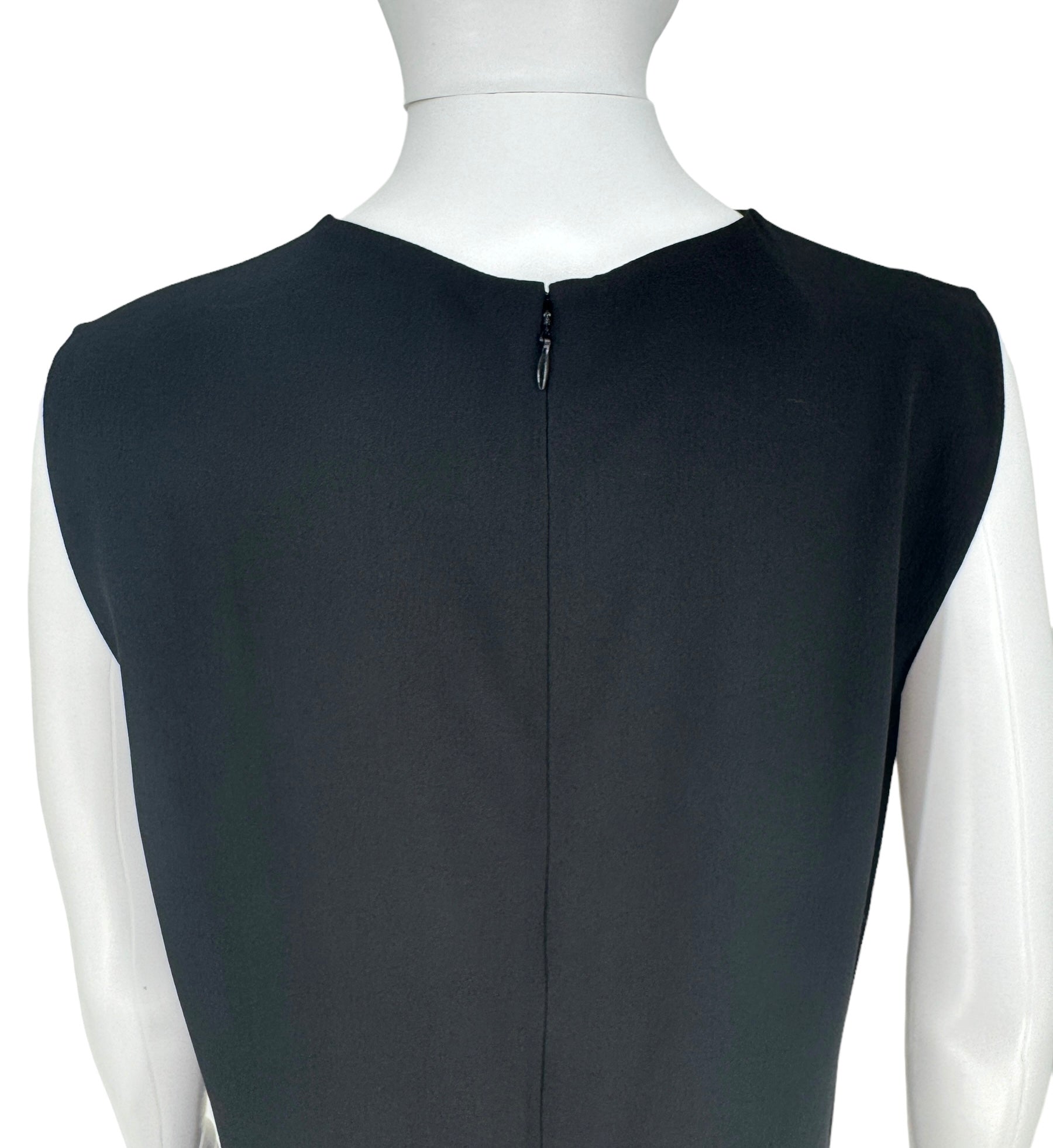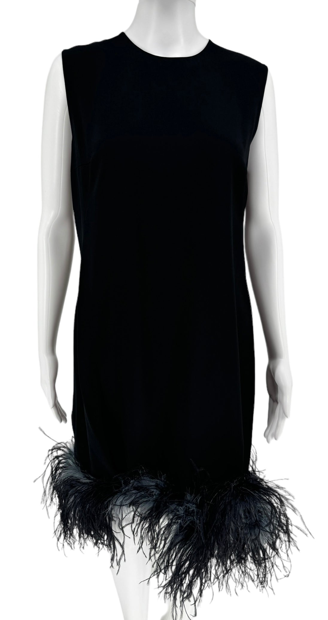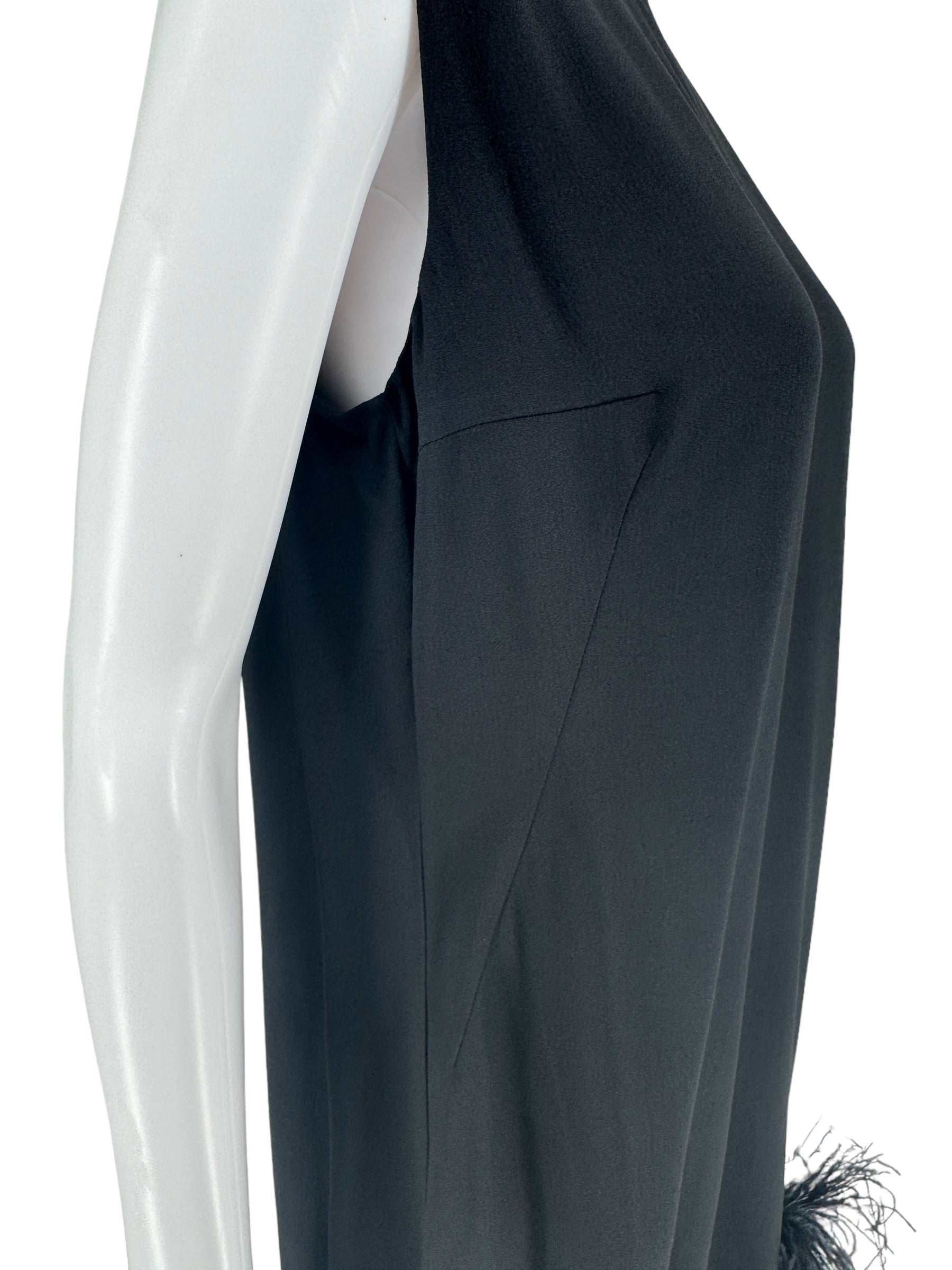 This stunning sleeveless Ostrich fur trimmed dress is the ultimate statement piece. Black Crepe de Chine fabric, boned lush feathers are a blend of soot black, midnight navy and pigeon blue that finish the bottom of the dress. Round neckline two darts at bust. Condition - Very Good - No notable signs of wear. Size 44