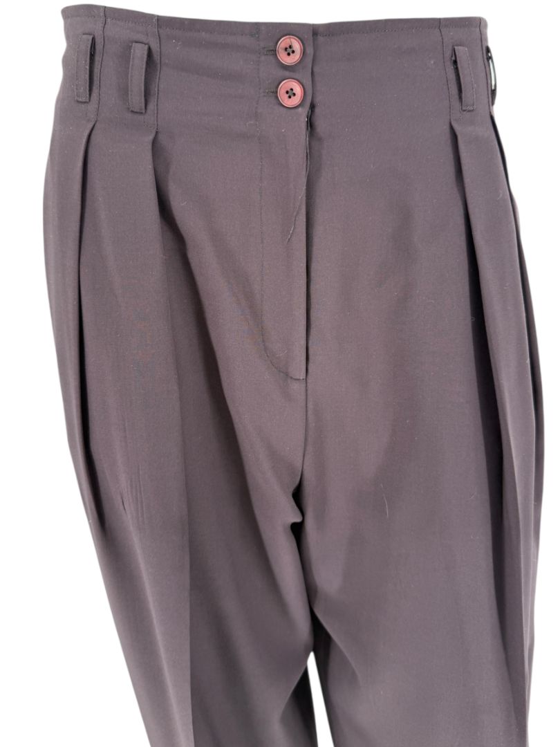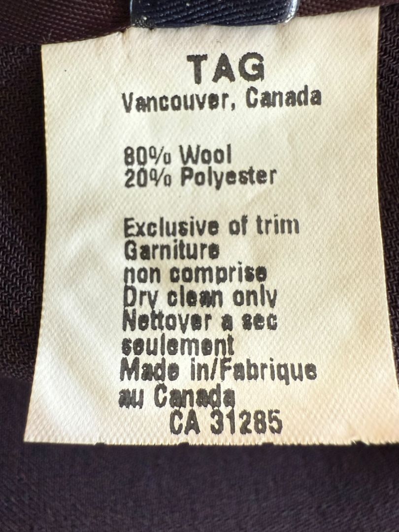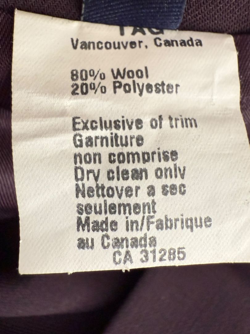 This sophisticated Ron Leal ensemble is a beautifully constructed Canadian-made set featuring a long-sleeve top with an attached sculptural drape and matching pleated trousers. Crafted from an 80% wool / 20% polyester blend, the outfit offers a fluid, structured silhouette with a luxurious hand feel. Its deep aubergine-plum tone adds refinement and versatility—ideal for formal events, special occasions, or elevated professional wear.