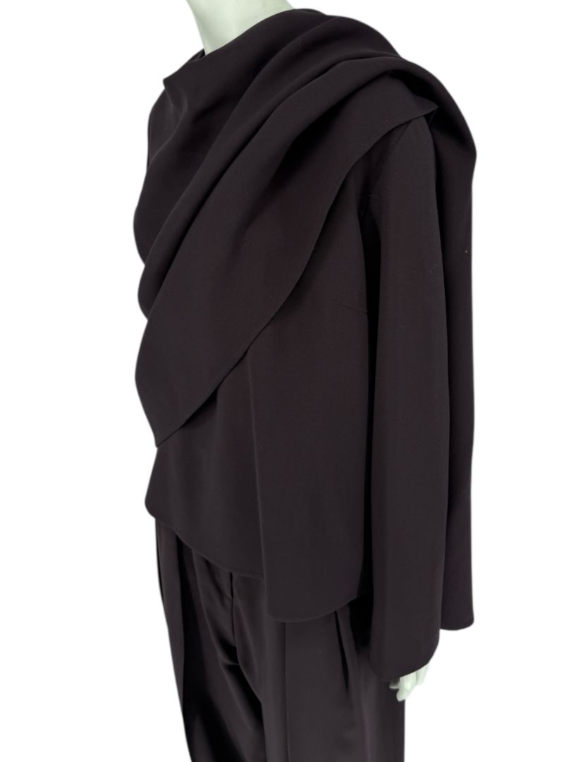 The top showcases Ron Leal’s signature modern minimalism, designed with a clean crew neckline and a dramatic asymmetrical cascade overlay that wraps across the front and back for architectural elegance. Matching trousers complete the set with a pleated front, tapered straight-leg shape, and a clean button-tab waist closure.