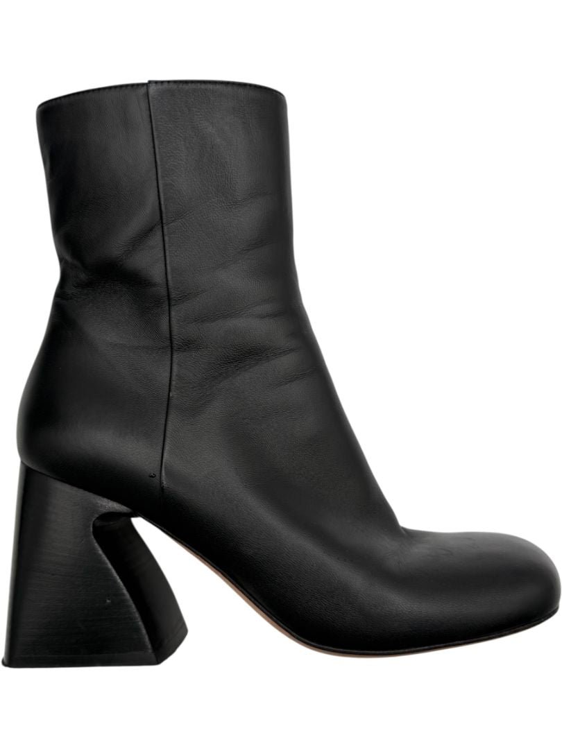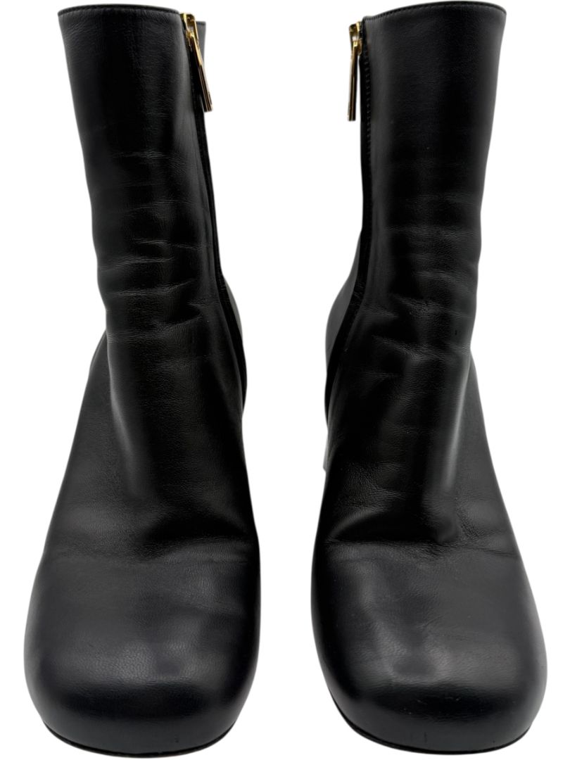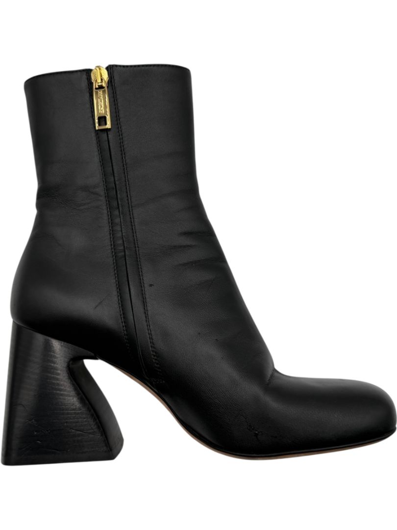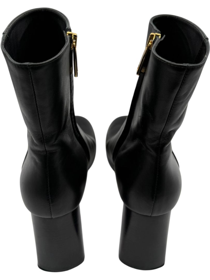 These structured black leather boots feature a modern square toe and architectural flared heel. Finished with golden zipper hardware and clean, minimalist lines, they strike a balance between everyday utility and bold design. The leather soles show light wear, with clean uppers and no major flaws.
