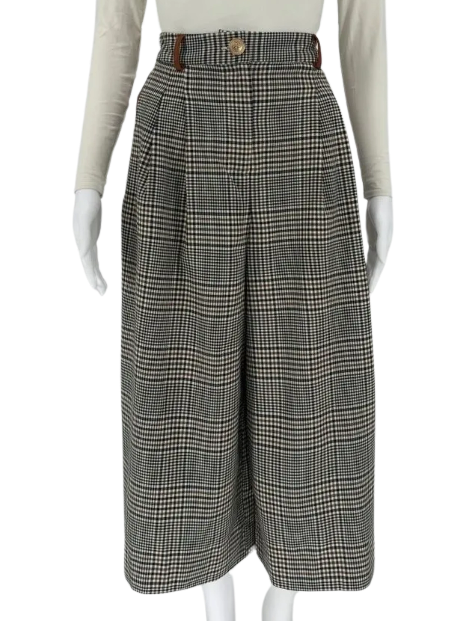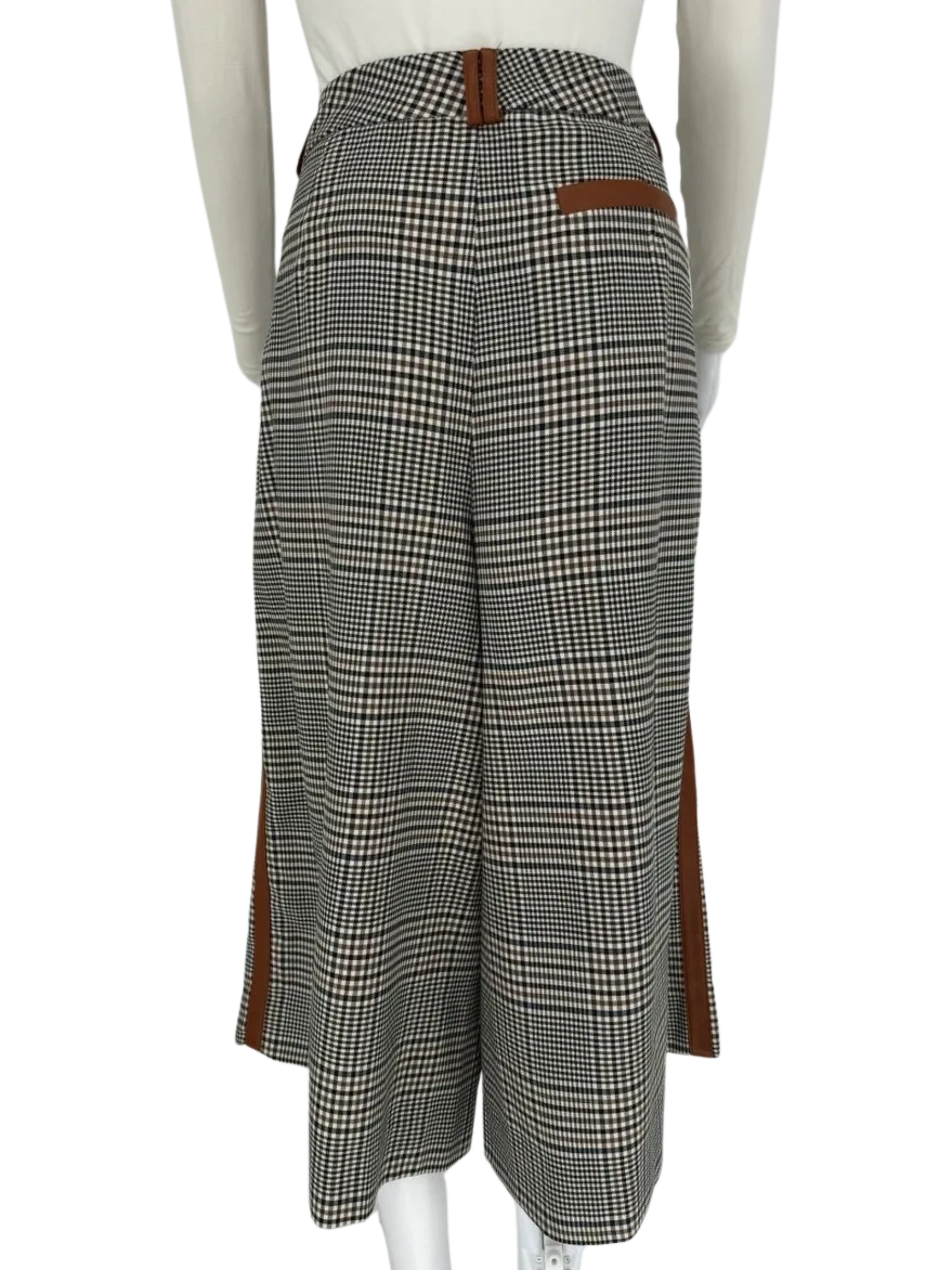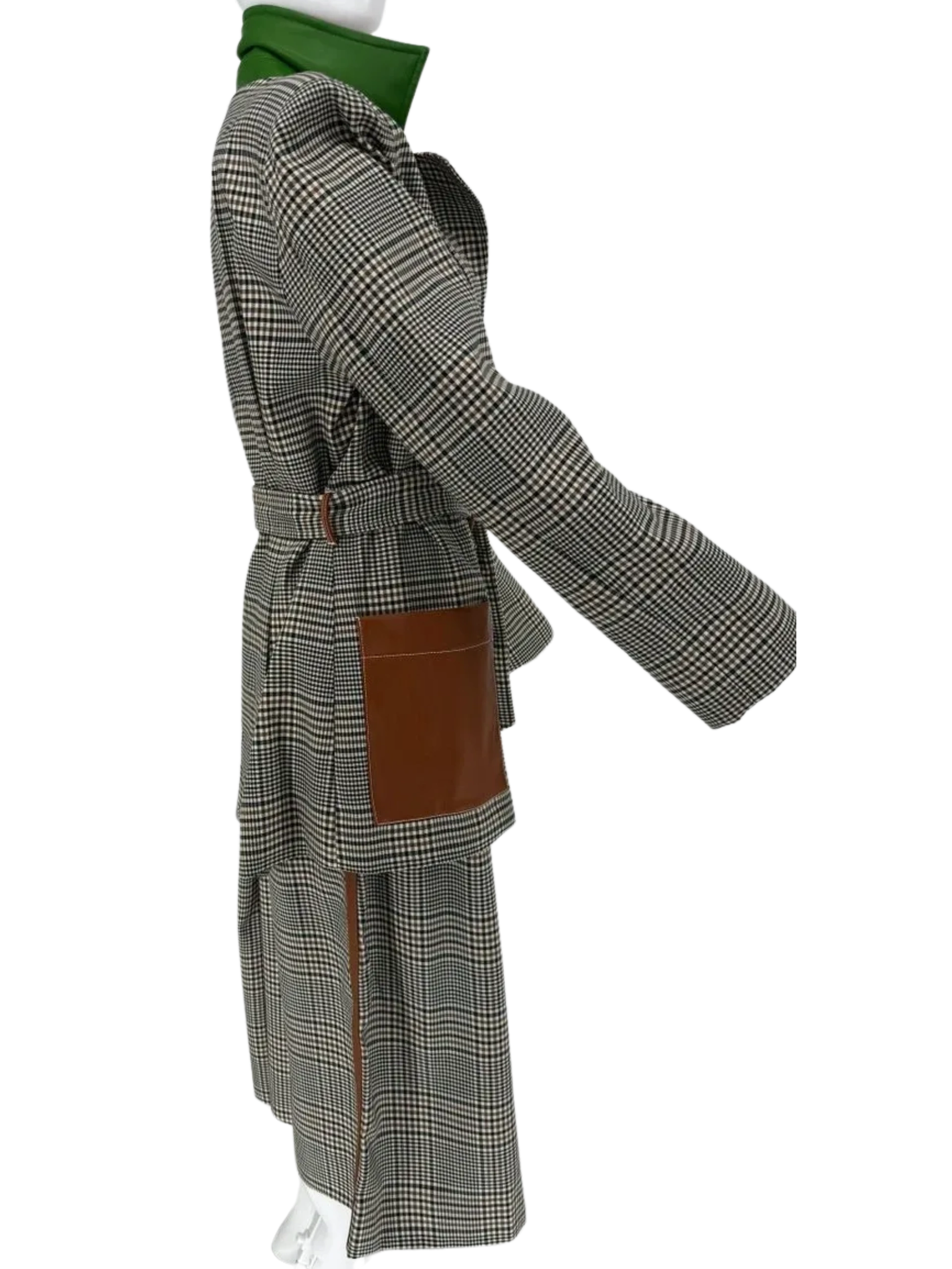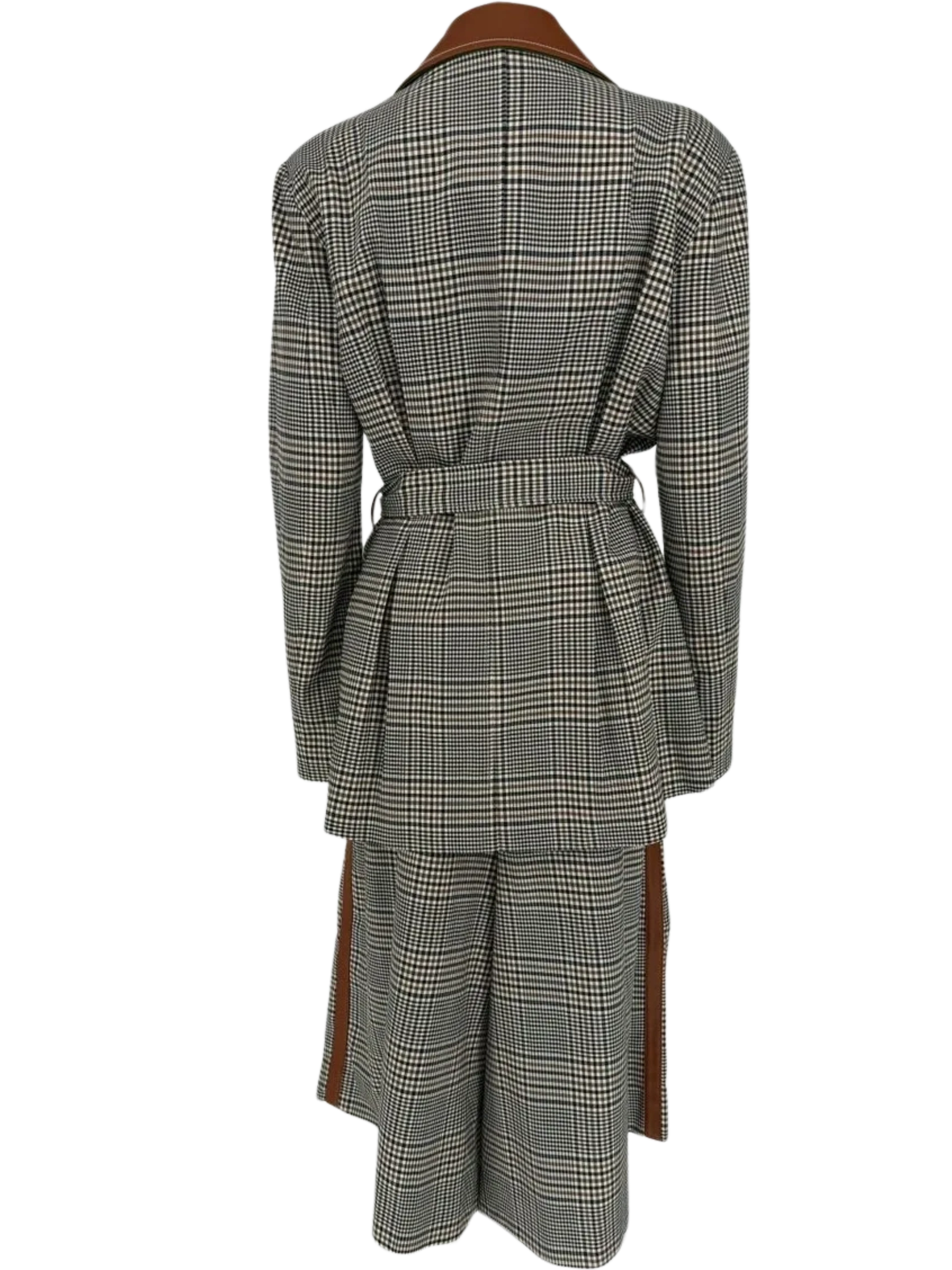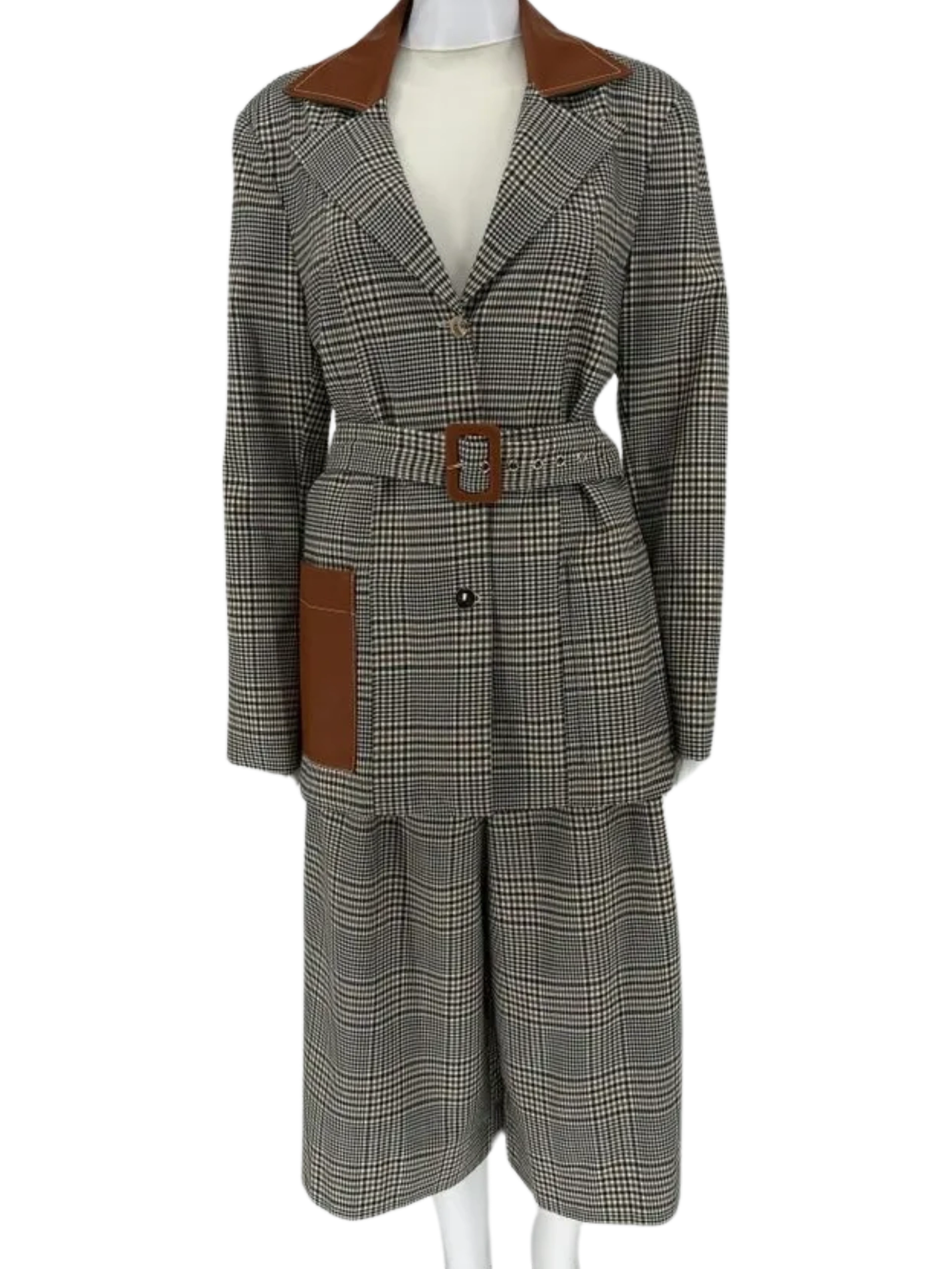 This Staud Paprika Belted Plaid Suit is cut in their plaid suiting for a nod to English tailoring. The blazer is cinched at the waist for a feminine take on this wardrobe hero. Two-tone notched lapels. Button front closures and cuffs. Belt loops. Hip patch pocket. Faux leather collar (Kelly Green Underneath), Faux leather pocket and trimmed belt. Lightly padded shoulders. The Crop Trousers have the faux leather panels down the side, belt loops and rear accent pocket. Both Pieces are in excellent condition. Fabric: 64% polyester, 34% viscose, 2% spandex Jacket Lining: 95% polyester, 5% elastane Jacket Size: Large Jacket Measurements: Bust/Chest: 20" Waist: 19" Front Length: 21" (V to bottom) Shoulder: 18" Back Length: 32" Sleeve Length: 25" Hip: 24" Trouser Size 10 Measurements: Hip: 25" Waist: 16" Rise: 14" Inseam: 18.5" Length: 32" Leg opening: 17"
