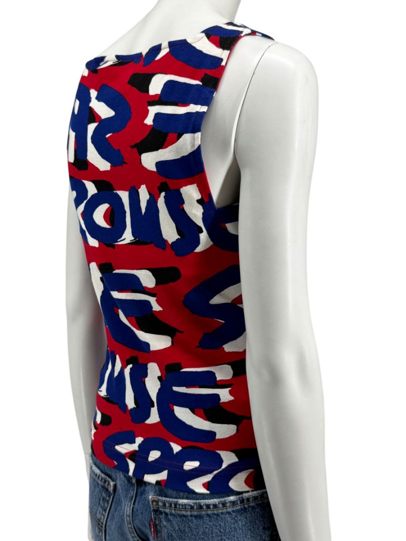 Iconic and boldly graphic, this Stephen Sprouse tank top showcases the designer’s signature pop-art aesthetic with oversized “Sprouse” lettering in vibrant red, cobalt blue, black, and white. Designed with wide straps and a flattering square neckline, this fitted silhouette features a lightly structured interior with built-in support for a smooth, confident shape. The cotton-blend fabric offers comfortable stretch while maintaining structure, making it perfect worn solo or layered under a blazer or denim jacket. A standout archival-inspired piece that captures Sprouse’s fearless downtown energy.