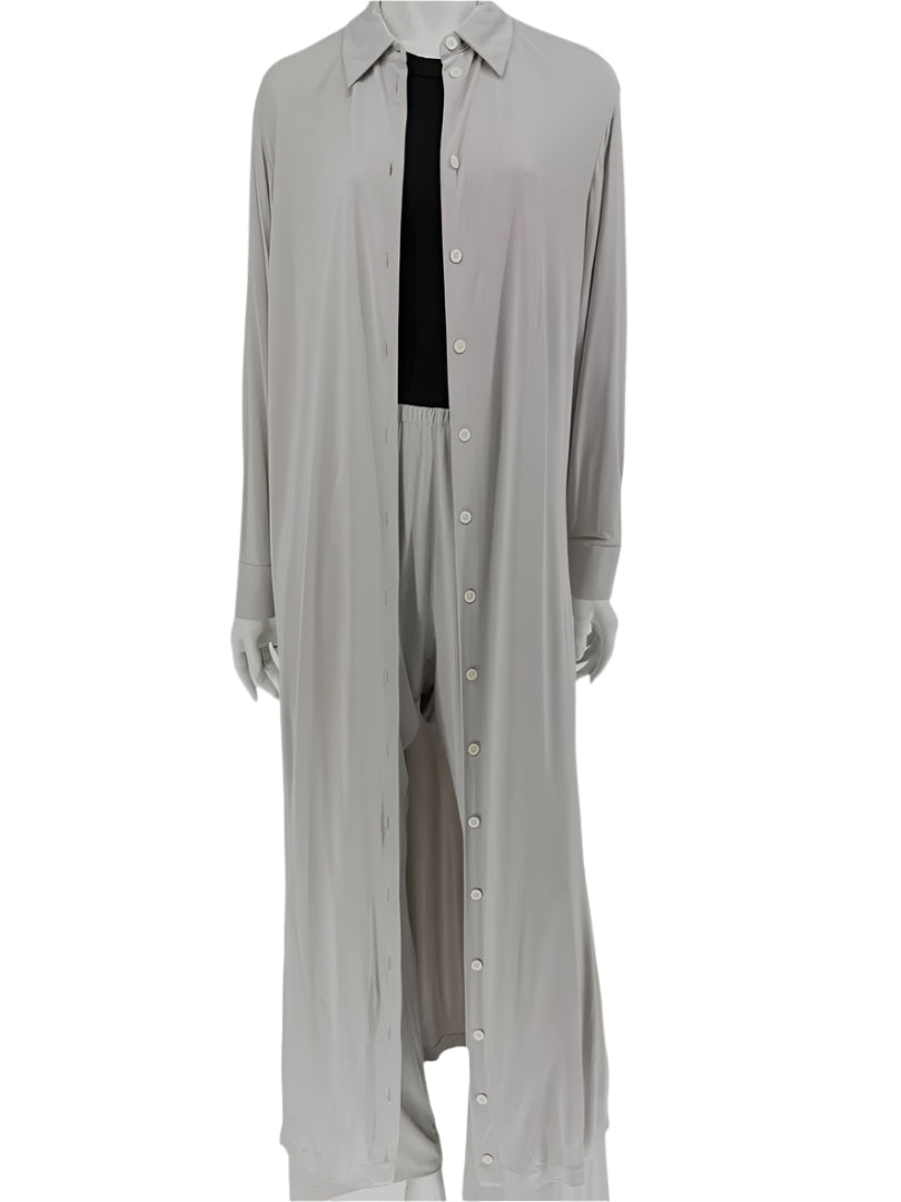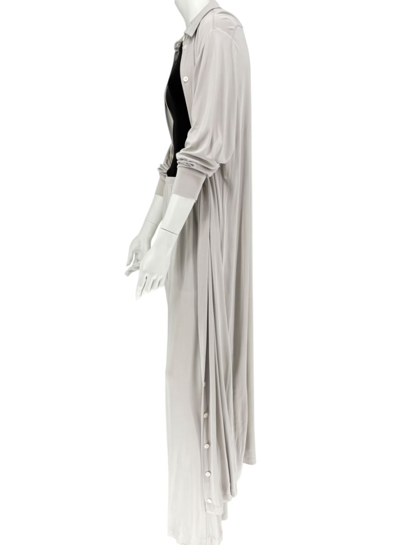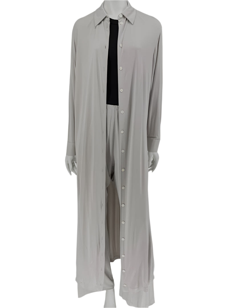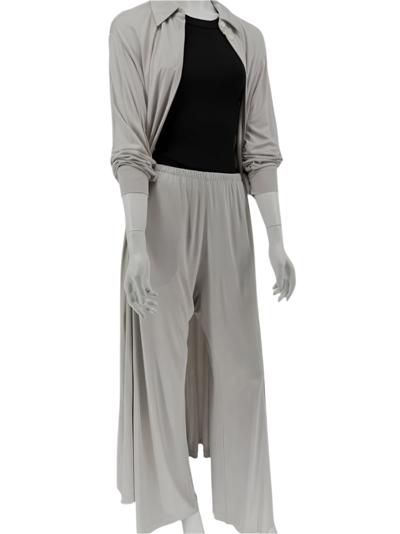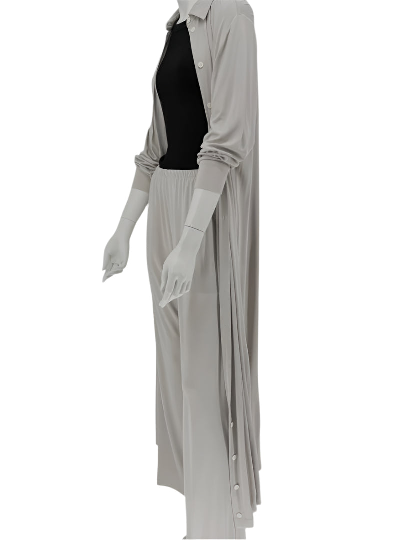 A minimalist's dream from The Row, this luxurious lounge set is crafted in Italy from soft, fluid 100% viscose with a 100% silk lining in the shirt. The set includes a longline button-front shirt with a classic collar and full sleeves, paired with wide-leg pull-on pants featuring an elastic waistband and hidden side pockets. The drape and tonal elegance of the light taupe hue make this an effortless staple for modern, refined dressing.