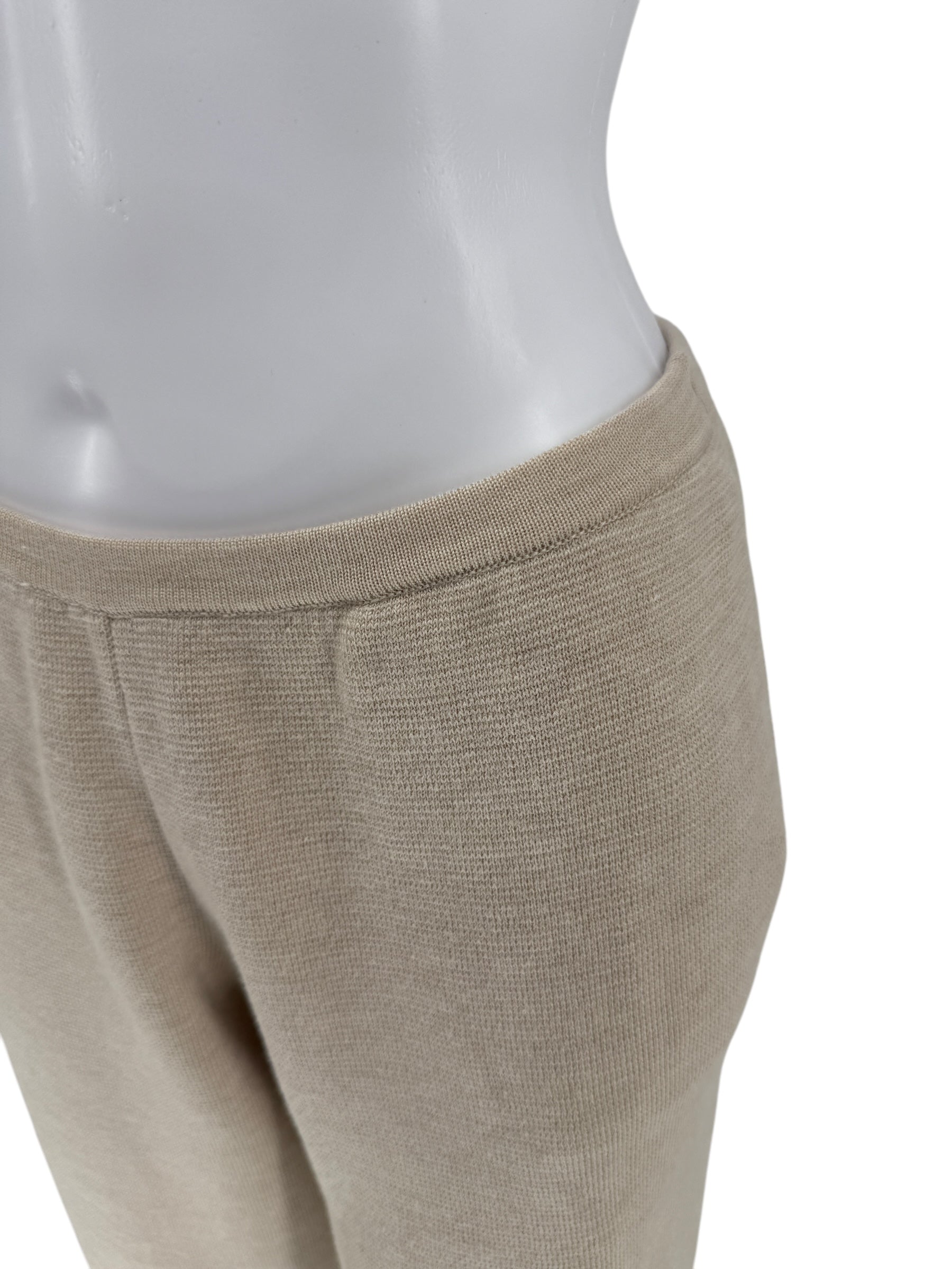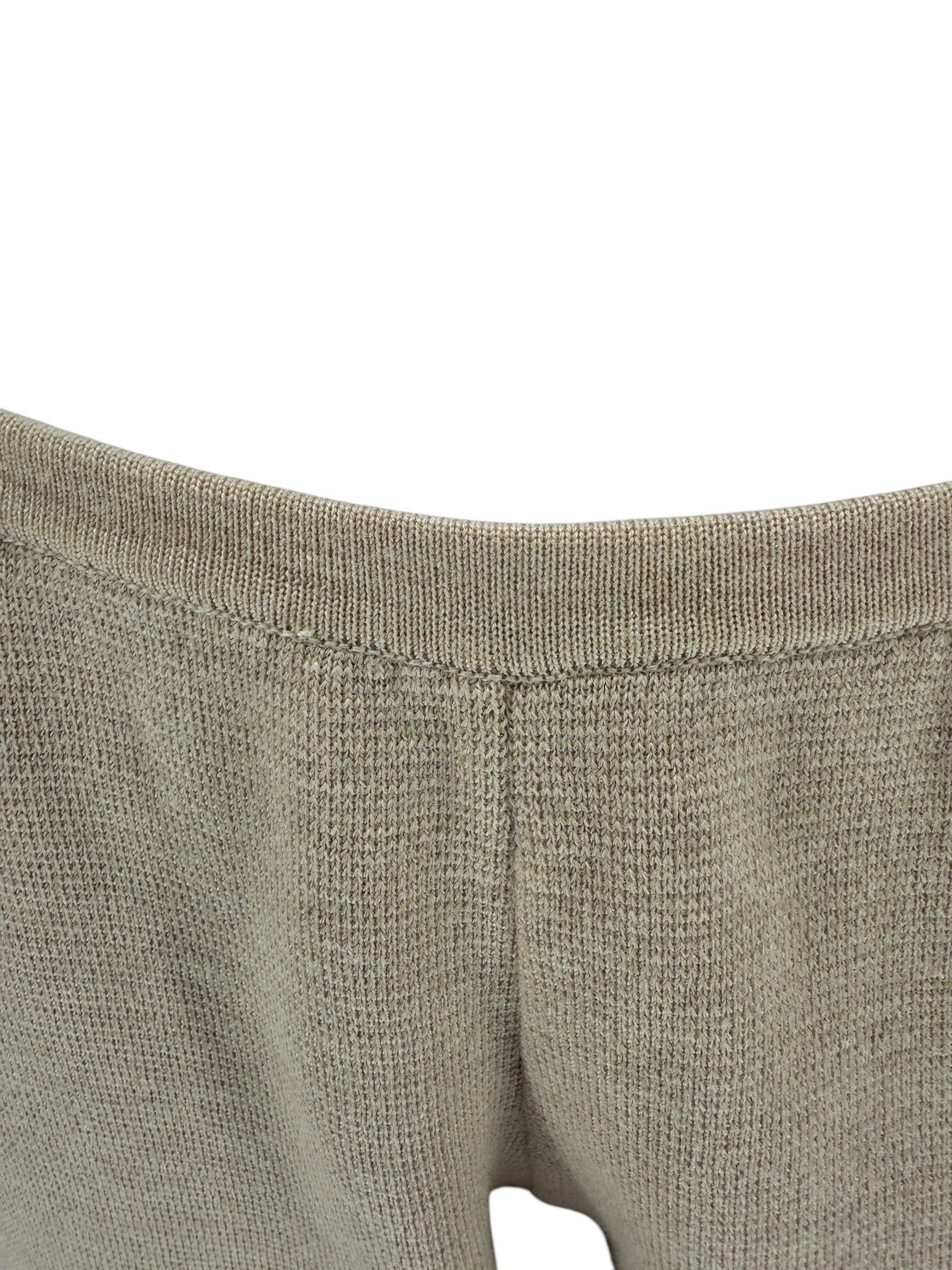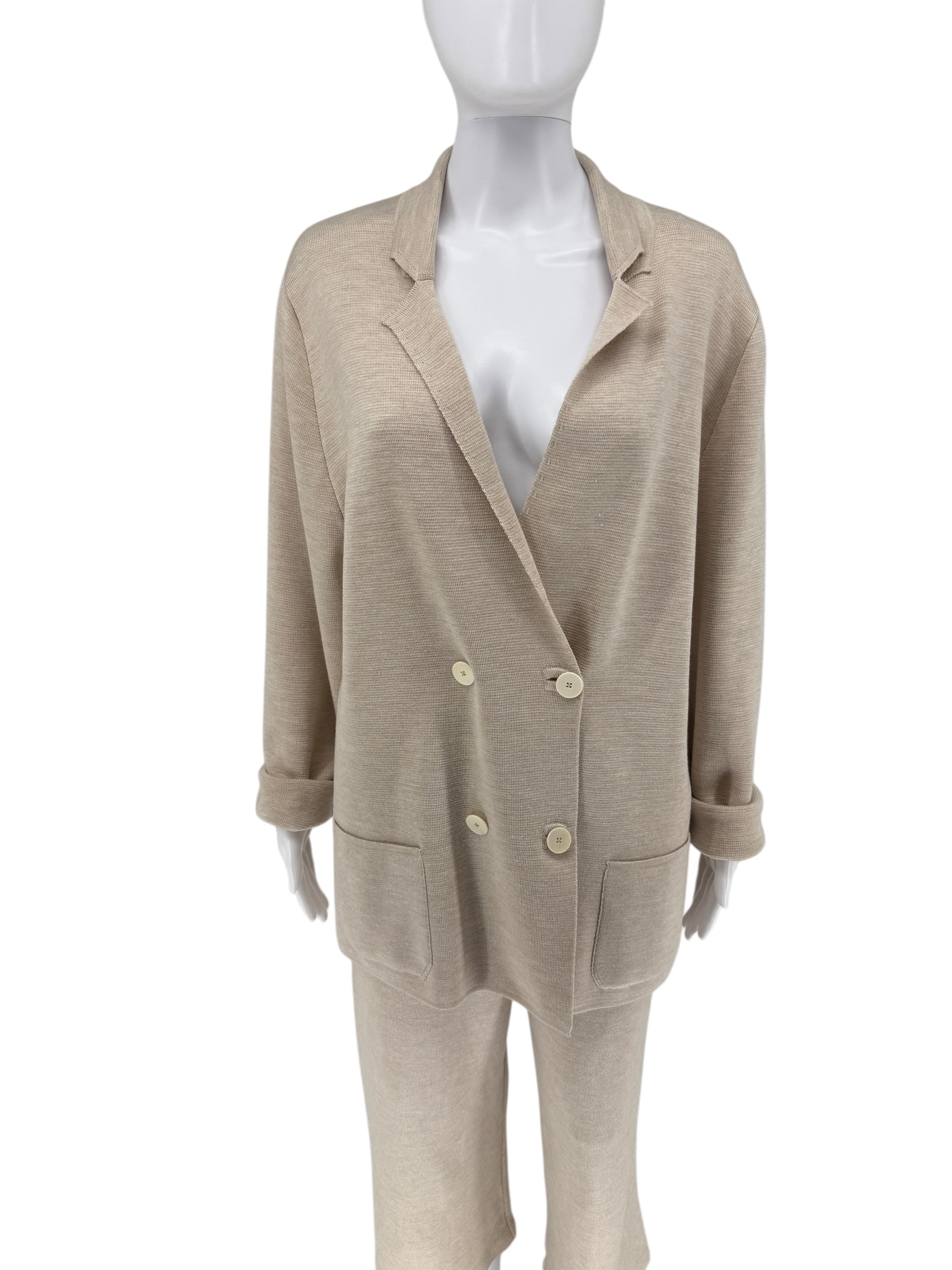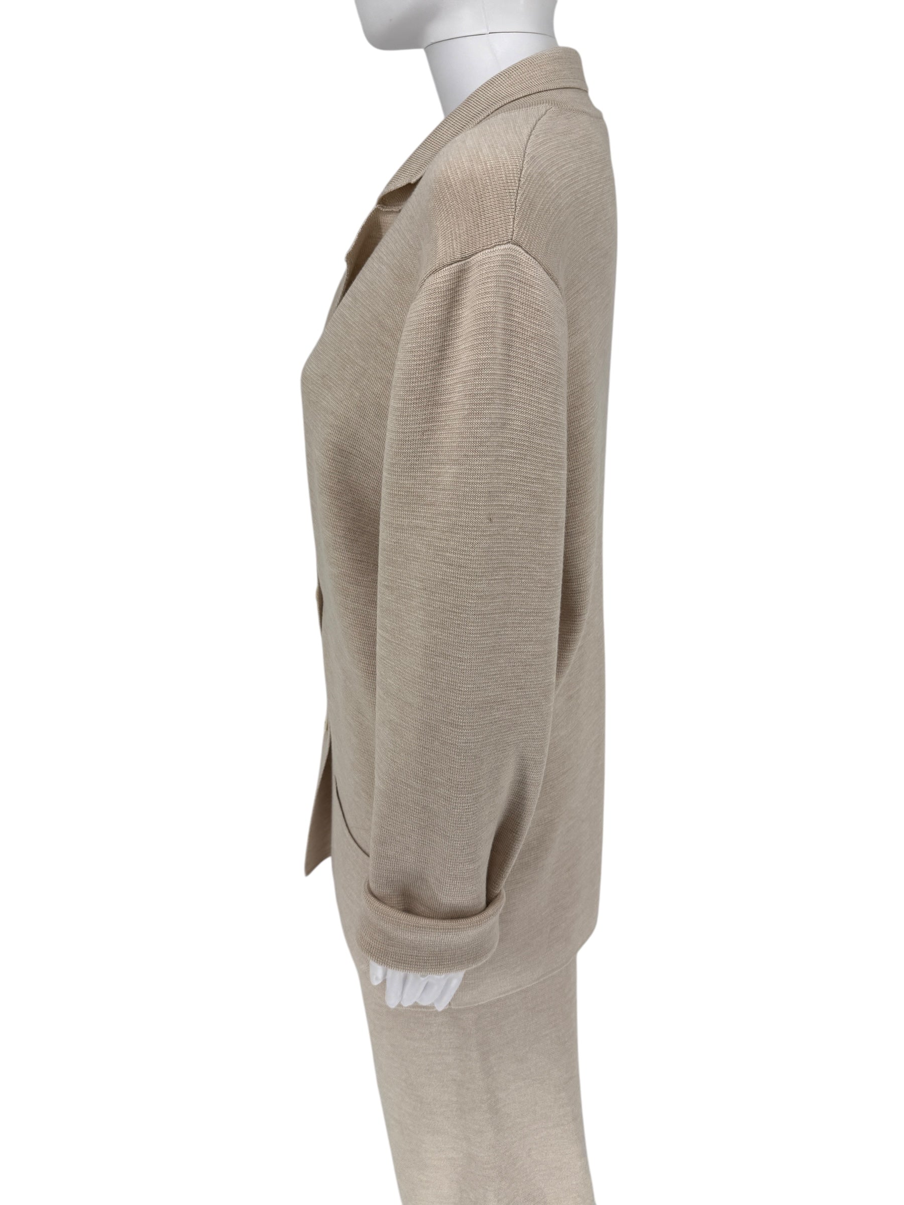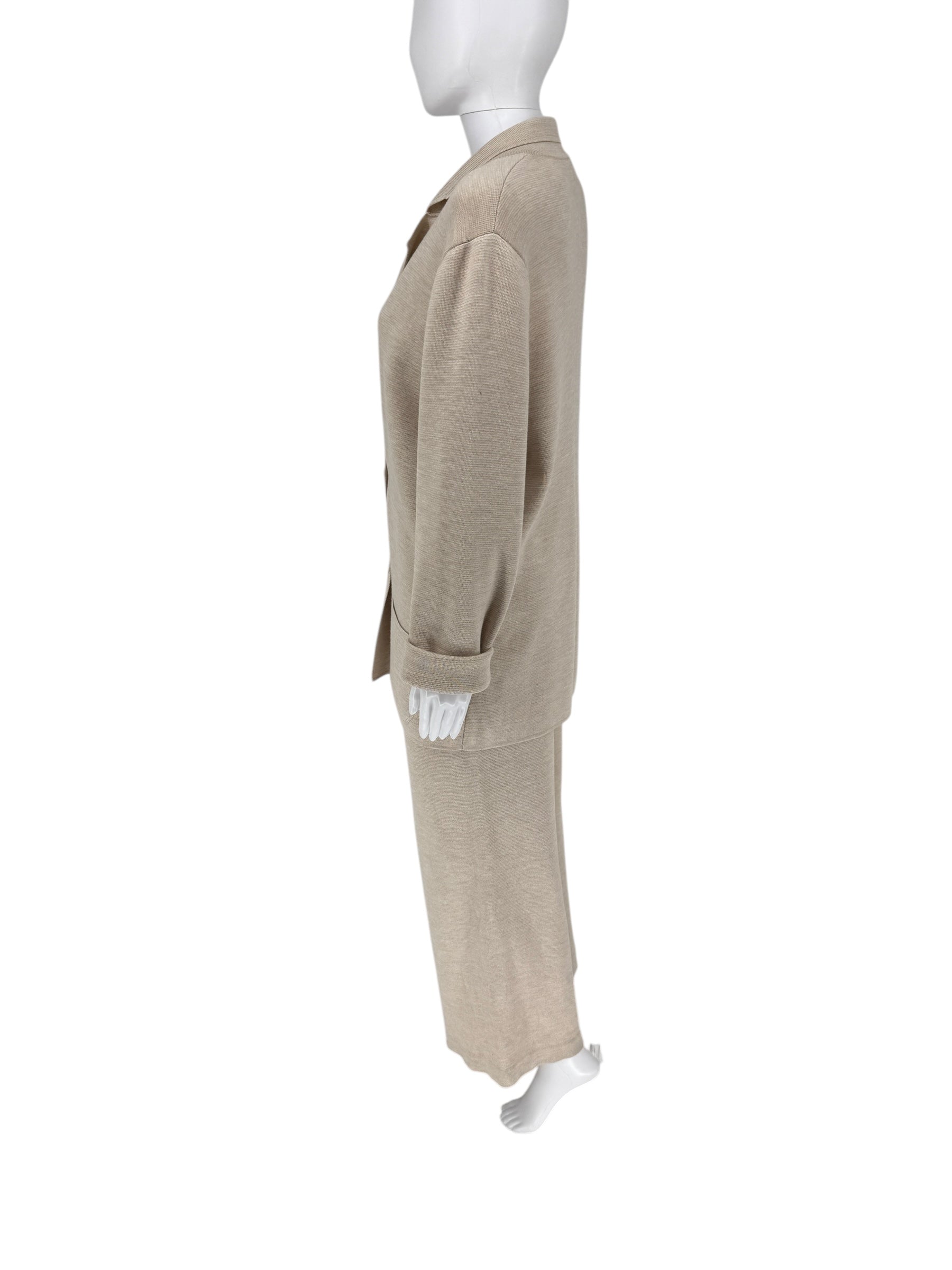 This Sophisticated and lightweight knit suit by The Row knitted suit in Beige Melange is mad of a wool/silk blend. The "Chopok" jacket is in Small and the Co ordinating pants in Medium.