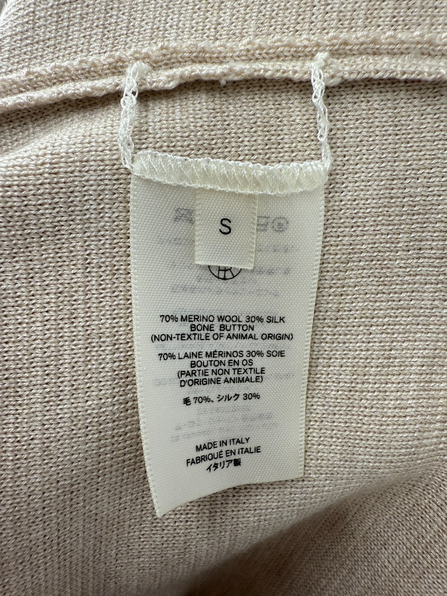 The jacket has a Notched lapel, Long sleeves, Double breasted button closure, Wool/silk, Dry clean and is Made in Italy.