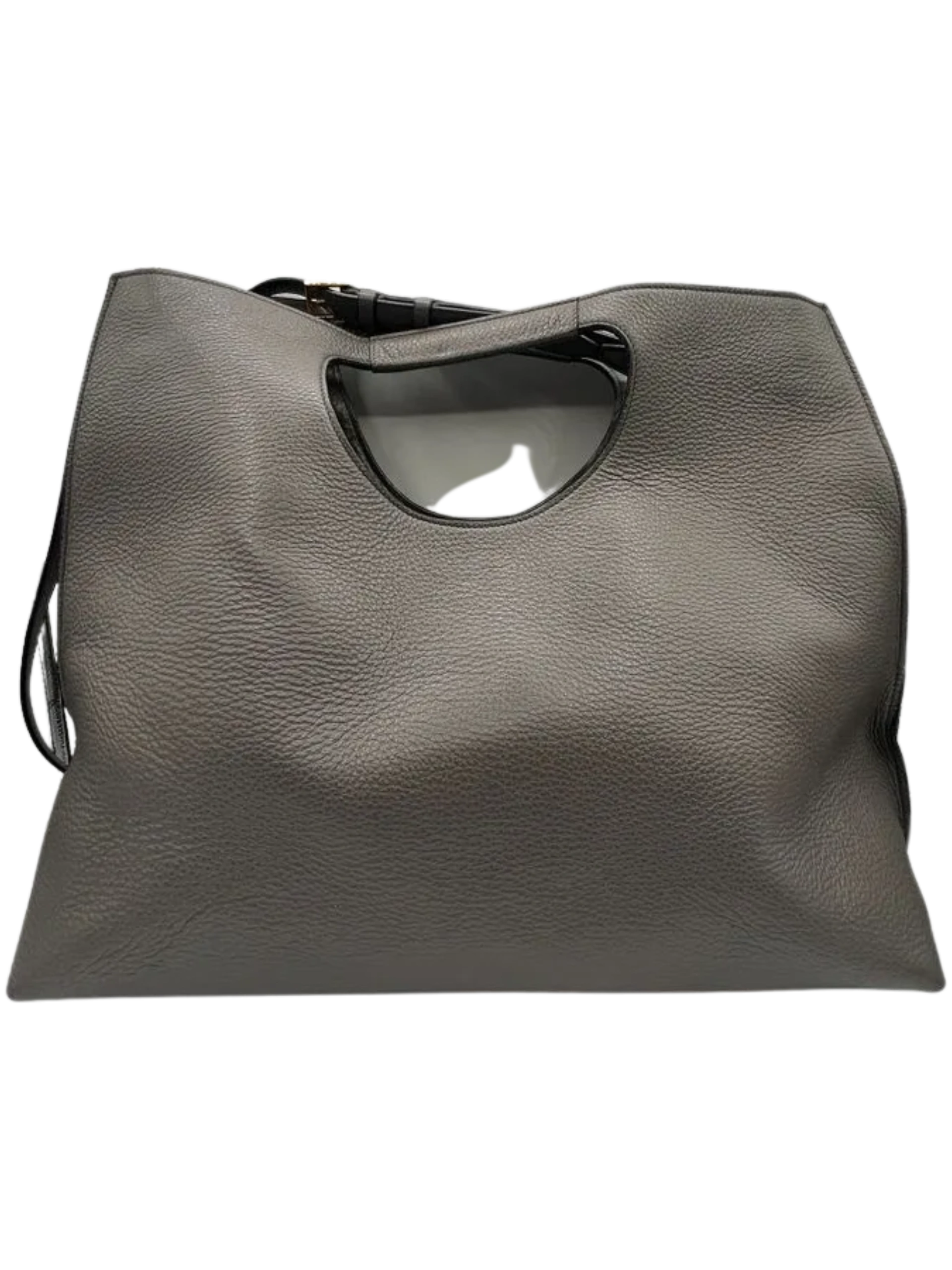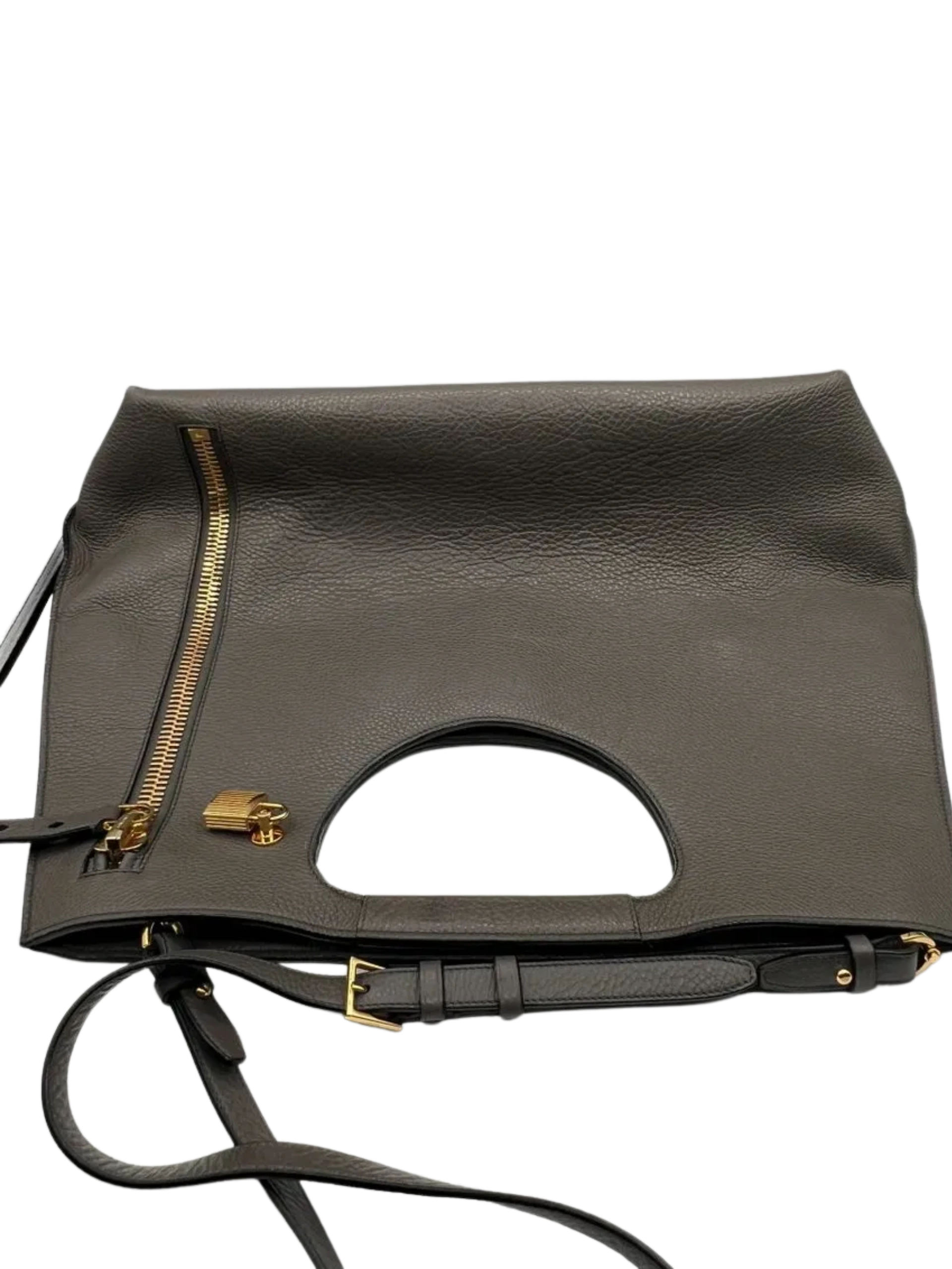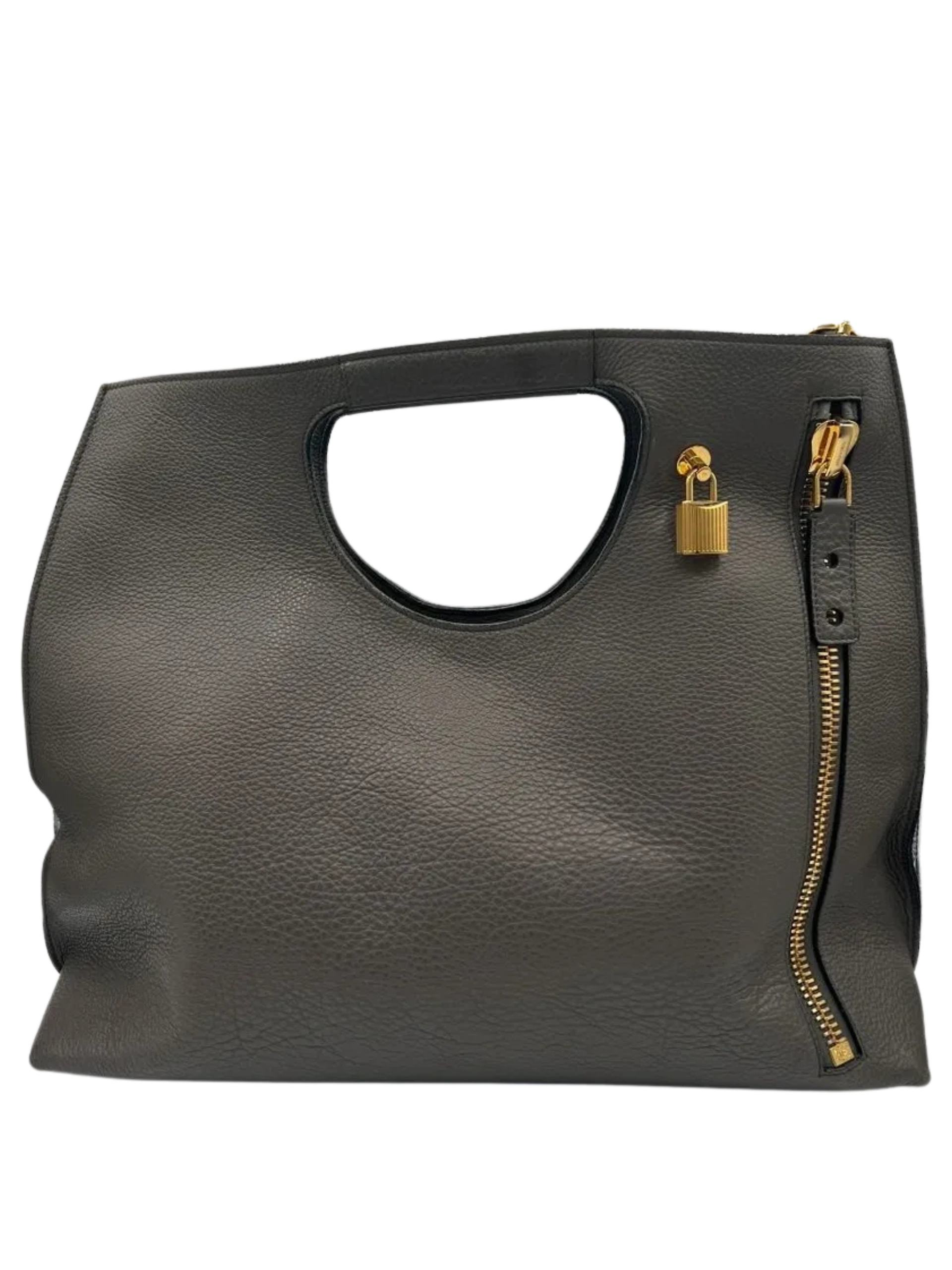 Grained Calfskin Alix Padlock Zip Tote in Graphite, This hand bag is crafted of textured calfskin leather gray. This bag features an oversized gold zipper down the front side. The bag can be folded over or unfolded to be carried by the cut-a-way handles. The top is open to a black microsuede interior with a zipper pocket and an optional shoulder strap. Closure is a magnetic snap. This bag can be worn numerous ways including crossbody for walking in the city. Very Good Condition, Light wear at exterior corners, light creasing and surface wear. Details: weight 1lb. approximately and Made in Italy. Hardware: No key for lock/No Clochette Size: Height: 16" in Drop: 17.50 in to 19.25 in Handle Drop: 3.25 in Width at bottom: 18" Width at top 16.5" Depth 7" 49" long adjustable shoulder strap