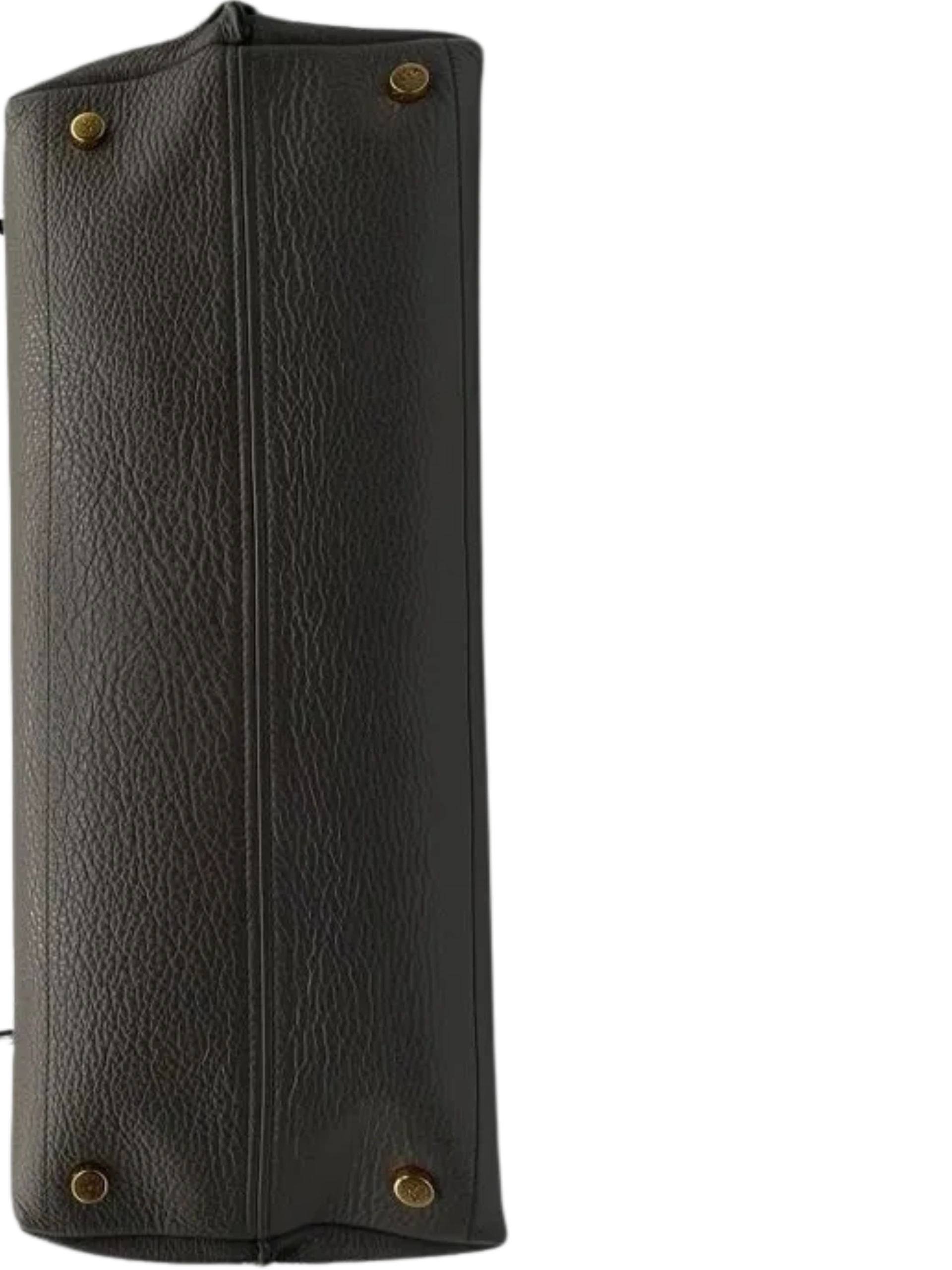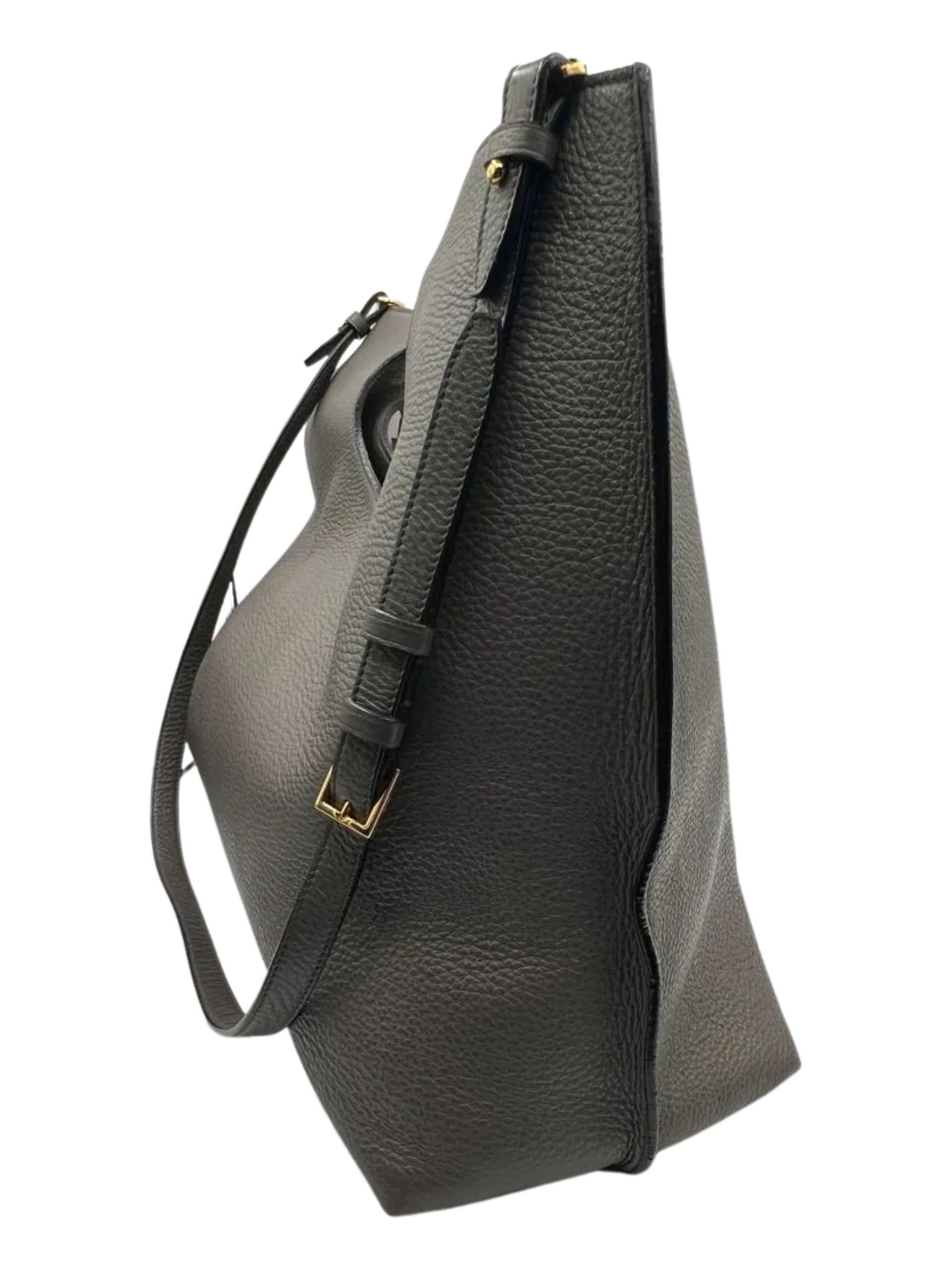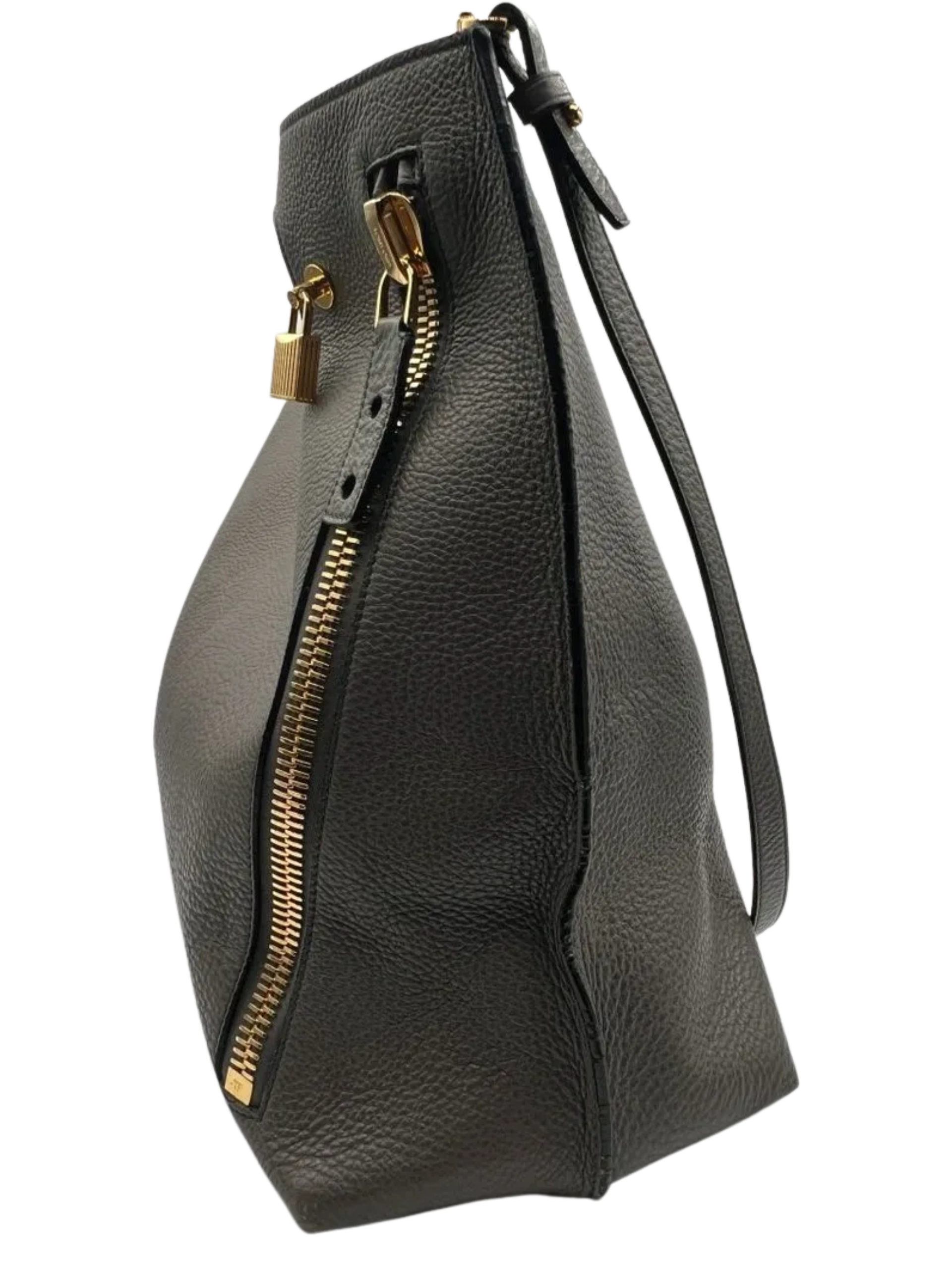 Grained Calfskin Alix Padlock Zip Tote in Graphite, This hand bag is crafted of textured calfskin leather gray. This bag features an oversized gold zipper down the front side. The bag can be folded over or unfolded to be carried by the cut-a-way handles. The top is open to a black microsuede interior with a zipper pocket and an optional shoulder strap. Closure is a magnetic snap. This bag can be worn numerous ways including crossbody for walking in the city. Very Good Condition, Light wear at exterior corners, light creasing and surface wear. Details: weight 1lb. approximately and Made in Italy. Hardware: No key for lock/No Clochette Size: Height: 16" in Drop: 17.50 in to 19.25 in Handle Drop: 3.25 in Width at bottom: 18" Width at top 16.5" Depth 7" 49" long adjustable shoulder strap