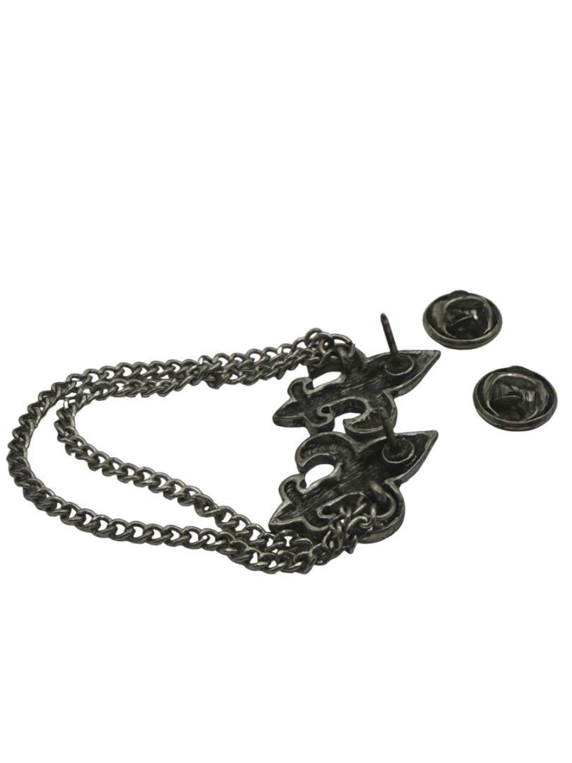 A refined antiqued silver-tone sweater guard featuring two ornate fleur de lis motifs connected by a double curb-link chain. Each decorative pin measures approximately 1" x .75" and showcases intricate scroll detailing with dimensional texture, giving the piece a rich, vintage-inspired character.