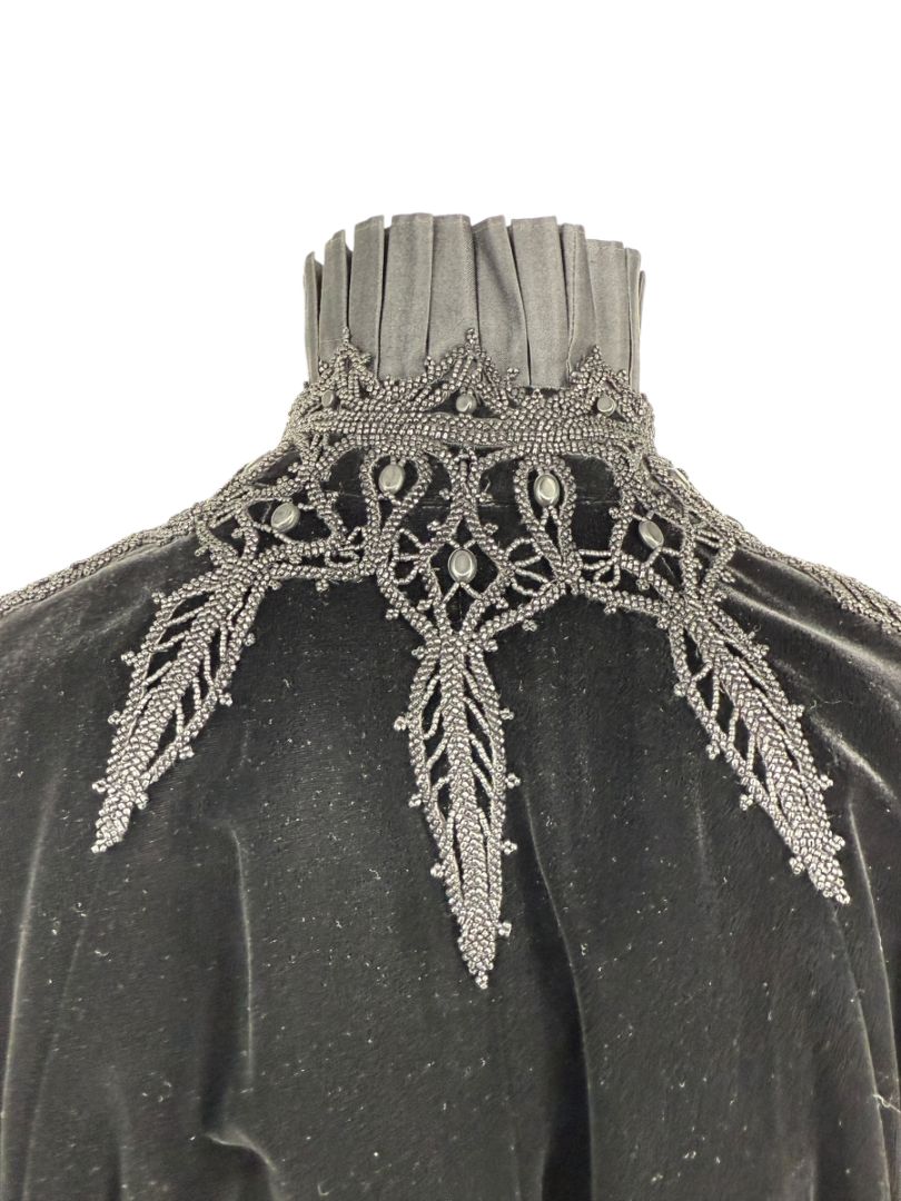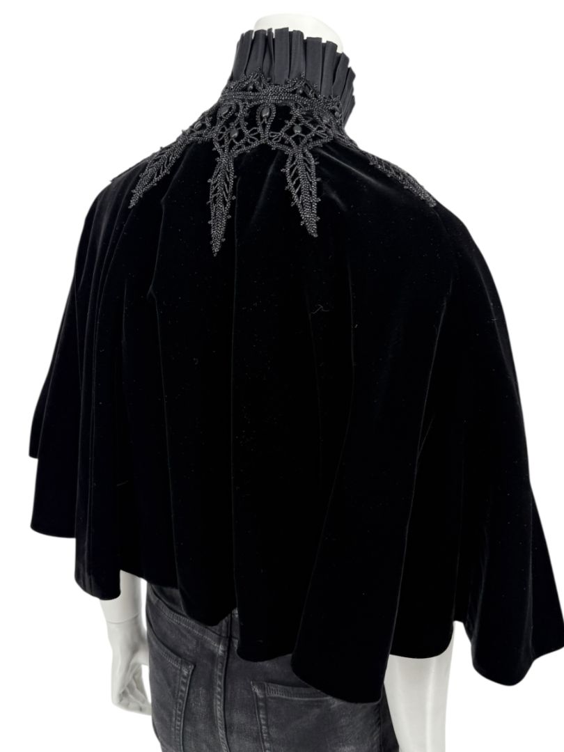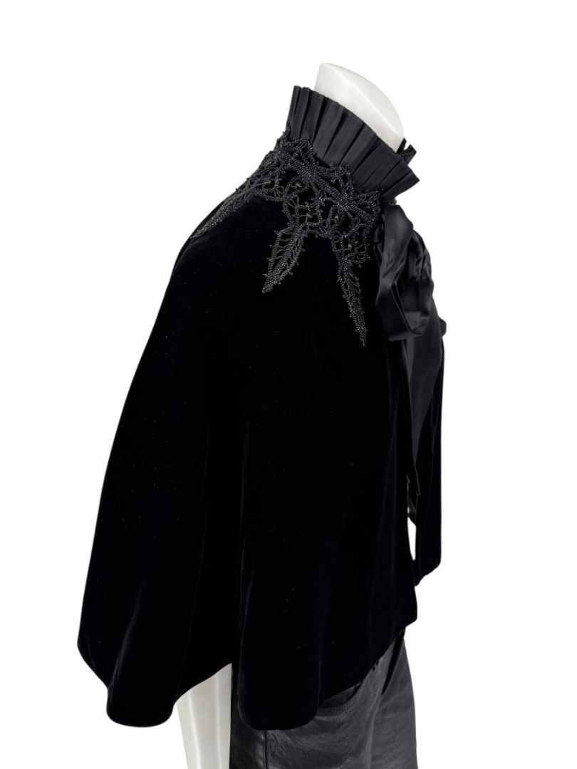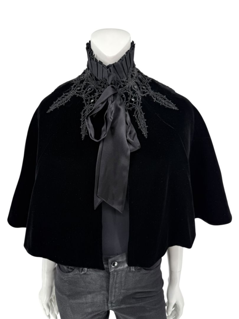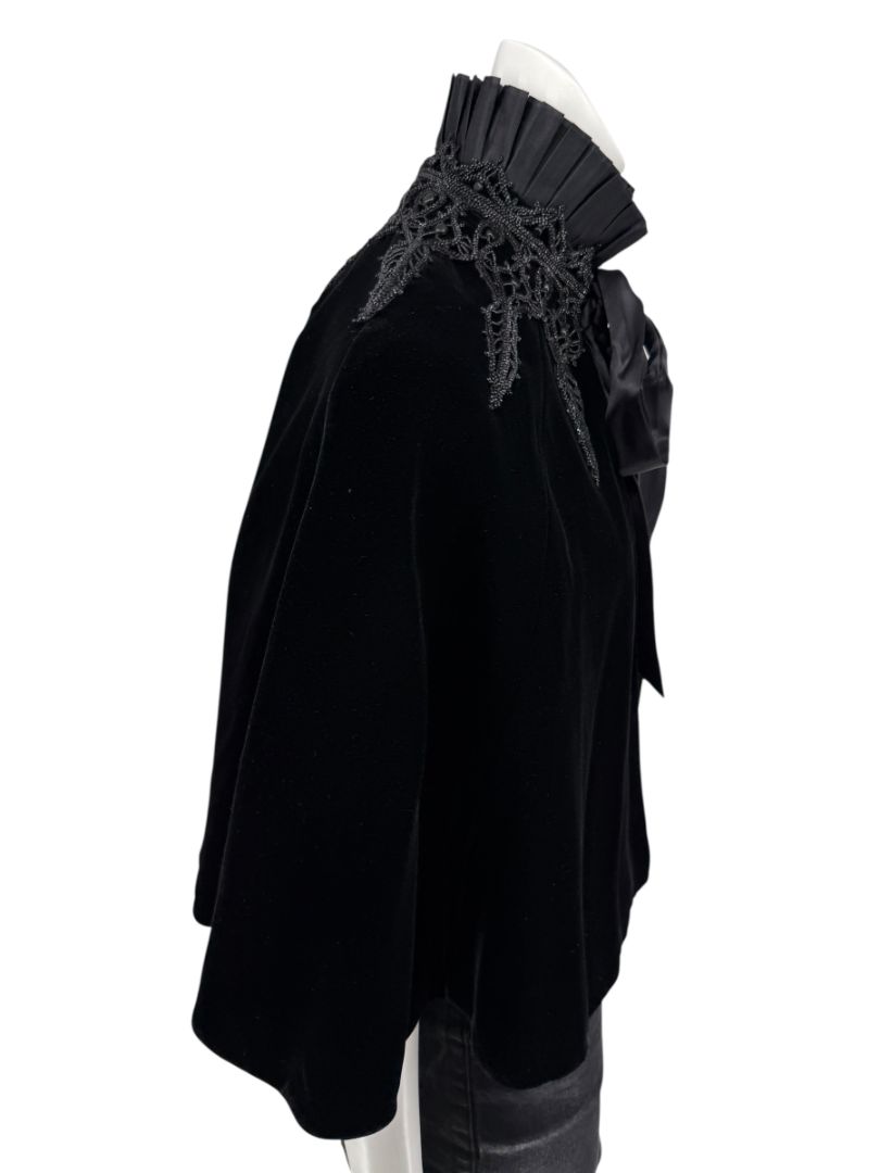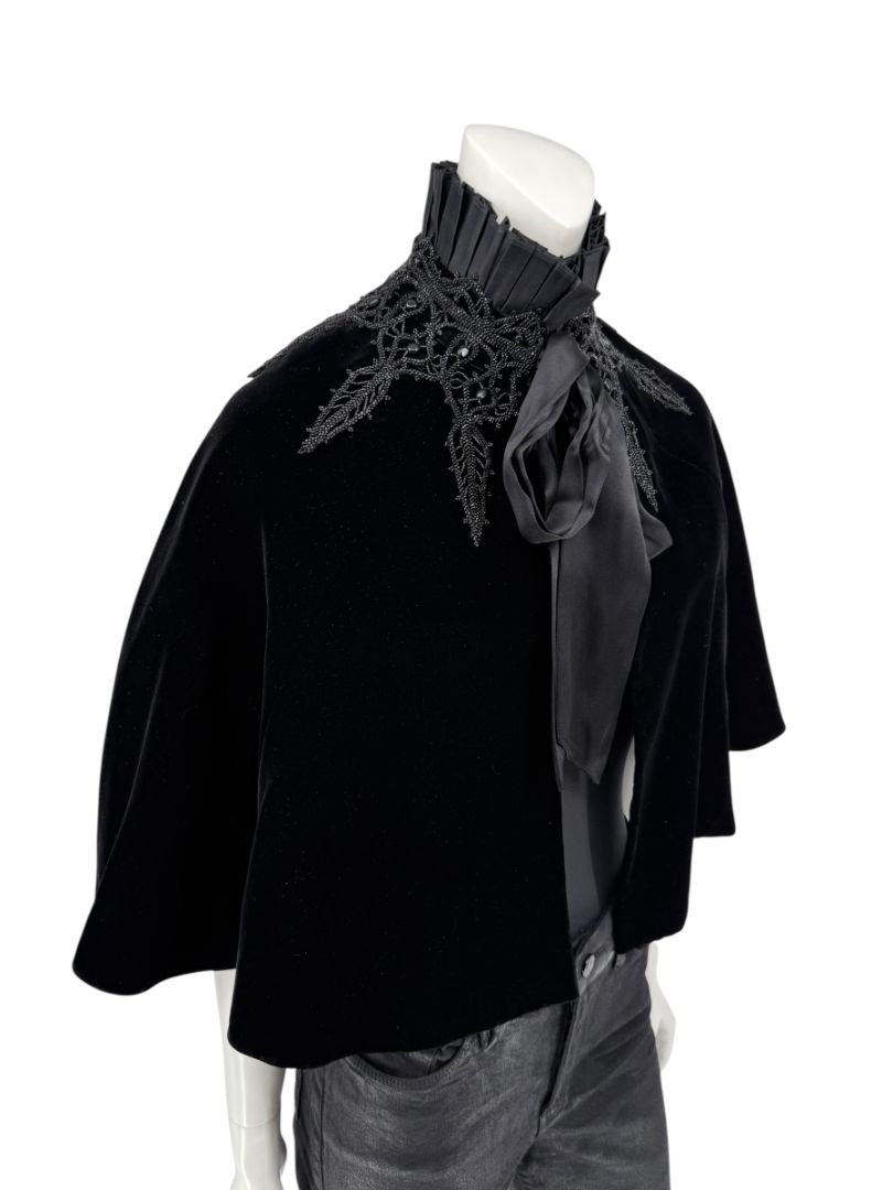 This exquisite Ralph Lauren cape blends Gothic romance with couture craftsmanship. The body is crafted from deep black velvet that drapes in soft folds, while the dramatic high collar features pleated silk and intricate bead-embroidered lace appliqué. A cascading silk tie at the neck completes the design, adding subtle shine and movement. Luxuriously constructed in Hong Kong, this piece is an elegant statement for evening wear or formal occasions.